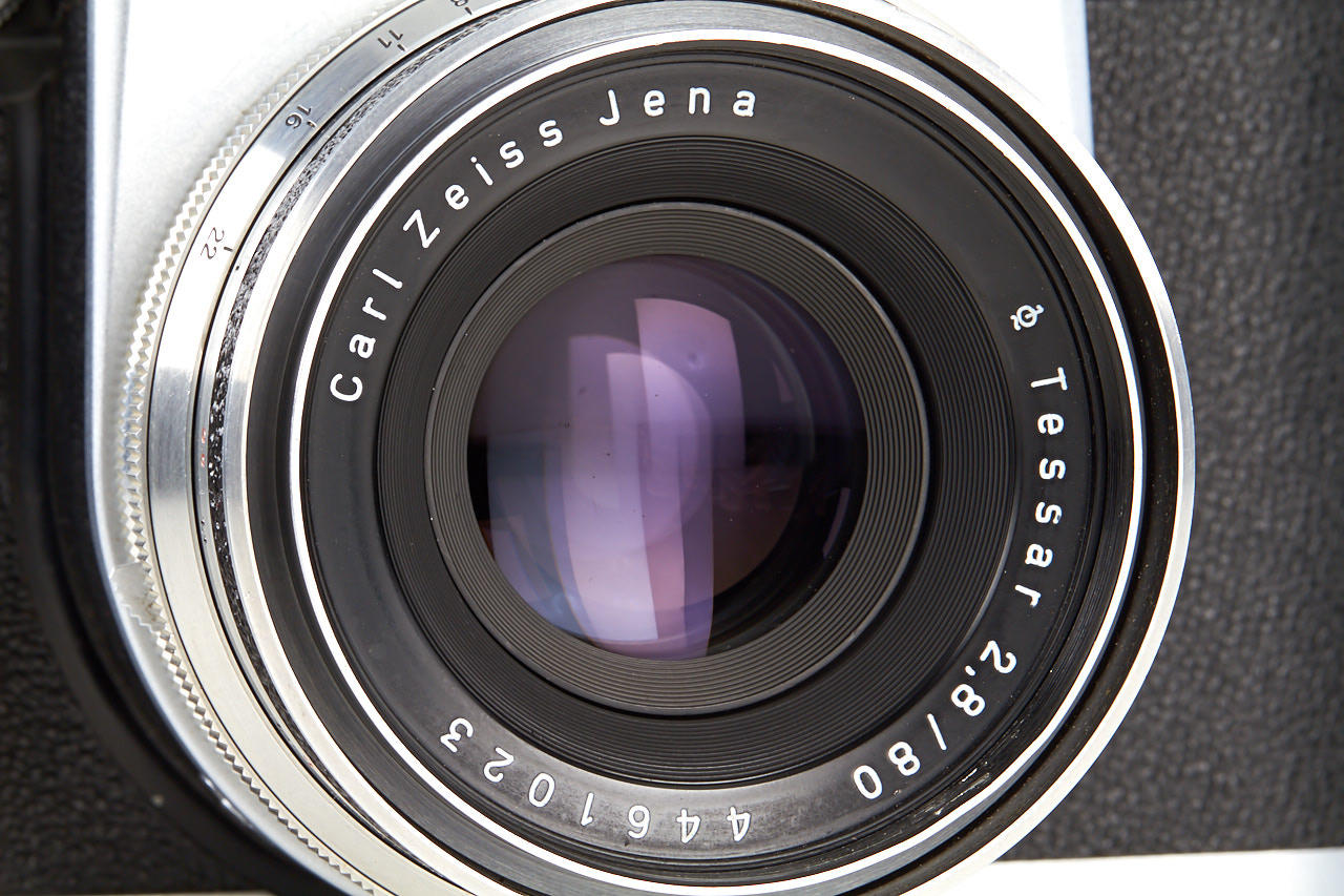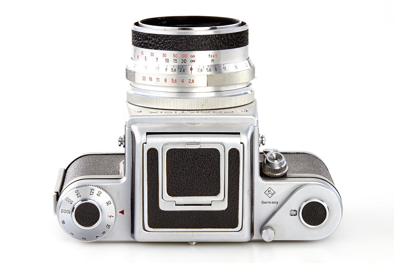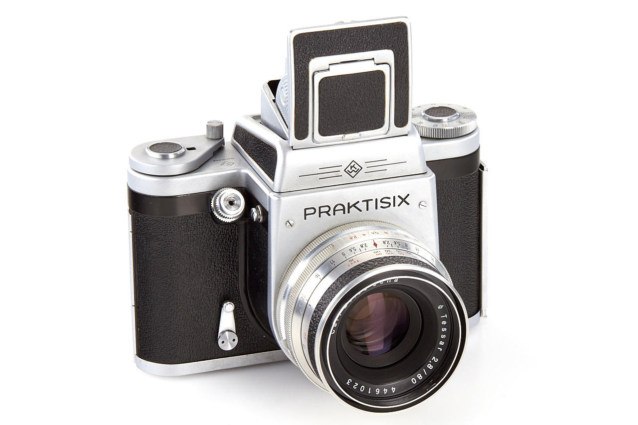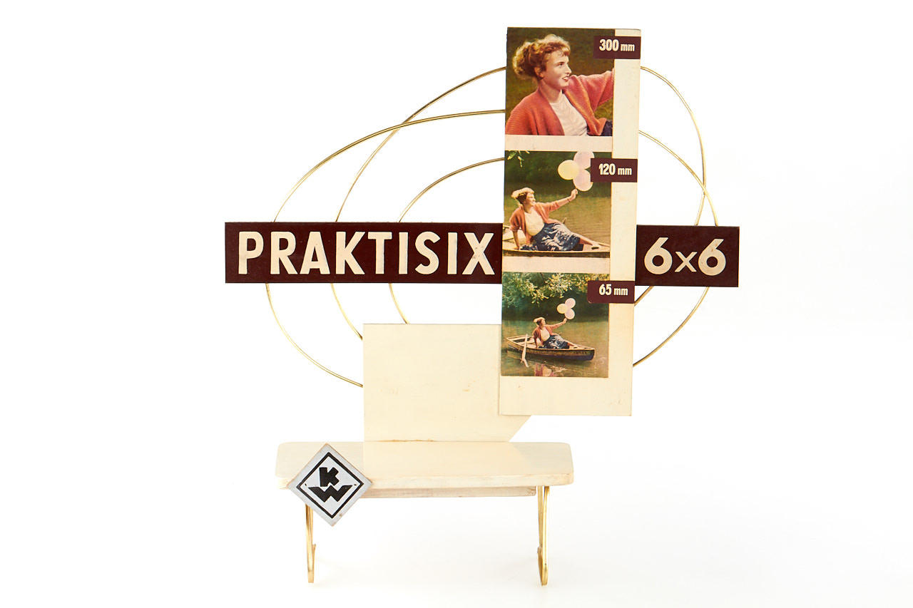 very rare Praktisix display stand in excellent condition, inclusive near mint Praktisix camera with Tessar 2.8/80mm no.4461023 (everready case, lens cap, prism finder)