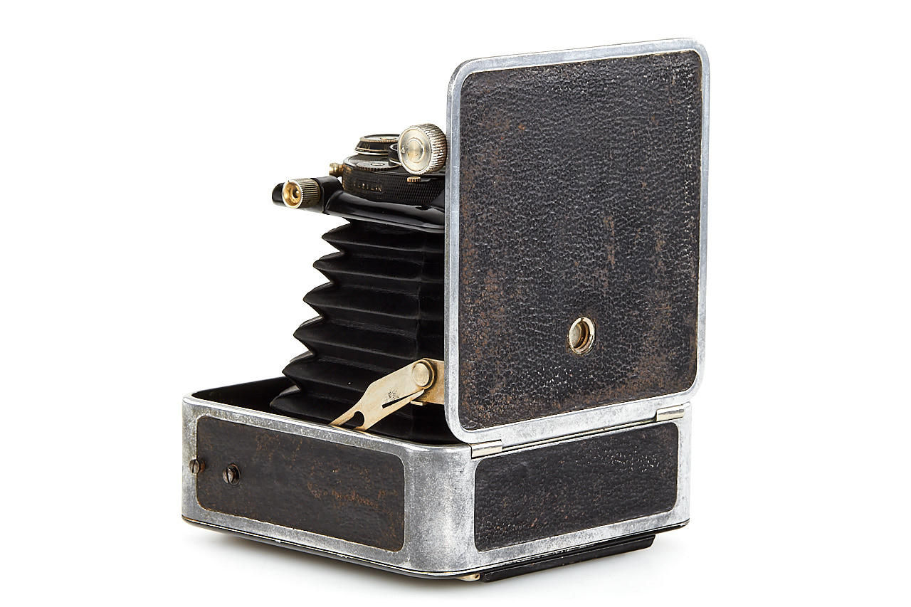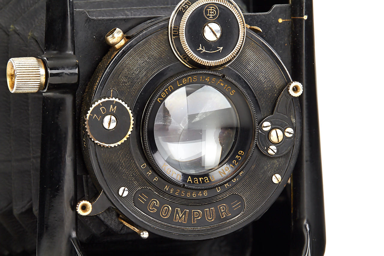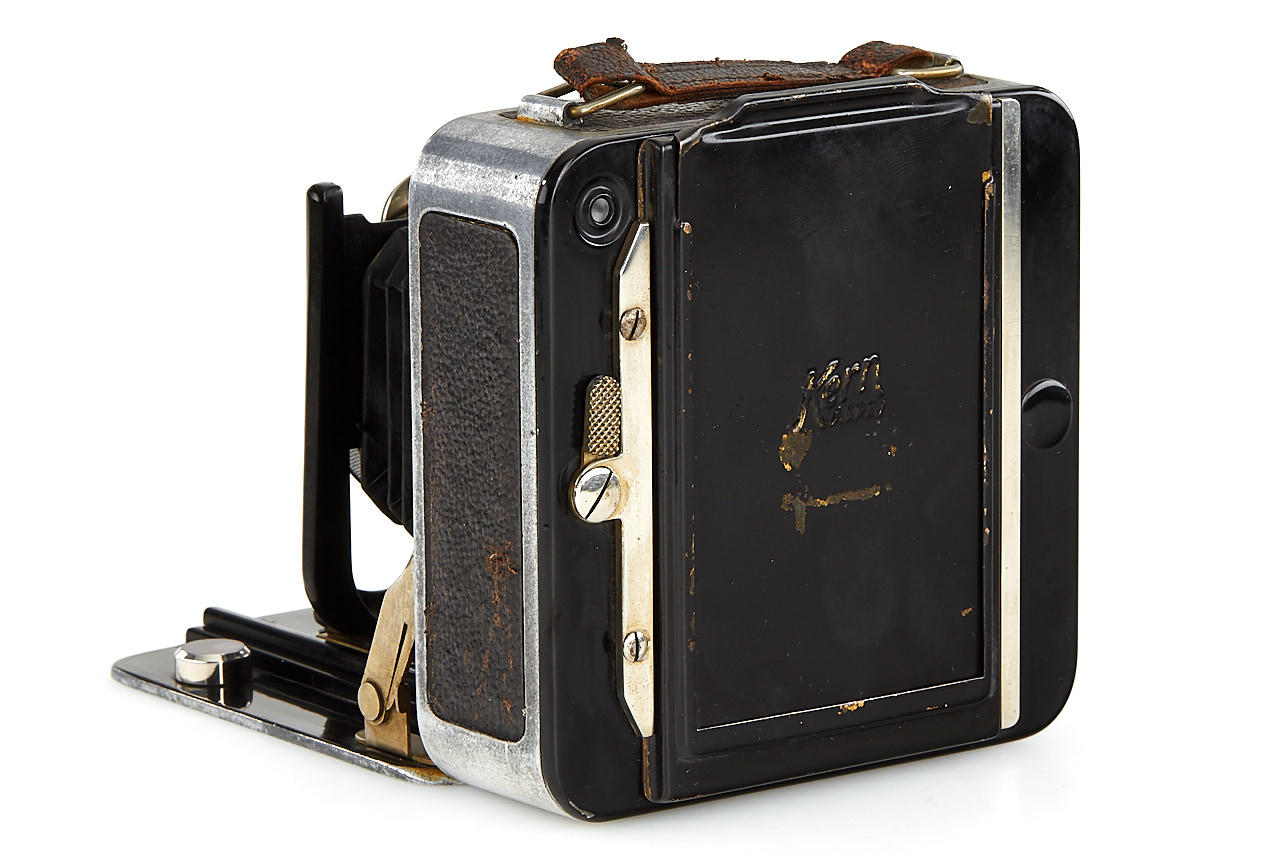 rare folding-bed camera with square aluminium body, rotating back for portrait and landscape photos, in fine condition, with Kern Lens 4.5/105mm no.1239, original film holder