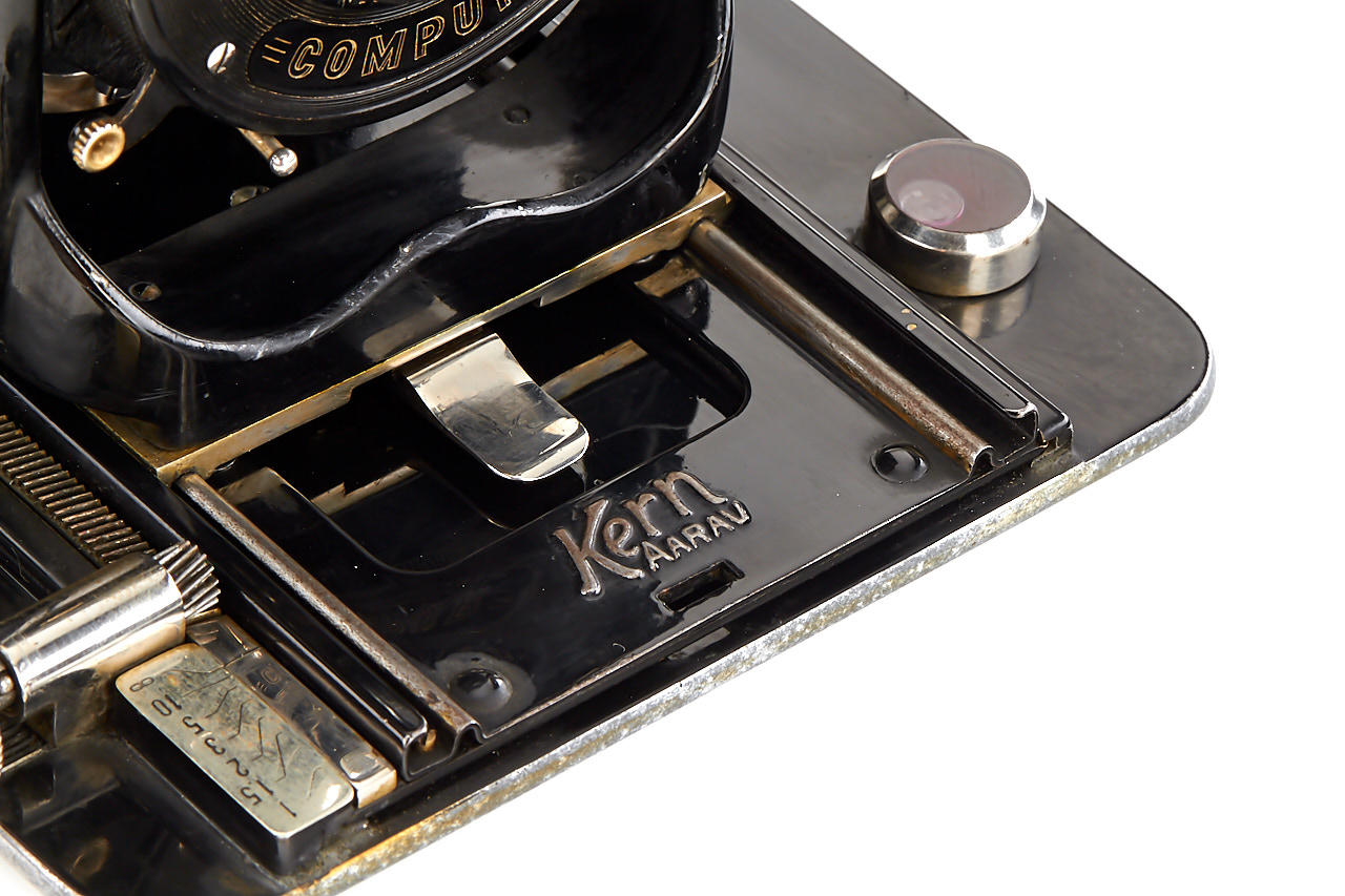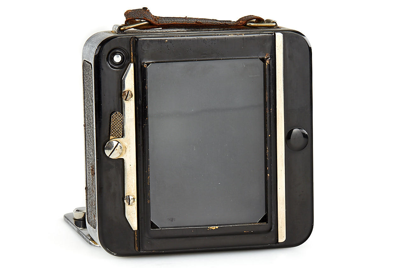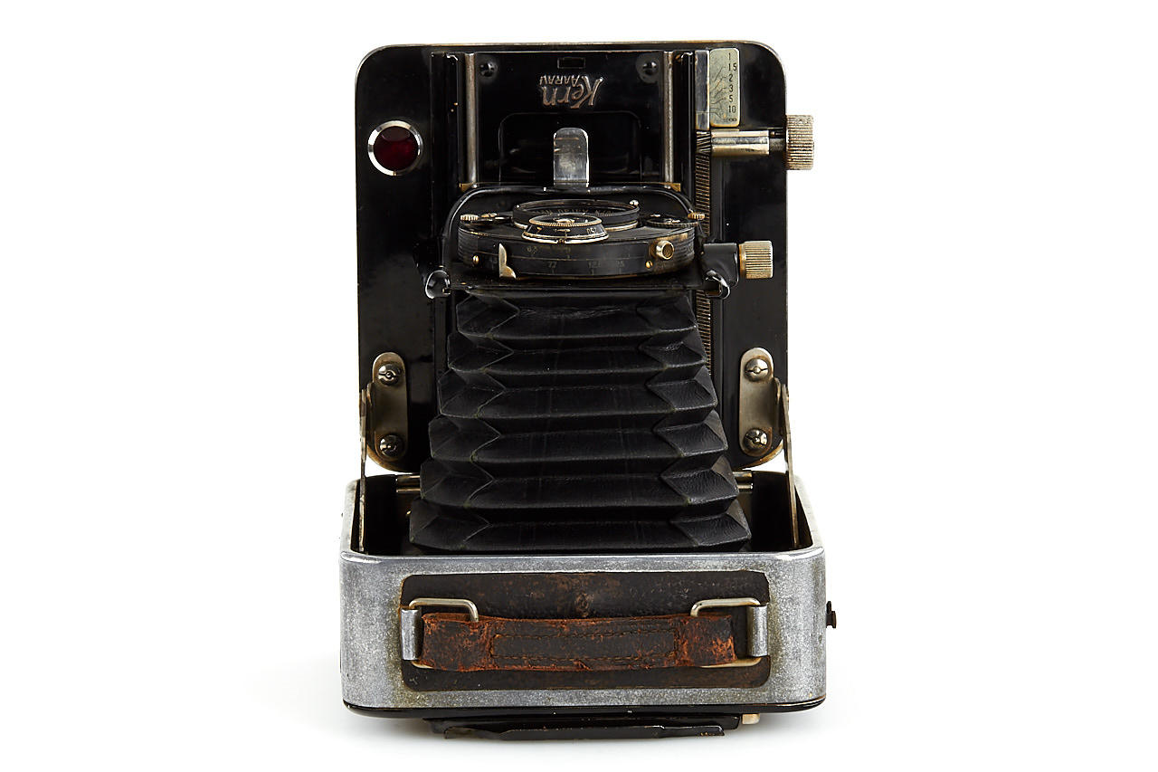rare folding-bed camera with square aluminium body, rotating back for portrait and landscape photos, in fine condition, with Kern Lens 4.5/105mm no.1239, original film holder
