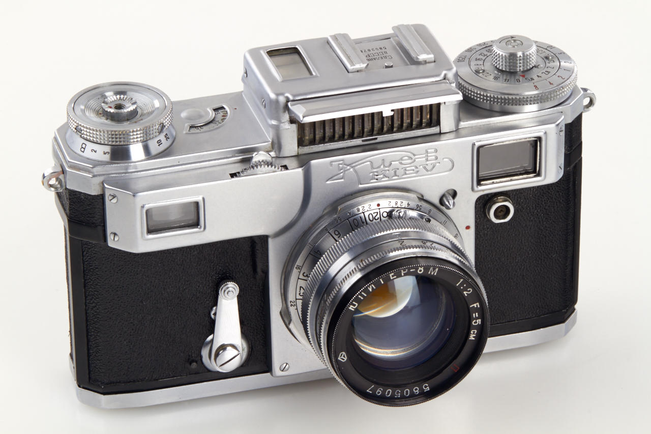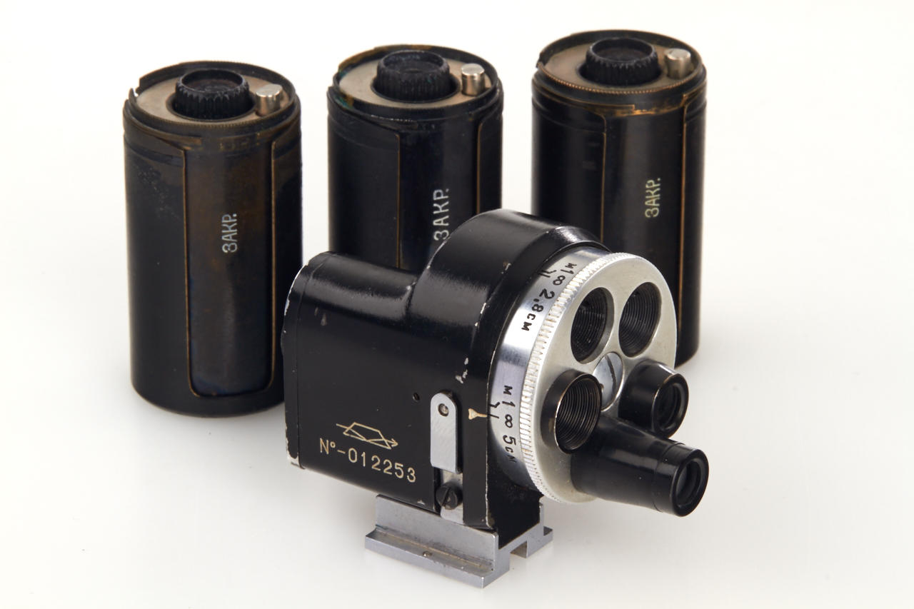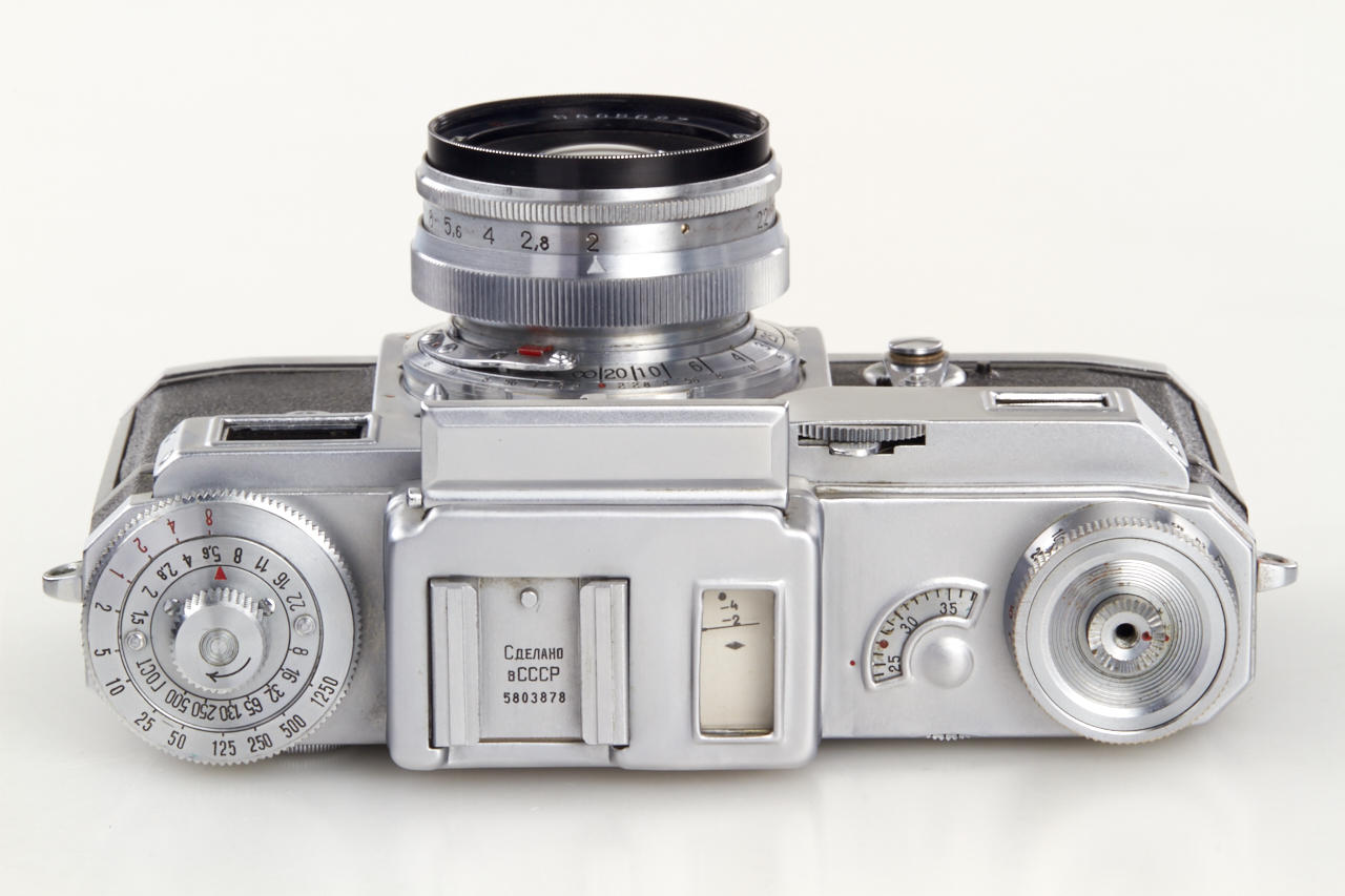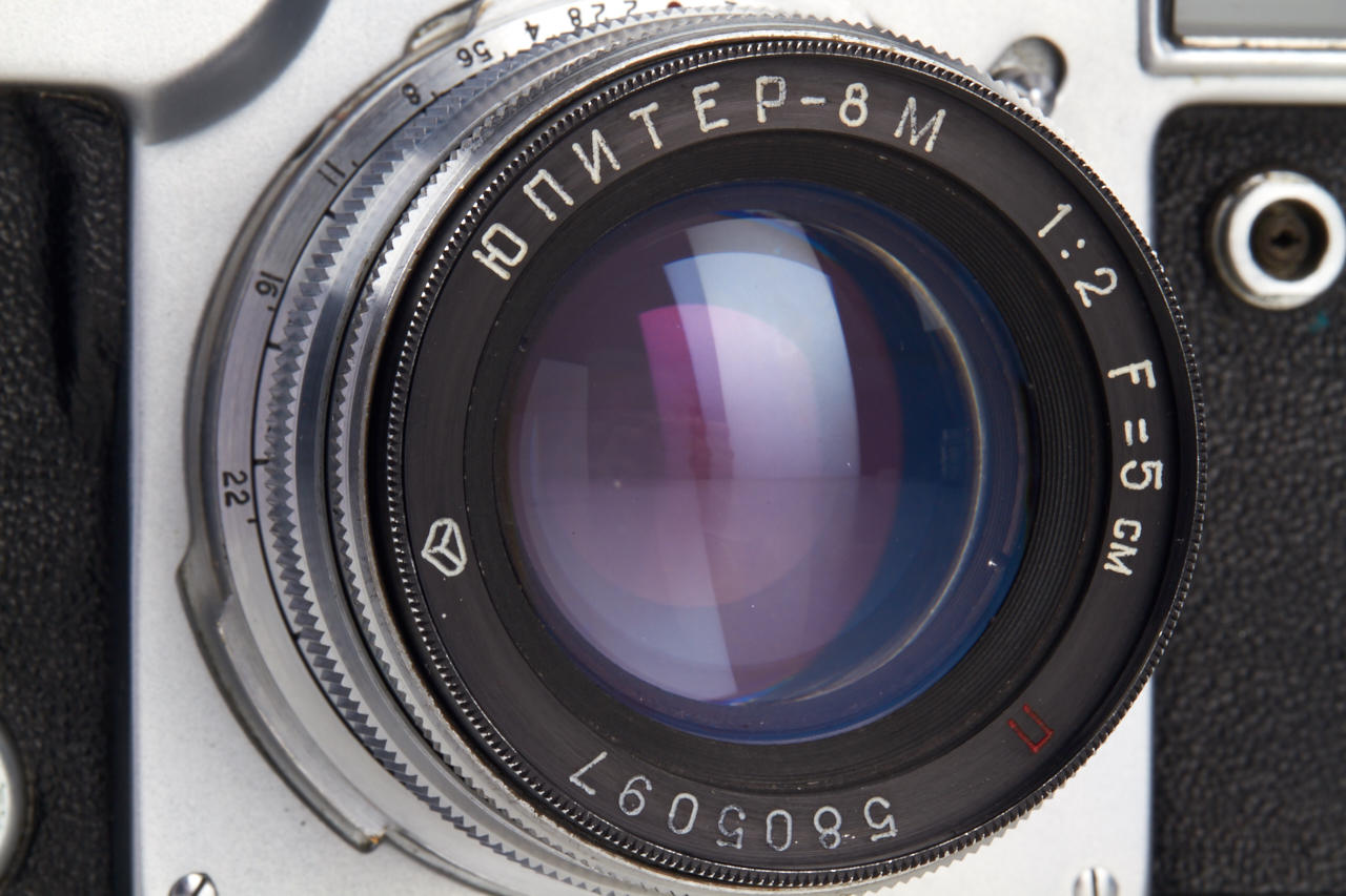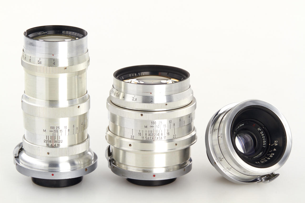 beautiful mint outfit with 4 lenses: body in working condition, Jupiter-8M 2/5cm no.5805097, Jupiter-12 2.8/3.5cm no.5600557, Jupiter-9 2/8.5cm no.5600532, Jupiter-11 4/13.5cm no.5601045 - all lenses mint with caps, Universal finder, 6 filters, 3 original film cartridges, cable release - all in fitted leather case with red velvet inlet