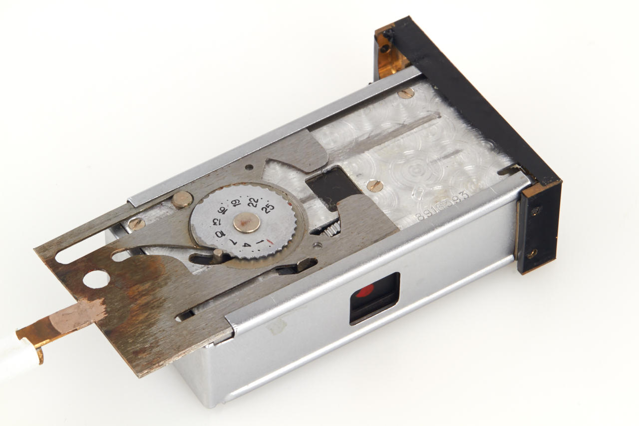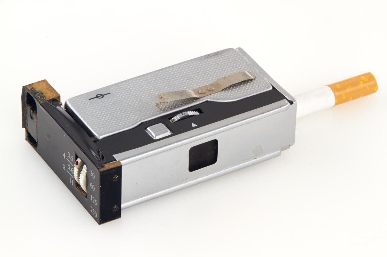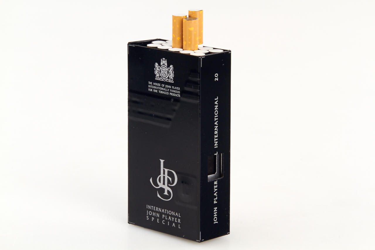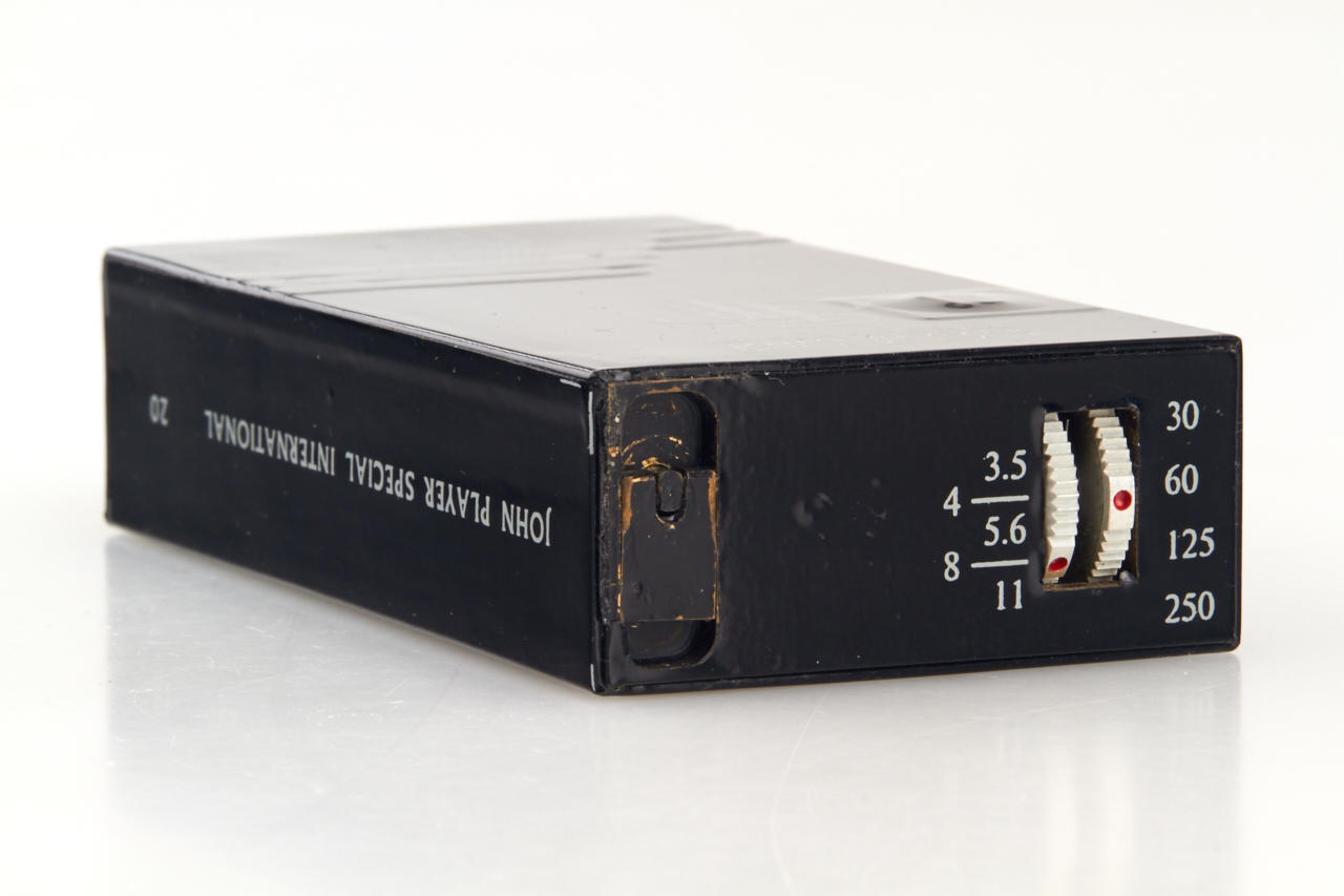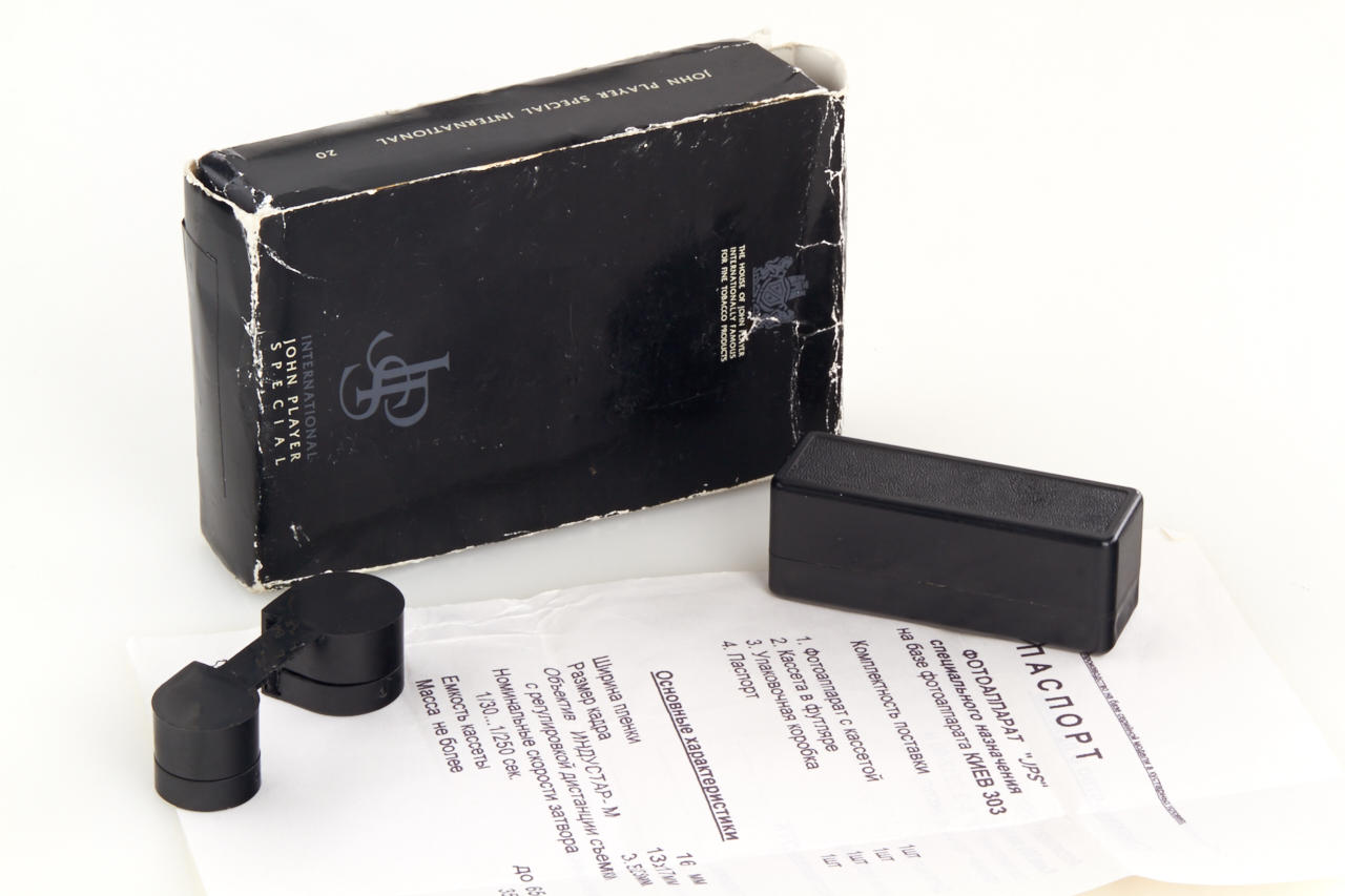 consisting of a metal replica of a pack of John Player cigarettes, with small opening for lens, irregularly protruding "cigarettes", with Kiev 303 16mm subminiature camera body, film is transported by pulling protruding cigarette; with 3.5/23mm Industar lens, with large cigarette box containing instruction leaflet