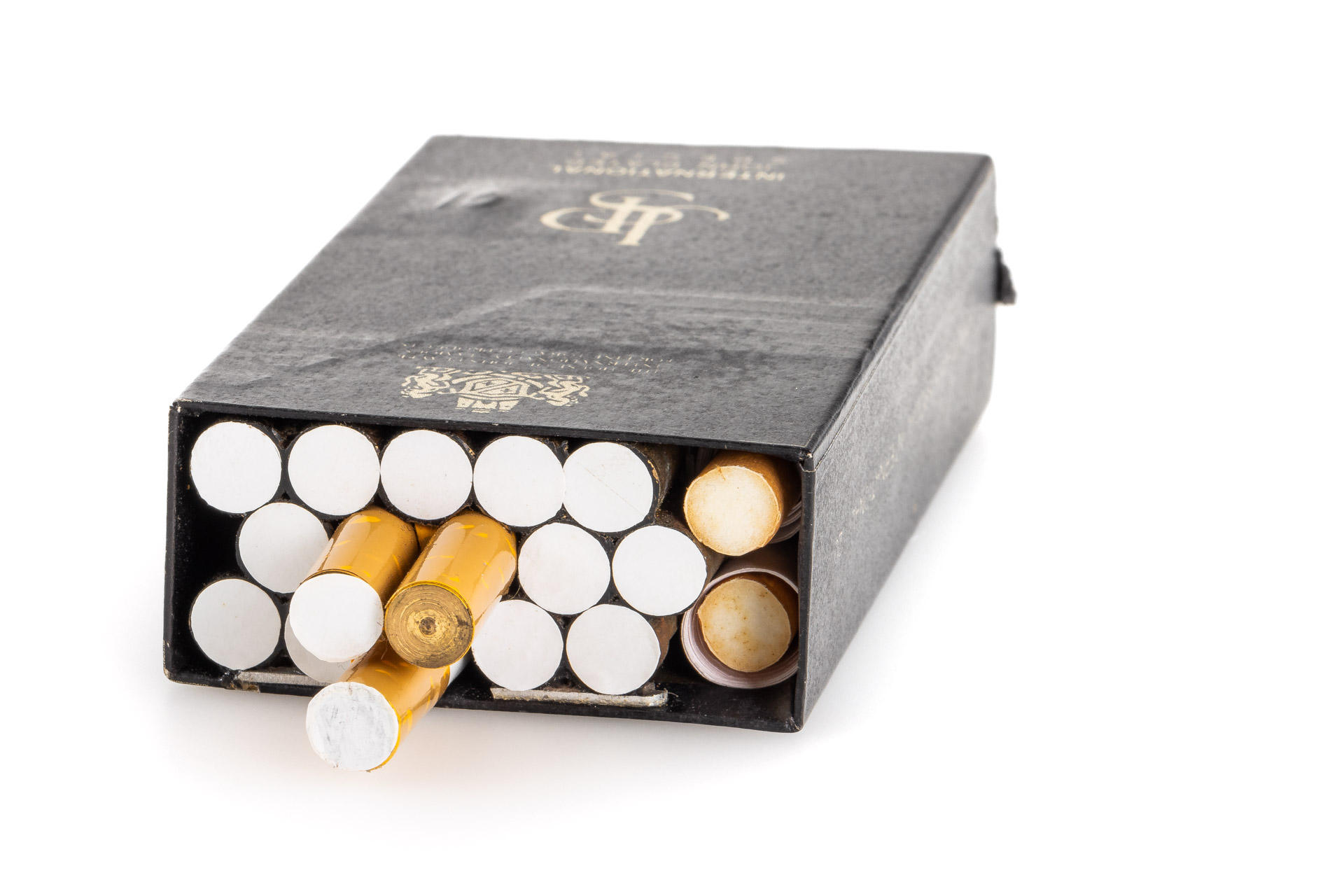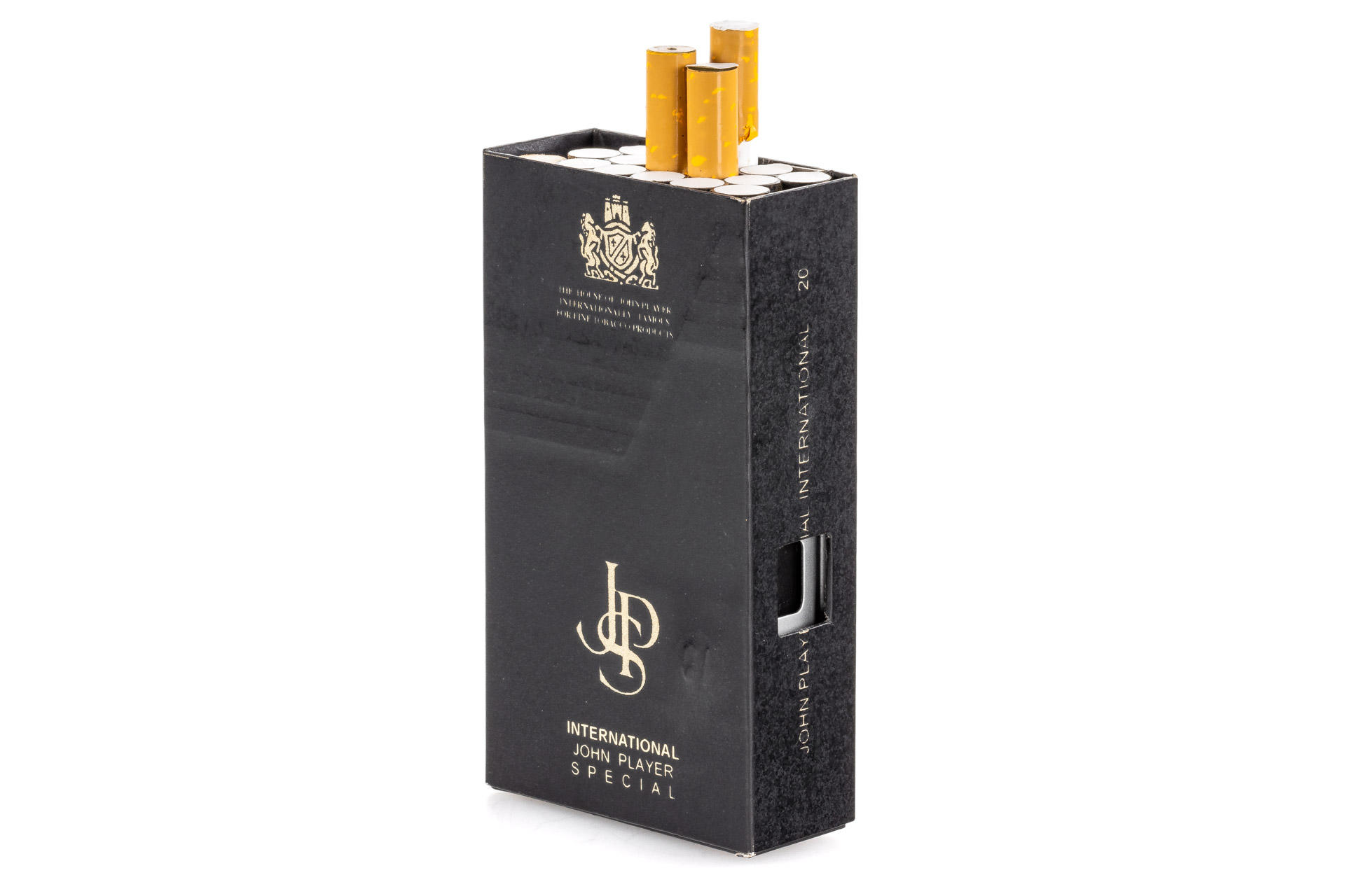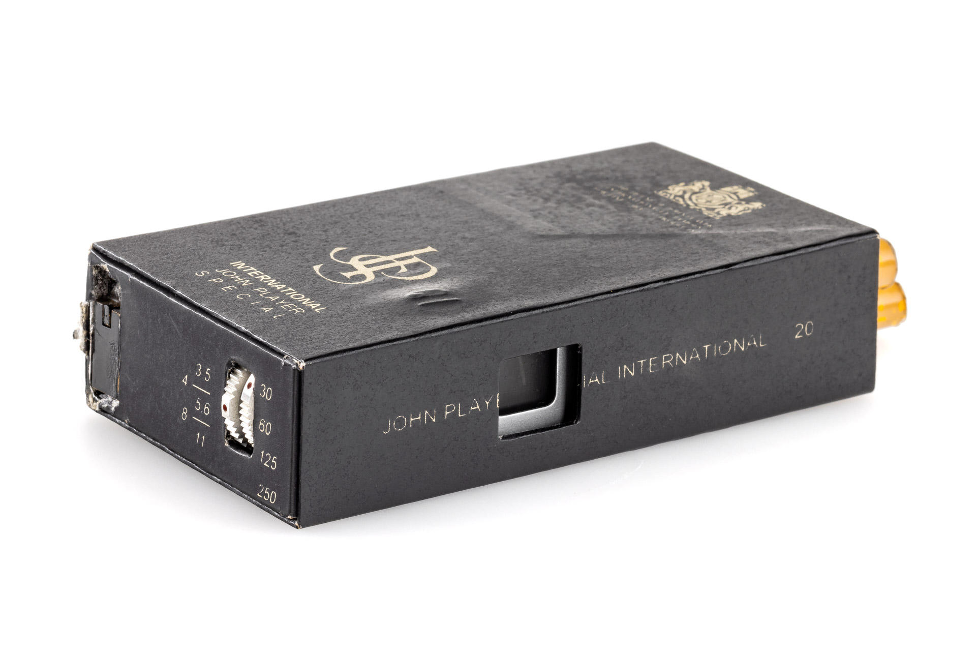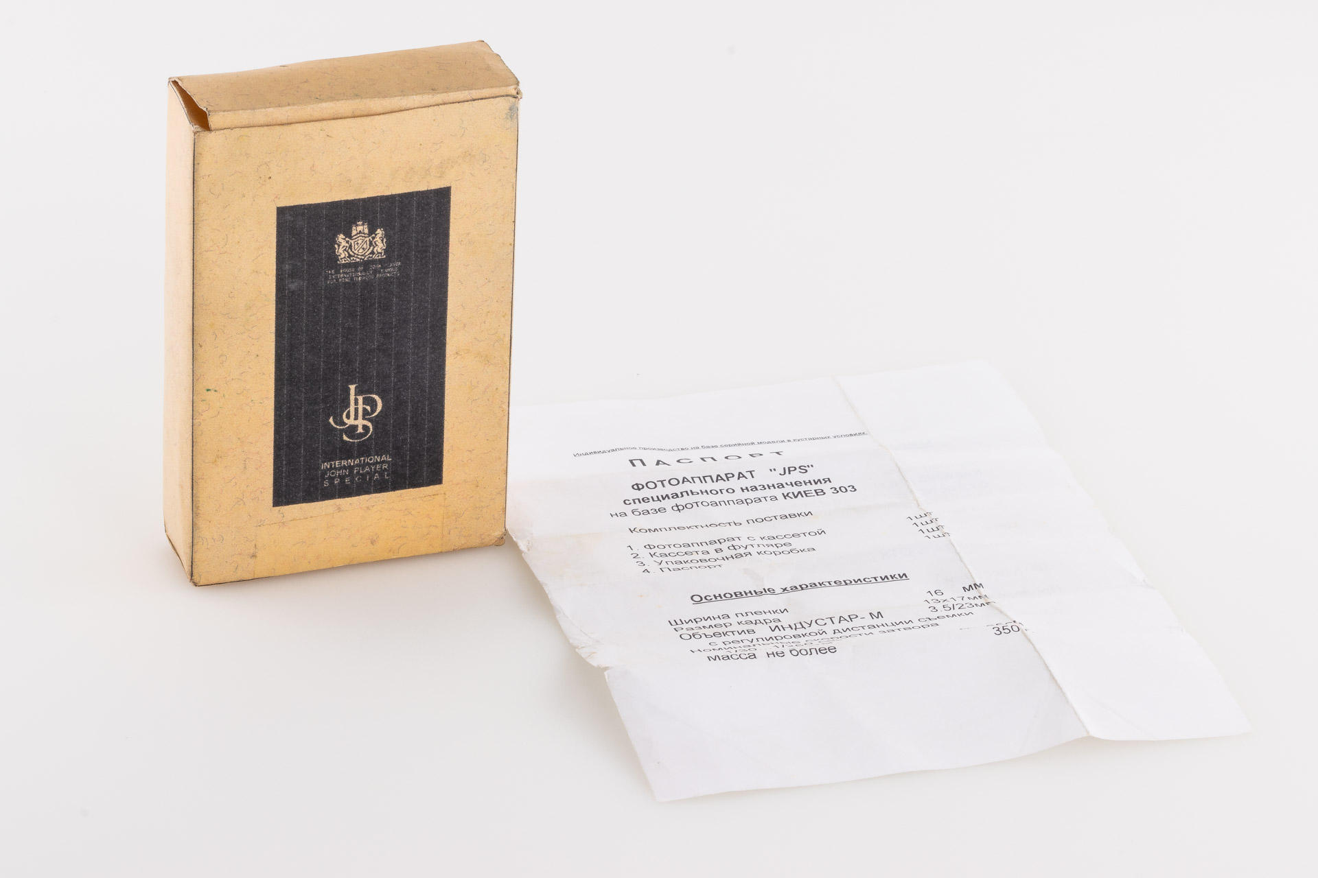 metal replica of John Player cigarettes packet, with small opening for lens, irregularly protruding 'cigarettes', with Kiev 303 16mm subminiature camera body no.33859 (engraved on the bottom side), film is transported by pulling protruding cigarette, with 3.5/23mm Industar lens, in very good condition and working order, with second film magazine, instructions and maker's box