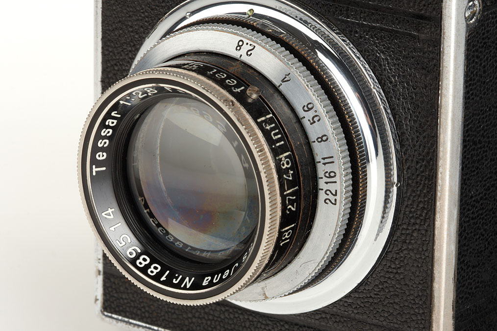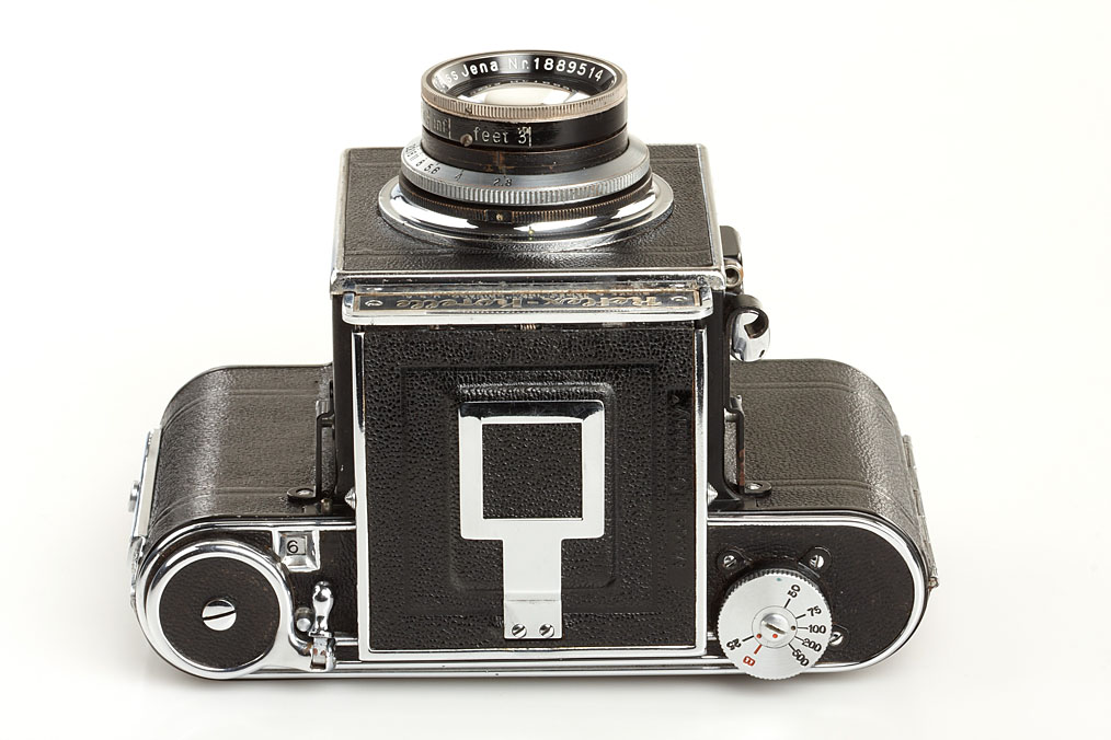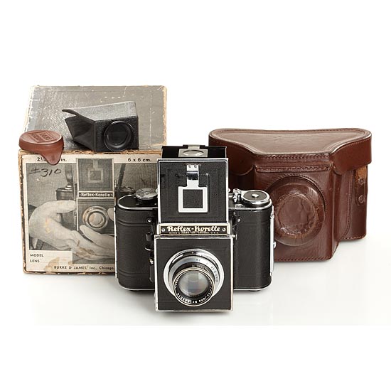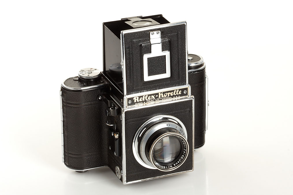 near mint Korelle I export version, nameplate: Burke & James Inc. Chicago U.S.A., with Carl Zeiss Jena Tessar 2.8/7.5cm no.1889514, with viewfinder magnifier, case and rare maker's box
