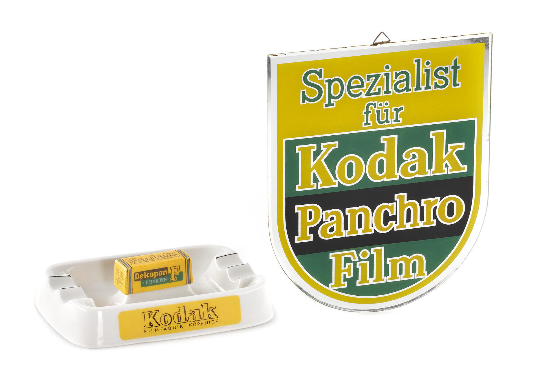 very nice advertising ashtray made of porcelain by VEB Zier Werbe in Jlmenau (GDR) for Kodak Dekopan films, 15 x 10 x 4cm, together with an almost mint printed mirror for Kodak Panchro films 18.5 x 15cm