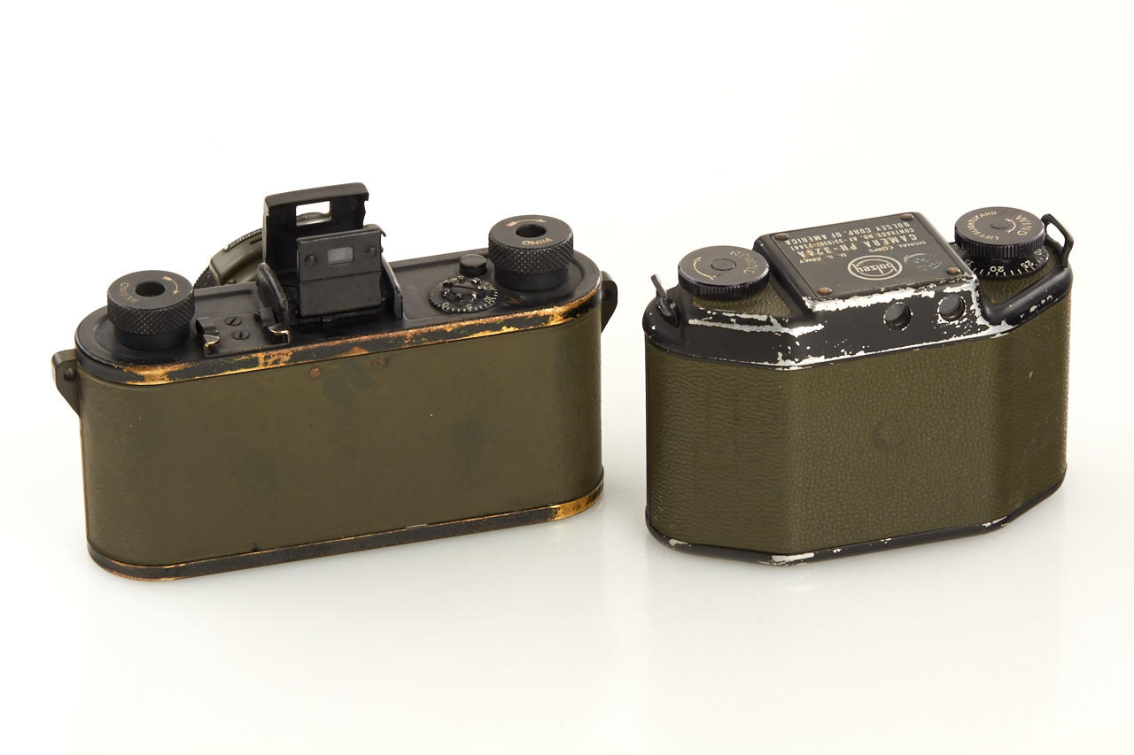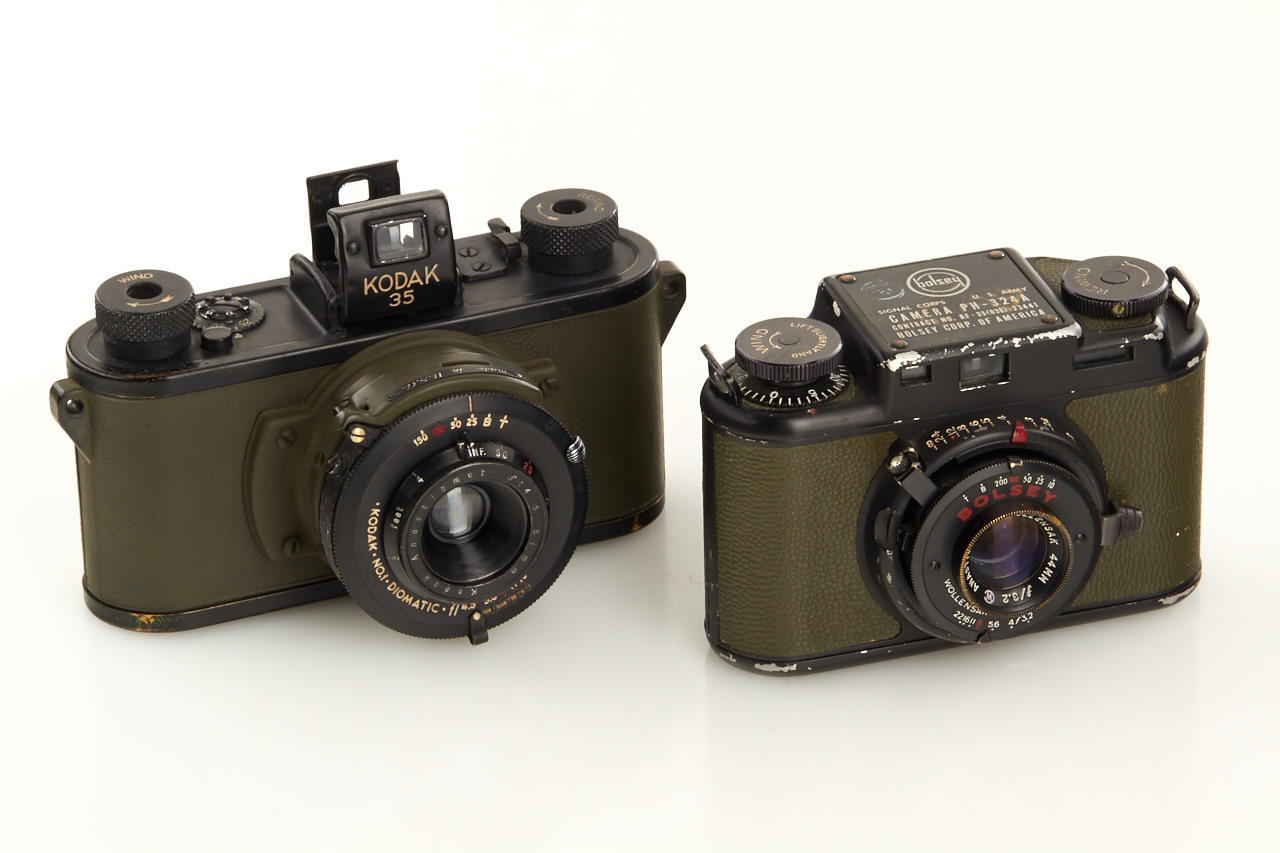 (1) Kodak 35, olive drab body, US Military Model PH-324 no.03431, (2) Bolsey olive drab Army Model PH324A no.97064, (3) Kodak Medalist (I) later version no.2734 with Ektar 3.5/100mm no. EC1269 with cap, everready case, two Medalist camera backs with original boxes