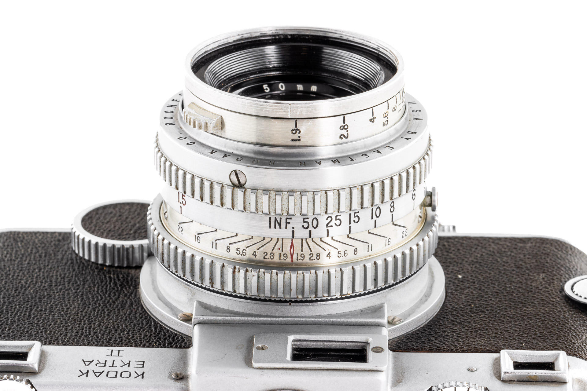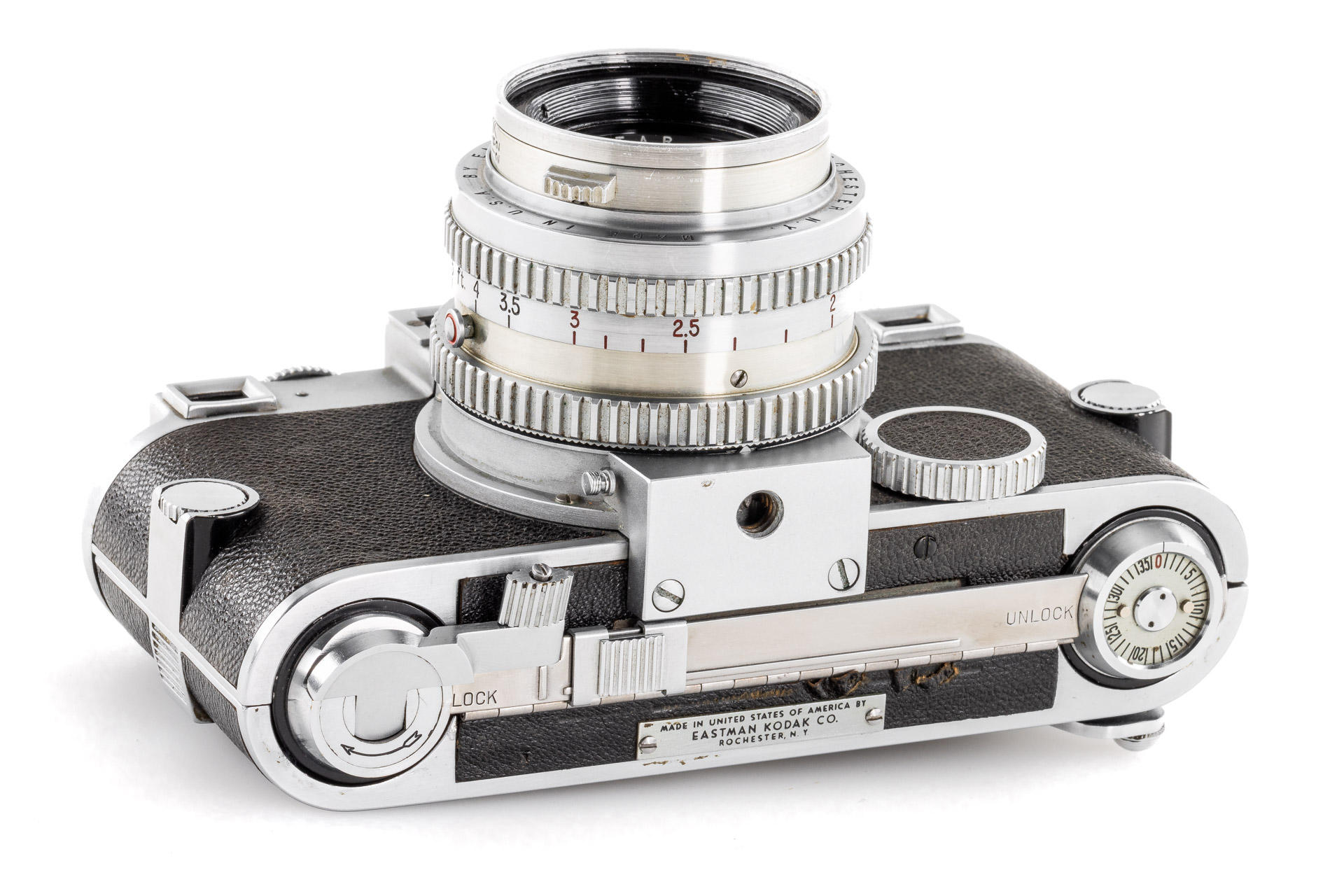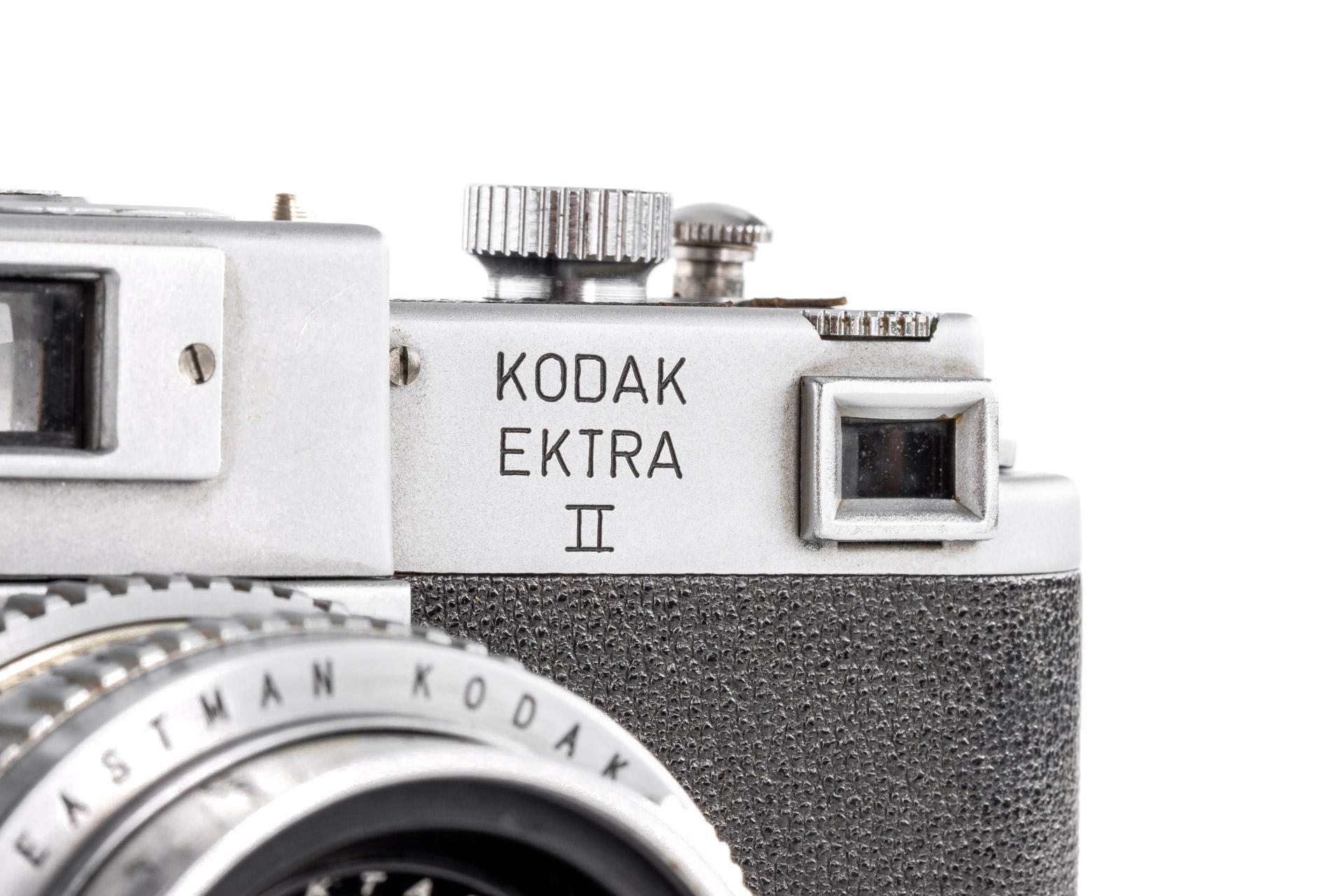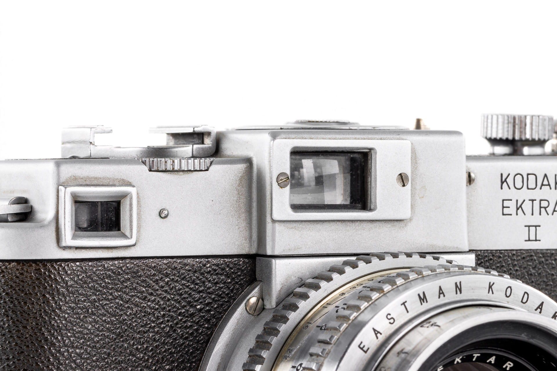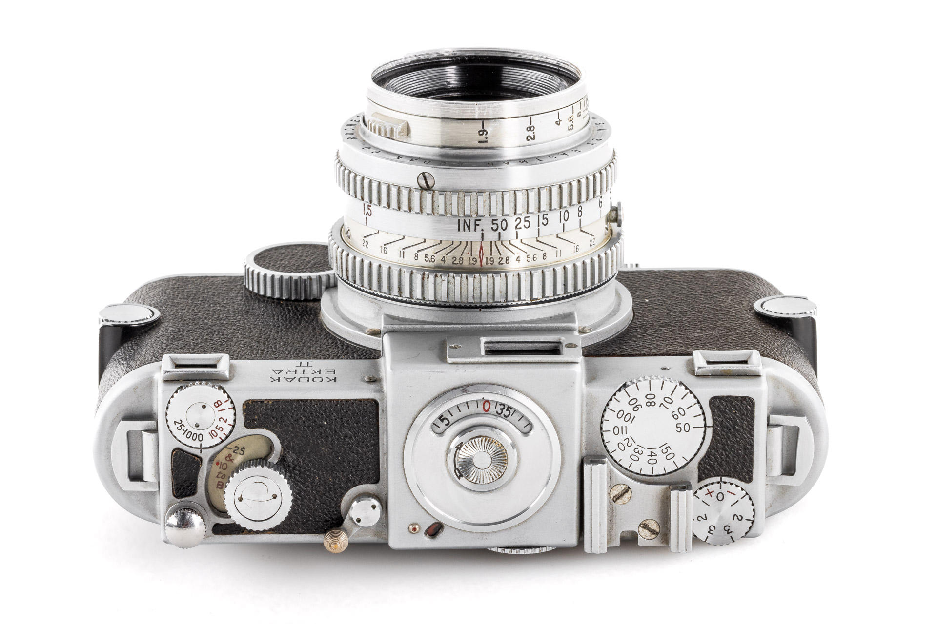 Introduced in 1941 Kodak Ektra was the most advanced rangefinder 35mm of its time. It was the first 35mm rangefinder camera to have a parallax compensated viewfinder, the first rangefinder system to offer lens coating on all lenses, the first to offer lever advance and use a film rewind lever. The Ektra was also one of the most expensive cameras of its time - at 700USD it was the equivalent of a compact car. Because of low sales, only around 2500 cameras were made and Ektra was discontinued in 1948. The planned Ektra II never went into production – only a few prototype examples have been made and right now only four cameras are known to exist - serial numbers 7020, 7021, 7032 and here 7046 are recorded so far. A major difference planned for introduction with the Ektra II was the provision for the optional film back with a spring-driven motor drive. With its high-speed operation, it forced Kodak engineers to upgrade the shutter with more robust and reliable parts. Several other improvements to the camera have also been made, like an upgraded viewfinder, larger, more stable tripod mount, different markings on the speed selector dial etc. The offered camera is in excellent condition, with only minimal signs of age on the body, the shutter needs maintenance. With Kodak Ektar 1.9/50mm no.ER462, film back no.6277. The serial number ‘B-7046’ is engraved on the tripod mount. The Kodak Ektra II is an extreme rarity and this offers a unique opportunity for every camera collector.