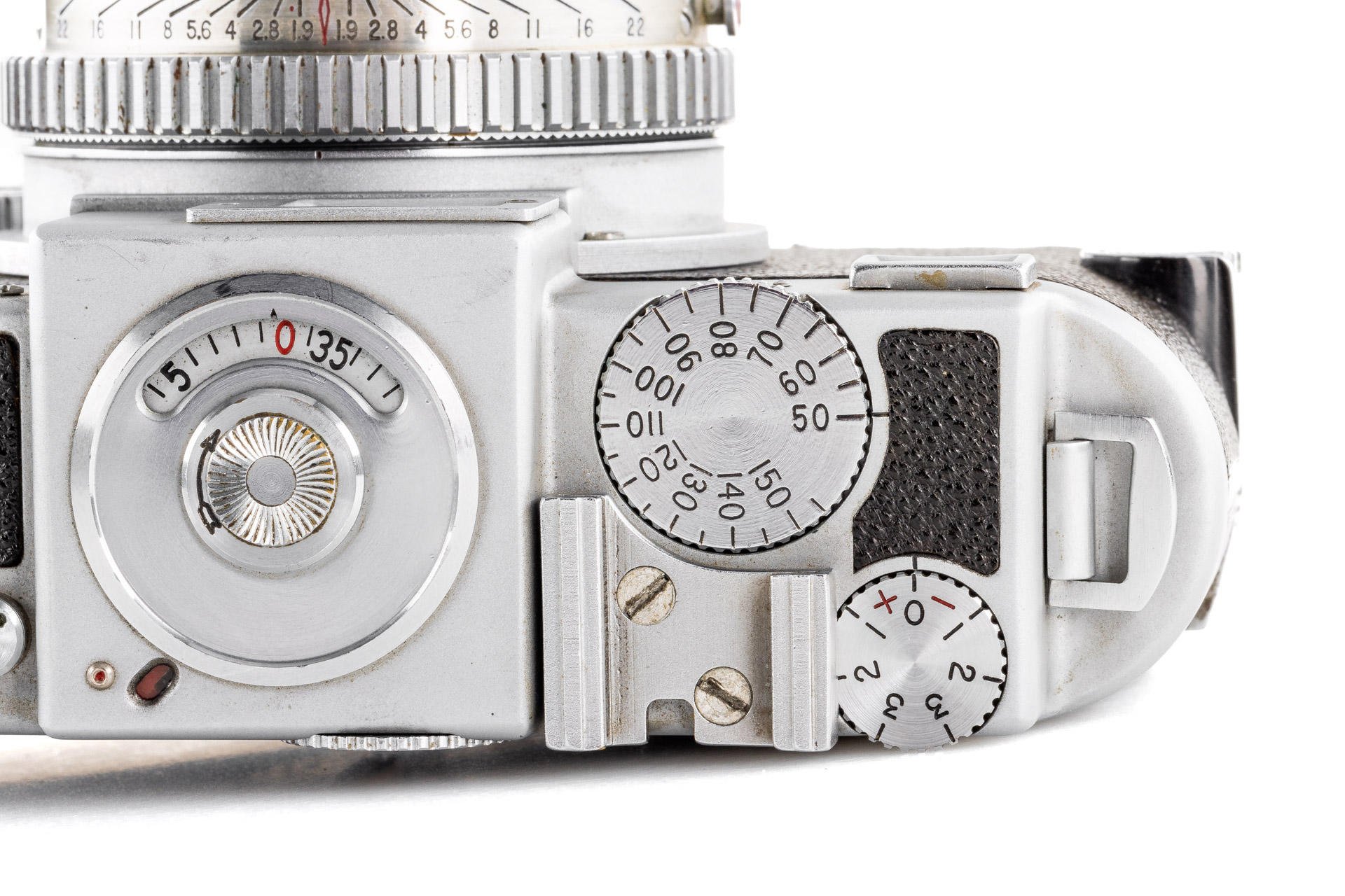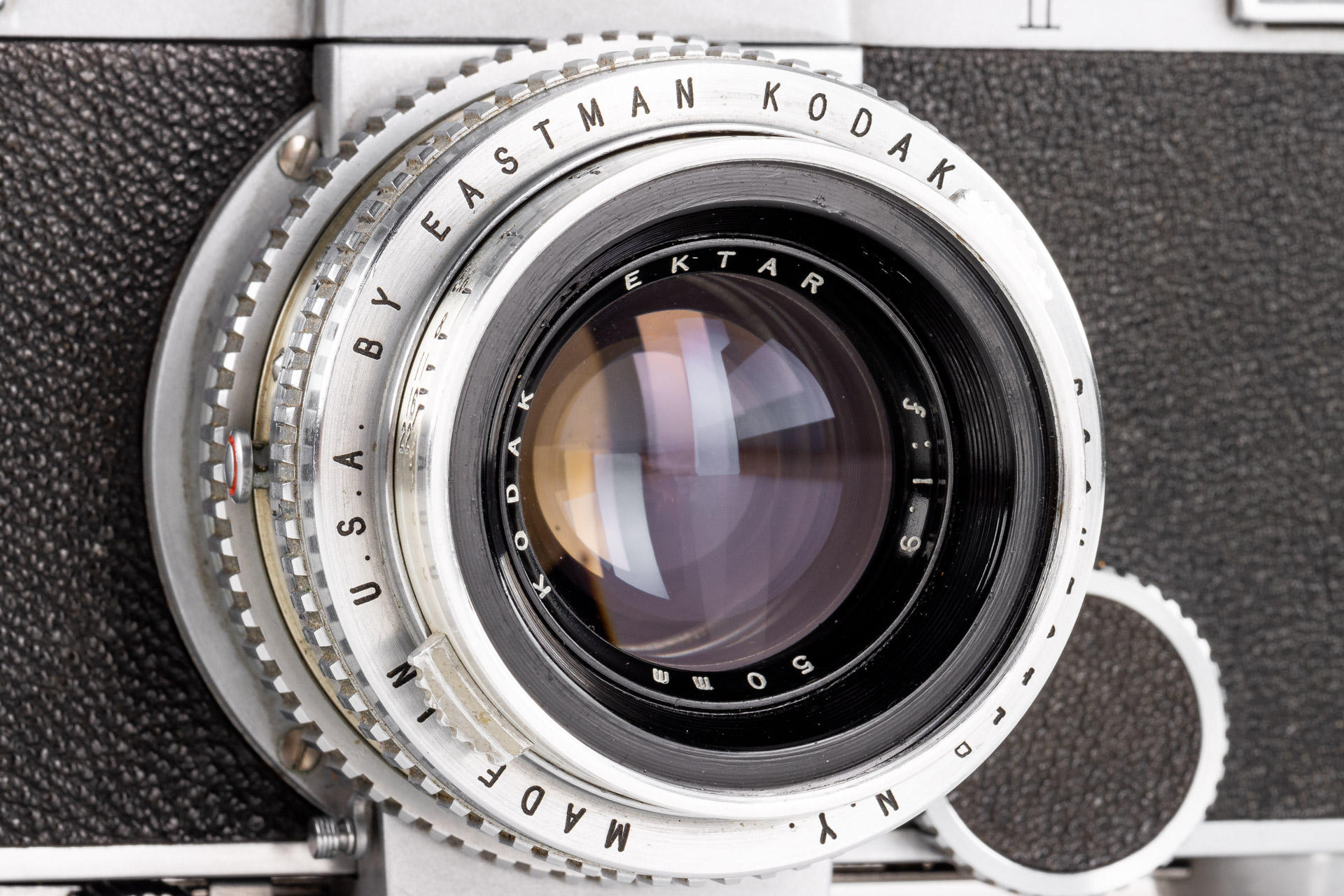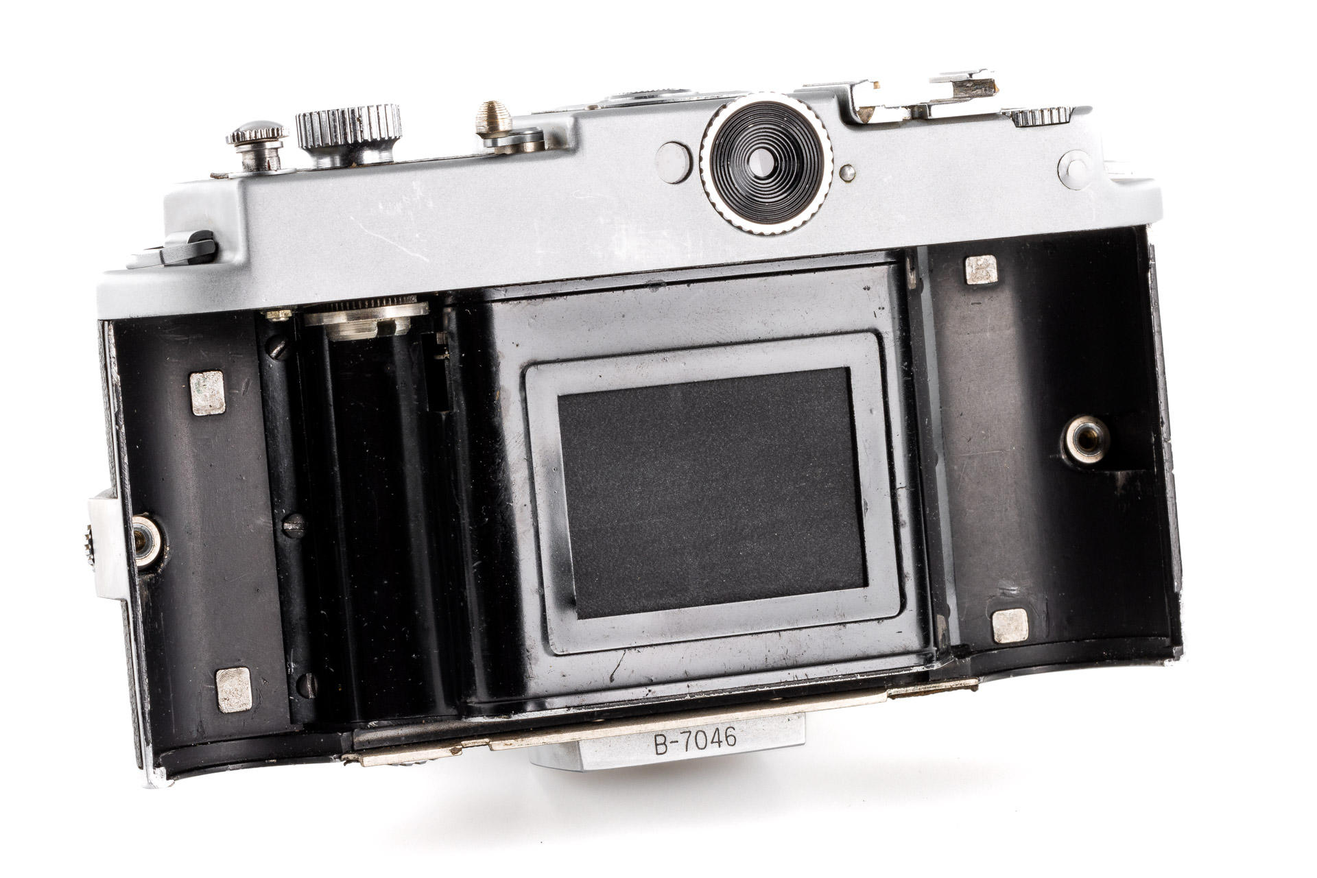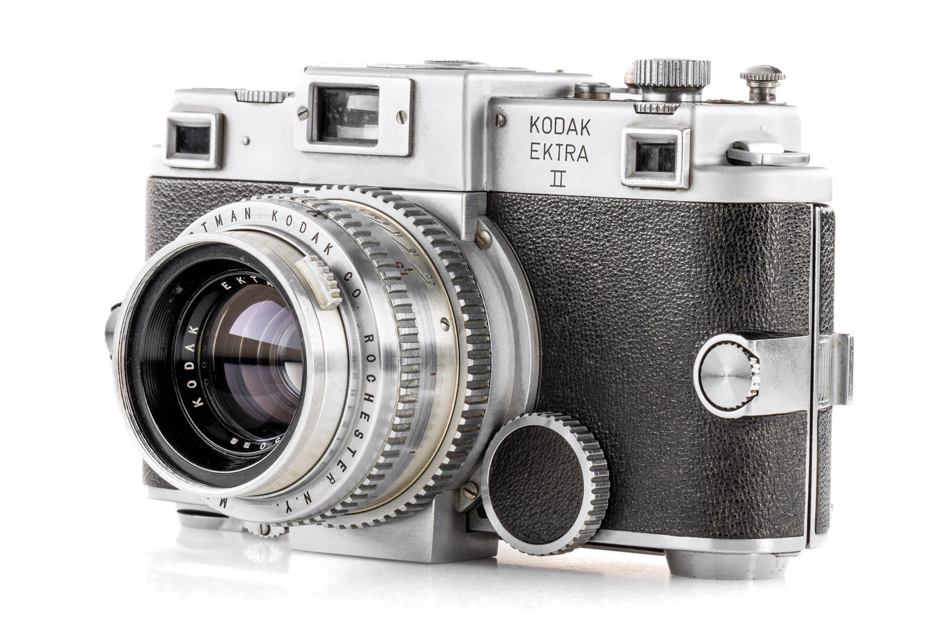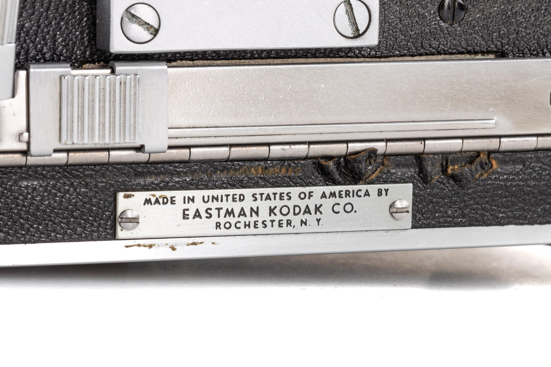 Introduced in 1941 Kodak Ektra was the most advanced rangefinder 35mm of its time. It was the first 35mm rangefinder camera to have a parallax compensated viewfinder, the first rangefinder system to offer lens coating on all lenses, the first to offer lever advance and use a film rewind lever. The Ektra was also one of the most expensive cameras of its time - at 700USD it was the equivalent of a compact car. Because of low sales, only around 2500 cameras were made and Ektra was discontinued in 1948. The planned Ektra II never went into production – only a few prototype examples have been made and right now only four cameras are known to exist - serial numbers 7020, 7021, 7032 and here 7046 are recorded so far. A major difference planned for introduction with the Ektra II was the provision for the optional film back with a spring-driven motor drive. With its high-speed operation, it forced Kodak engineers to upgrade the shutter with more robust and reliable parts. Several other improvements to the camera have also been made, like an upgraded viewfinder, larger, more stable tripod mount, different markings on the speed selector dial etc. The offered camera is in excellent condition, with only minimal signs of age on the body, the shutter needs maintenance. With Kodak Ektar 1.9/50mm no.ER462, film back no.6277. The serial number ‘B-7046’ is engraved on the tripod mount. The Kodak Ektra II is an extreme rarity and this offers a unique opportunity for every camera collector.
