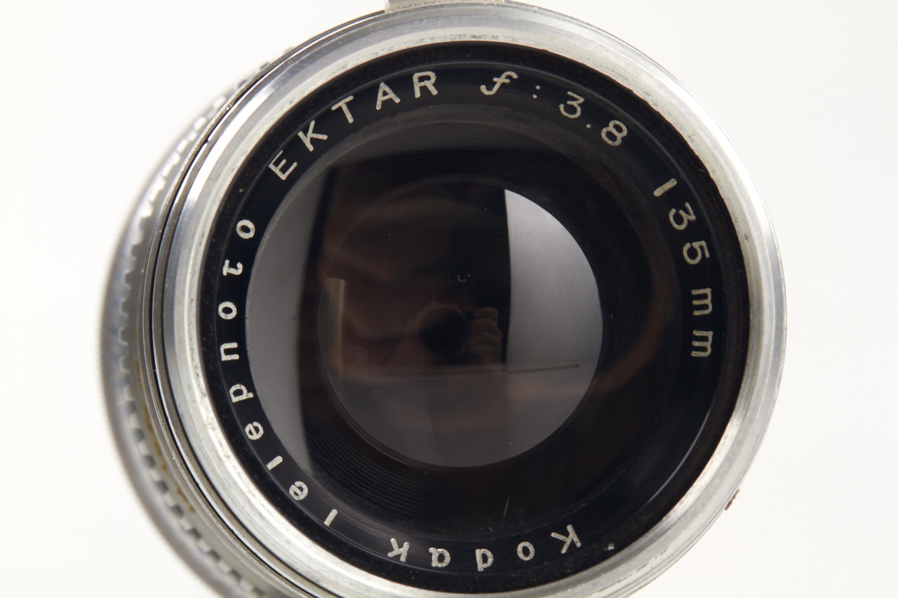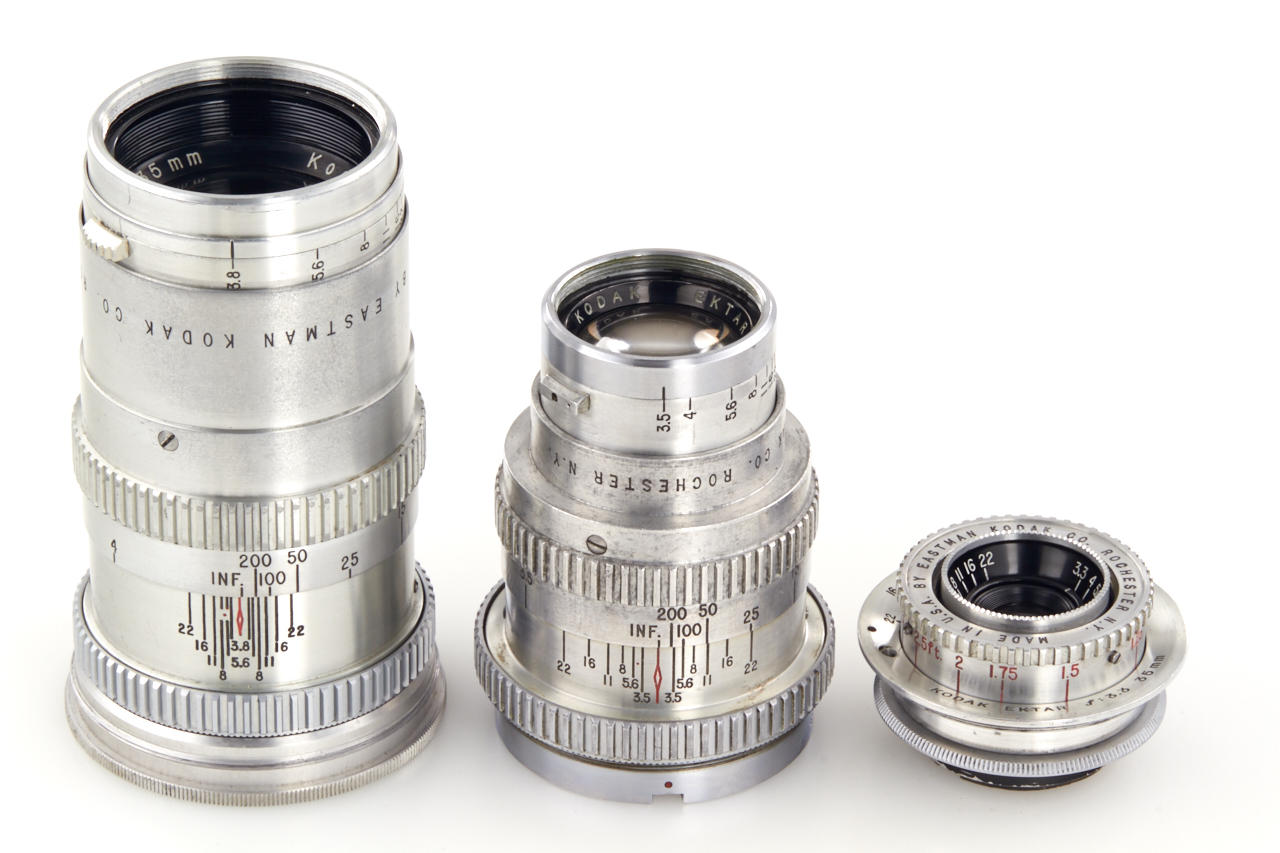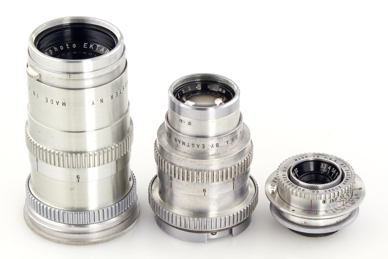 including body (shutter and rangefinder non-operable) with Ektar 3.5/50mm no.EY140, Ektar 3.5/35mm (cond. C, missing mount), Ektar 3.5/90mm no.EC860 (cond. B-, cleaning marks, with hood), Telephoto Ektar 3.8/135mm no.EC228 (cond. B+, metal keeper)