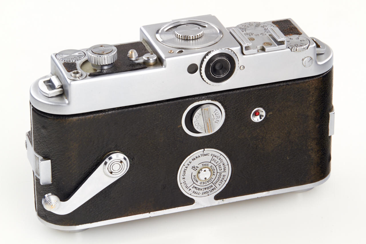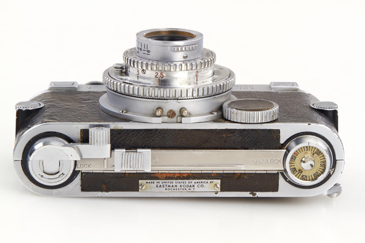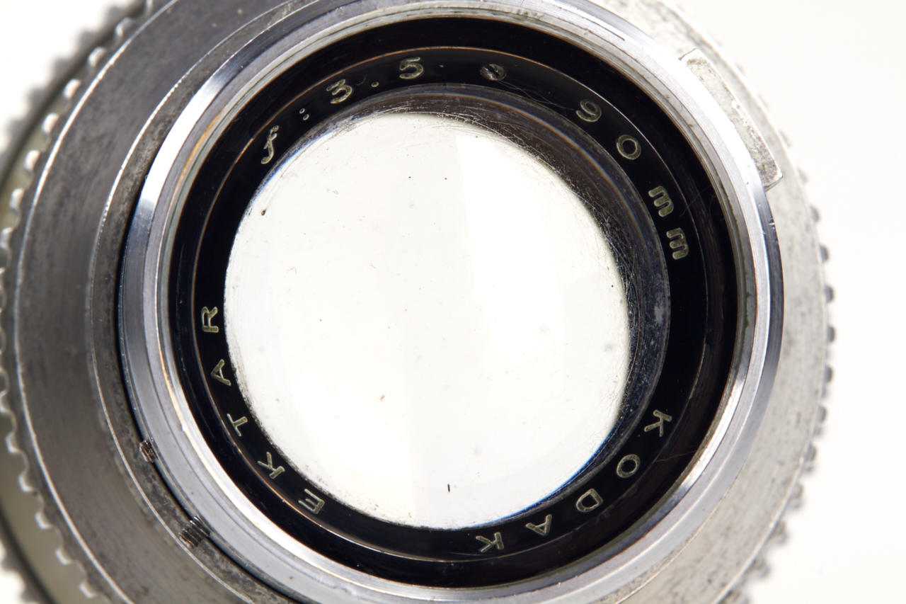 including body (shutter and rangefinder non-operable) with Ektar 3.5/50mm no.EY140, Ektar 3.5/35mm (cond. C, missing mount), Ektar 3.5/90mm no.EC860 (cond. B-, cleaning marks, with hood), Telephoto Ektar 3.8/135mm no.EC228 (cond. B+, metal keeper)