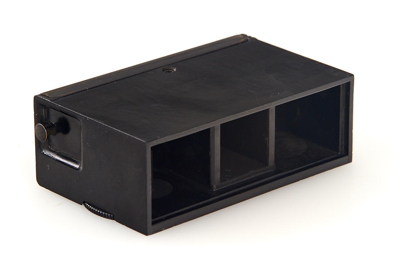 Original matchbox spy camera by Kodak, anodized brass outer shell and a bakelite body, self-tensioning lamellary shutter 1/30, negative format 14x14mm on 16mm film in special cassettes. The lens is uncoated, probably a Triplet f/4.5 f=25mm. Extremely rare spy camera made by Eastman Kodak for the OSS (Office of Strategic Services - from 1942 to 1945 the military secret service of the USA).
