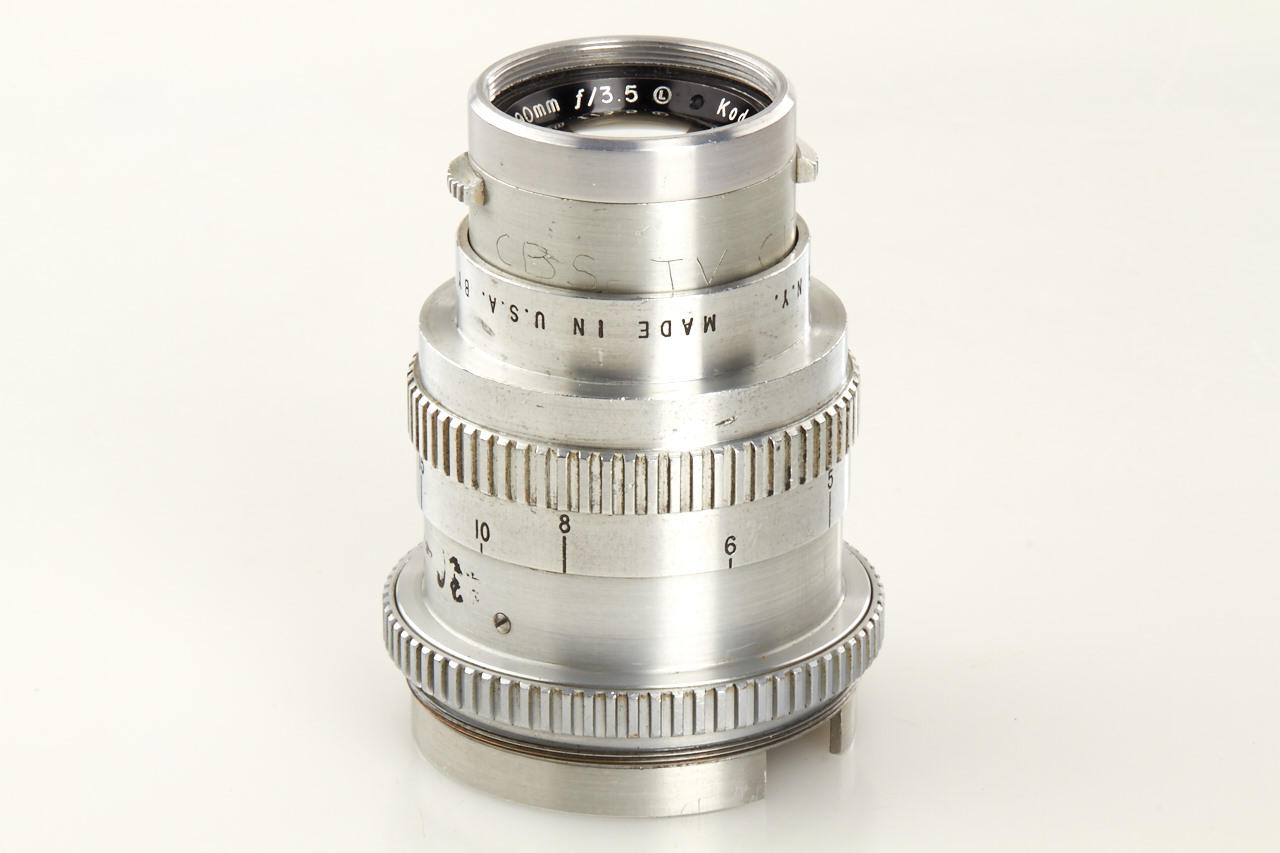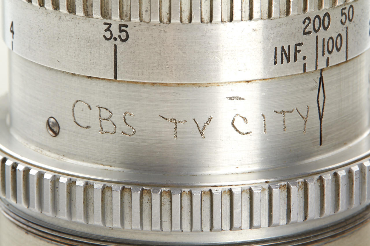 very rare lens with Ektra mount, without serial number, Kodak adapted and provided their range of high-quality Ektar photographic lenses for use in post-war RCA 3"-inch I.O. TV cameras (TK10A etc.). These now quite rare lenses, were specially fitted with turret screw mounts, and were fully colour-corrected (for infrared). The barrel is hand-engraved 'CBS TV CITY', in good condition with cap