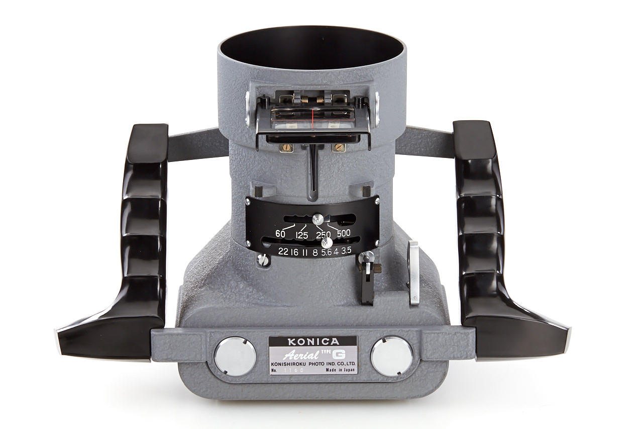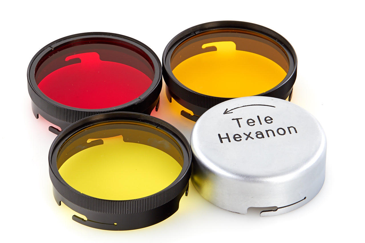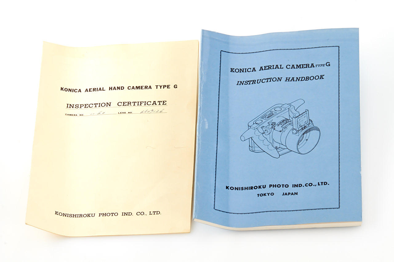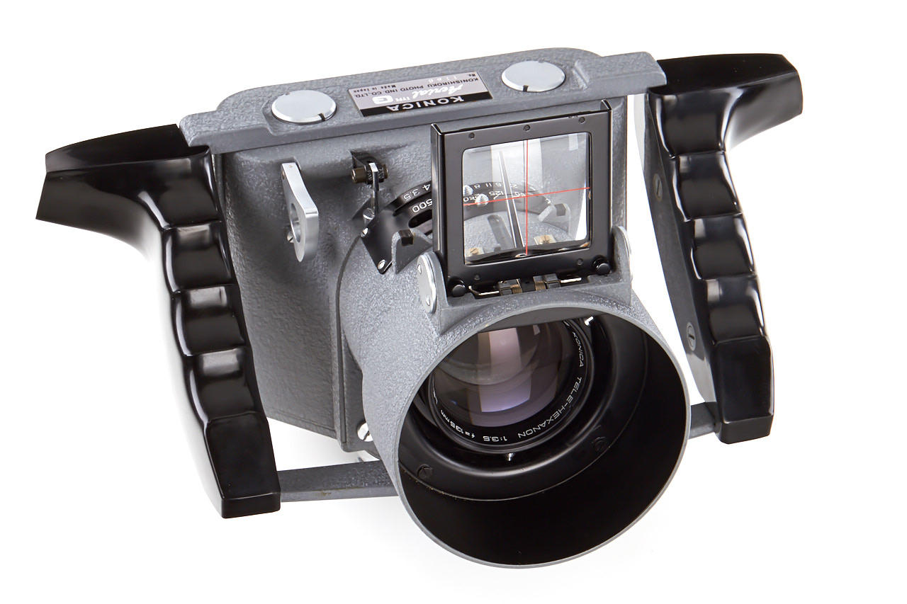 rare compact aerial camera with clockwork motor, for 6x6cm exposures on 120 film, with Tele-Hexanon 3.5/135mm no.6509126, complete with lens cap, 3 filters, strap, instructions, certificate, cleaning set and two magazines, in original metal case, maker's box, probably unused, hard to find this complete and in such great condition