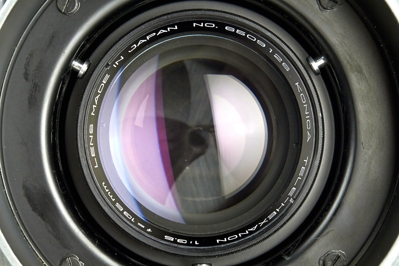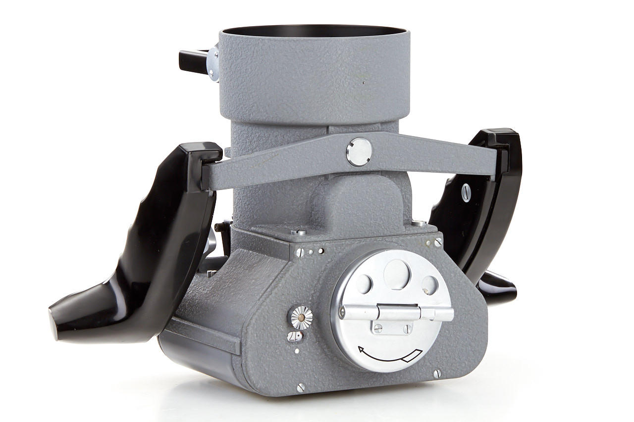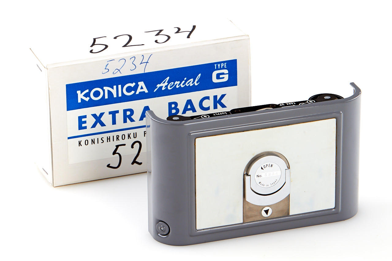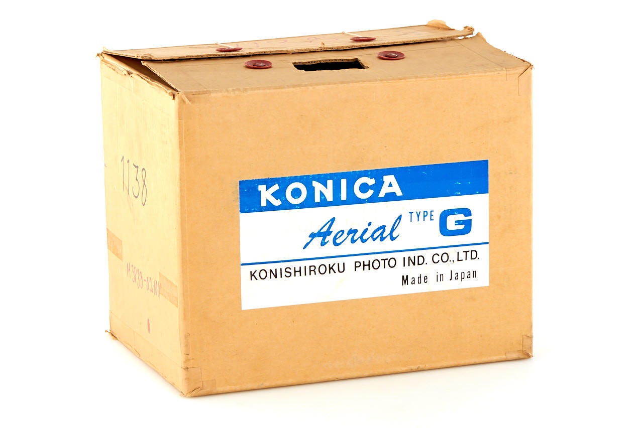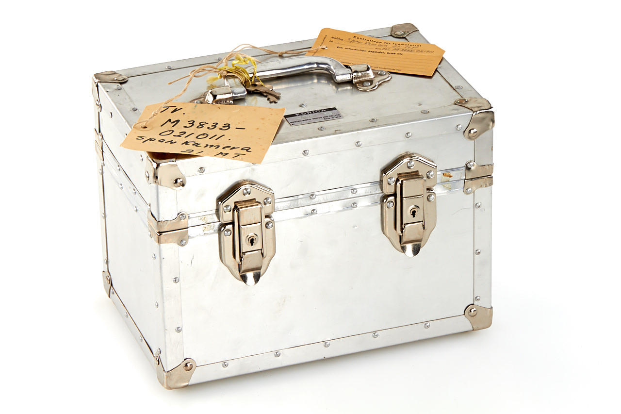 rare compact aerial camera with clockwork motor, for 6x6cm exposures on 120 film, with Tele-Hexanon 3.5/135mm no.6509126, complete with lens cap, 3 filters, strap, instructions, certificate, cleaning set and two magazines, in original metal case, maker's box, probably unused, hard to find this complete and in such great condition