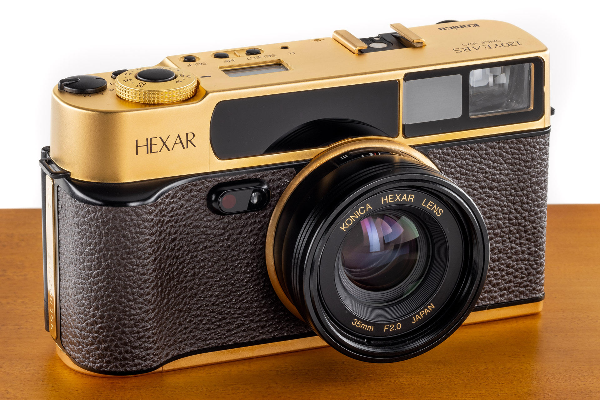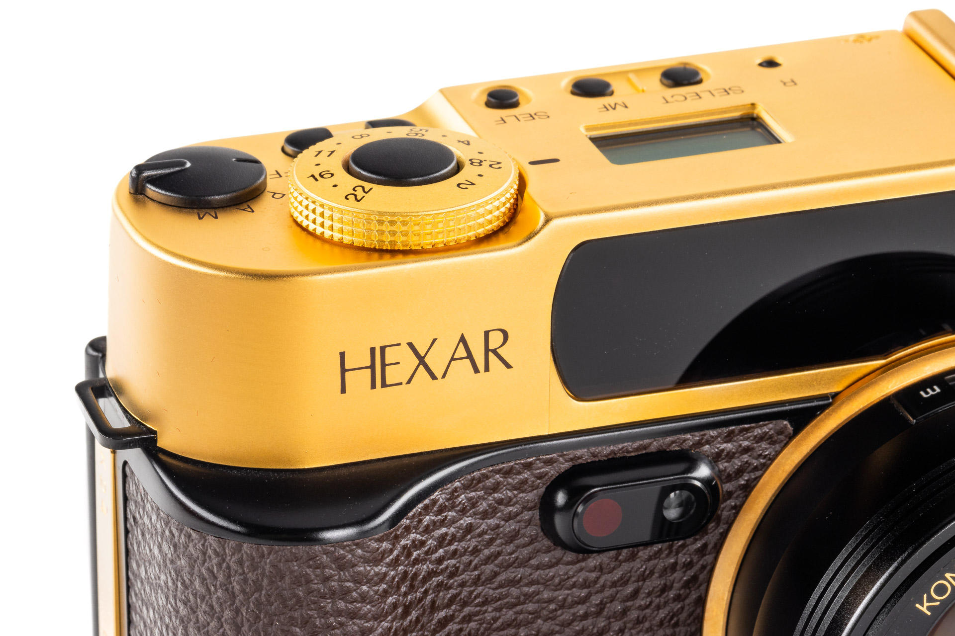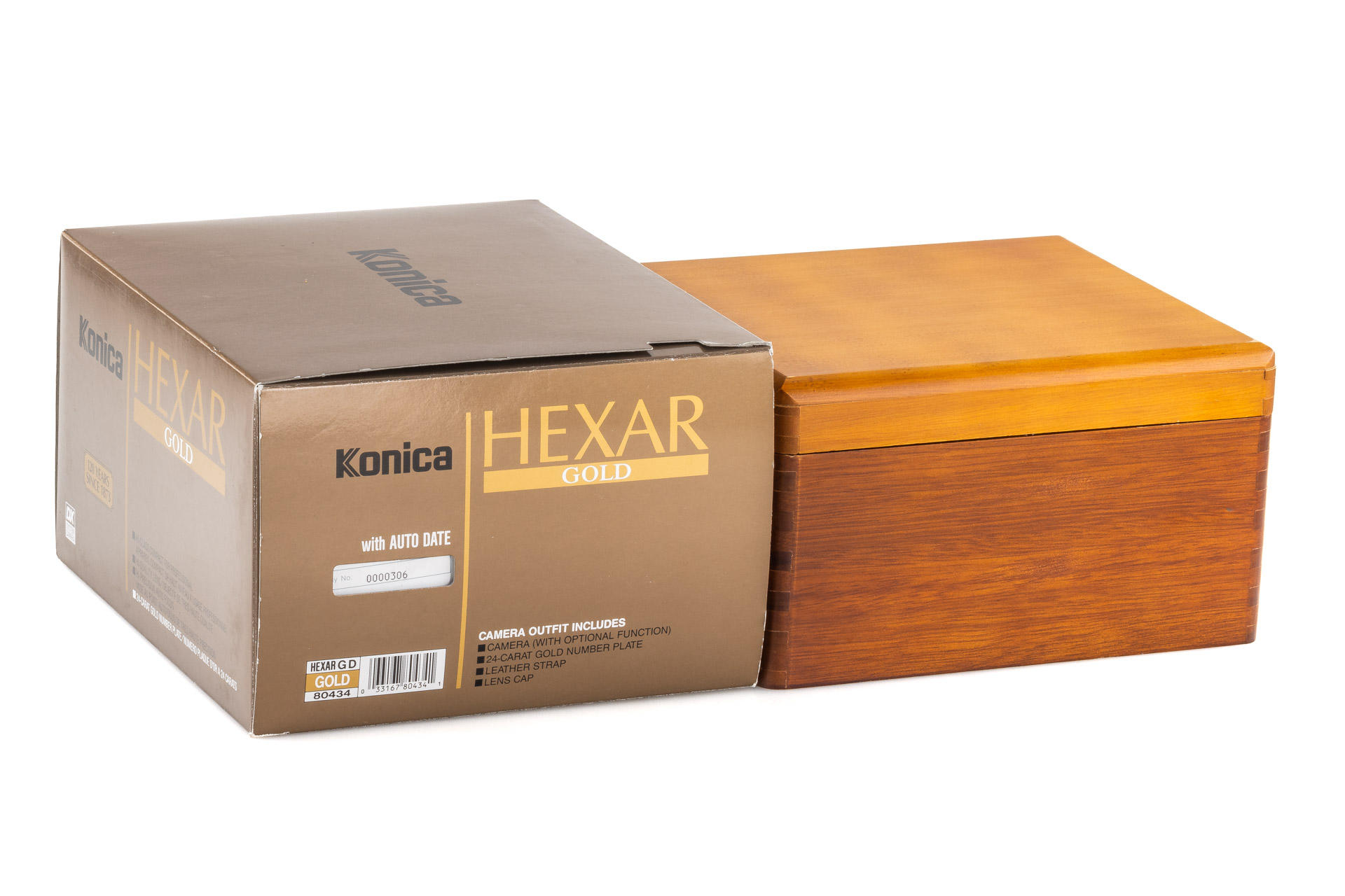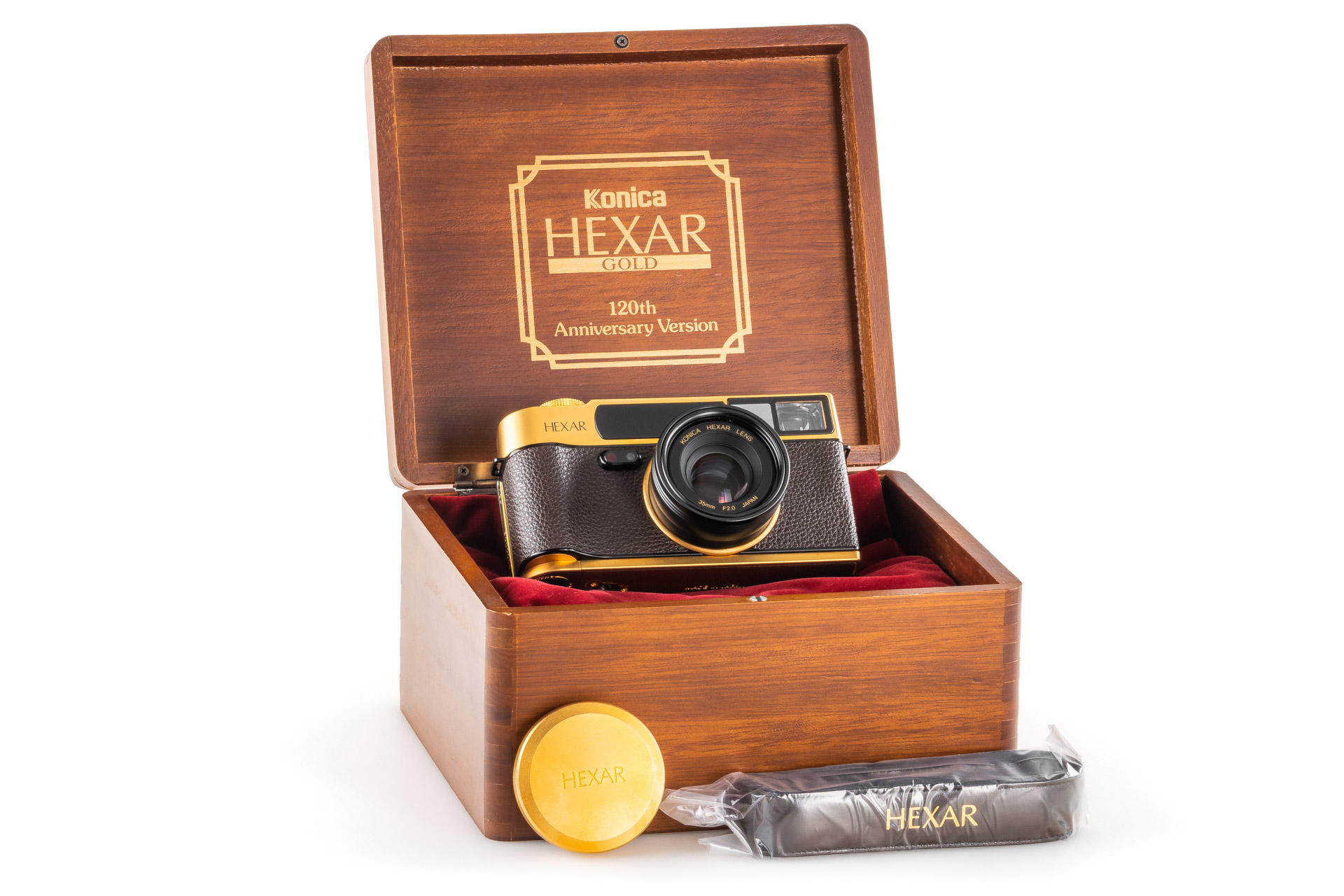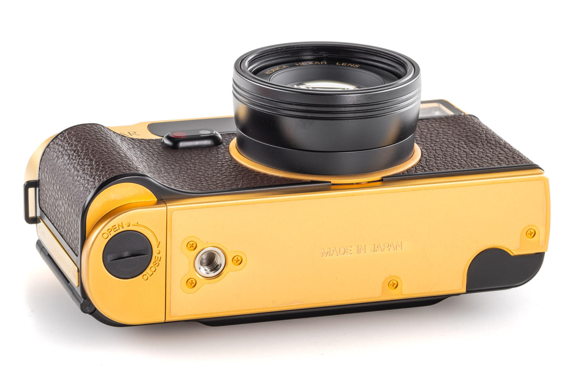 Beautiful and sought-after limited edition (only 500 made) in mint condition, 24K gold plating, Hexar 2/35mm, cap, strap, soft pouch, wooden presentation box, instructions, quality certificate and matching maker's box