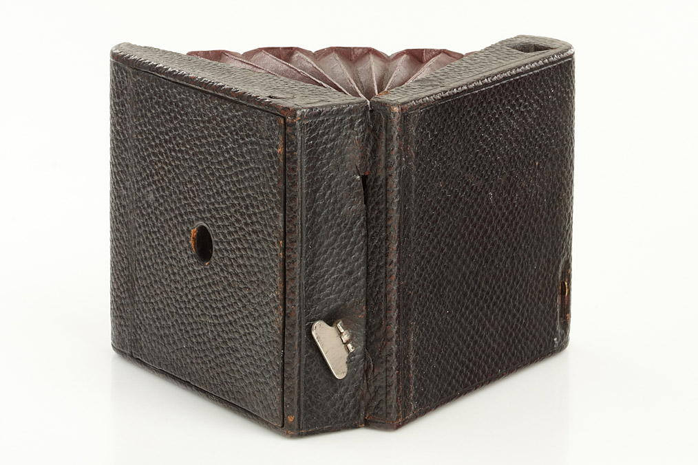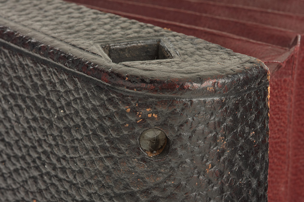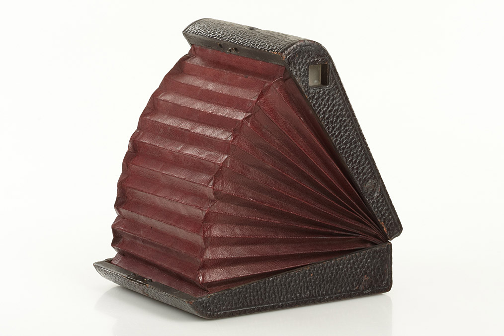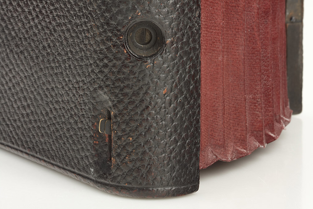 very rare folding camera with red leather bellows for 9x9cm exposures on roll film, fix-focus achromatic lens, improved model with rounded front, in fine original condition