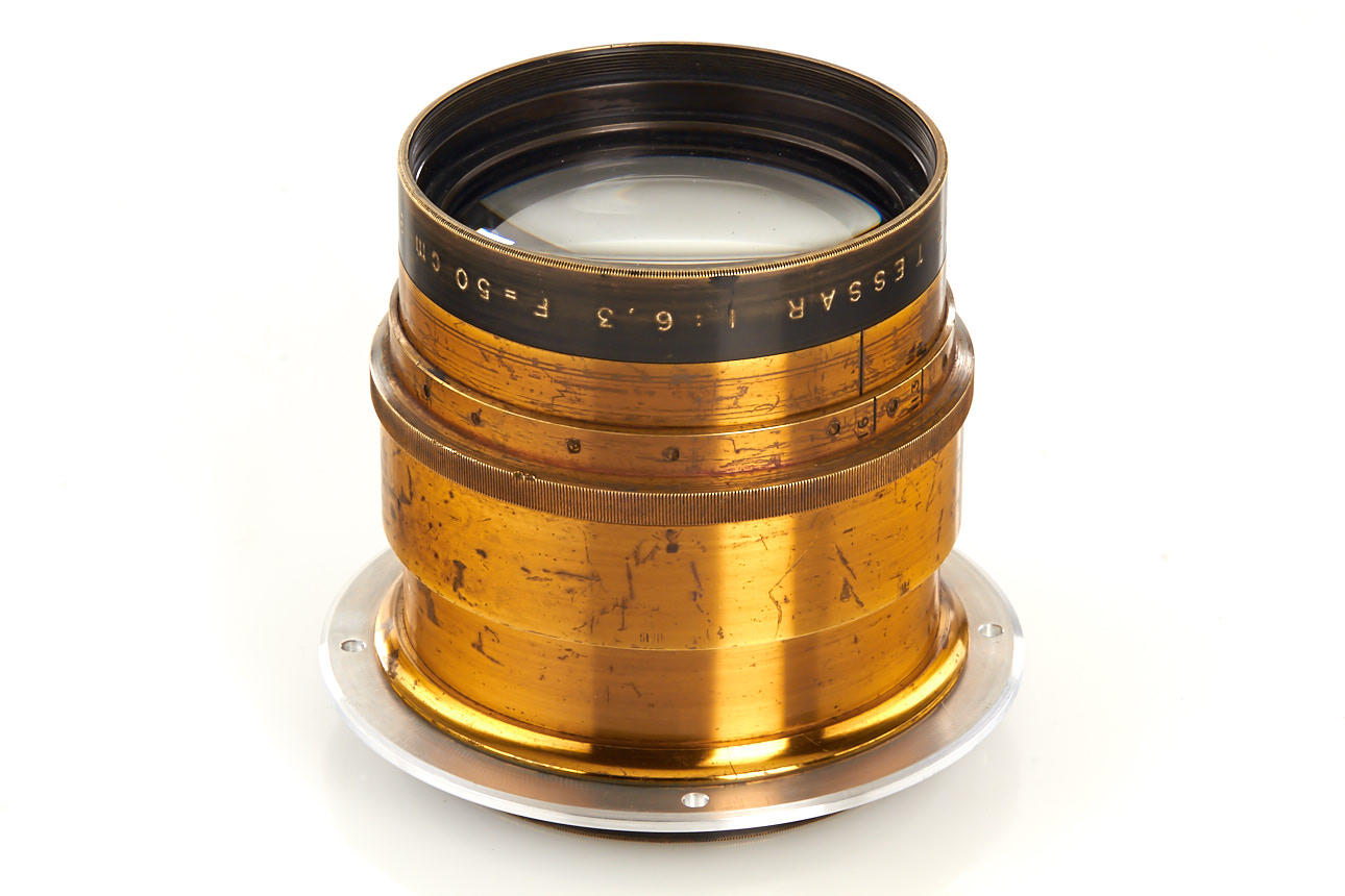 brass large format lens in Tessar design, covers c.35x35cm, in good condition, optics with only minimal cleaning marks, height c.11cm, with mounting ring