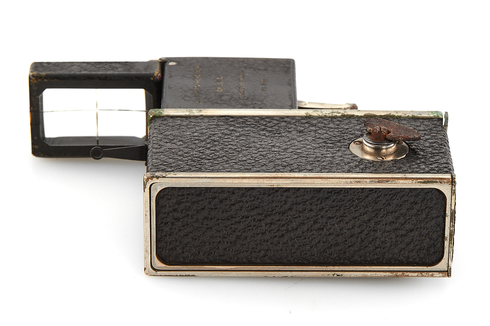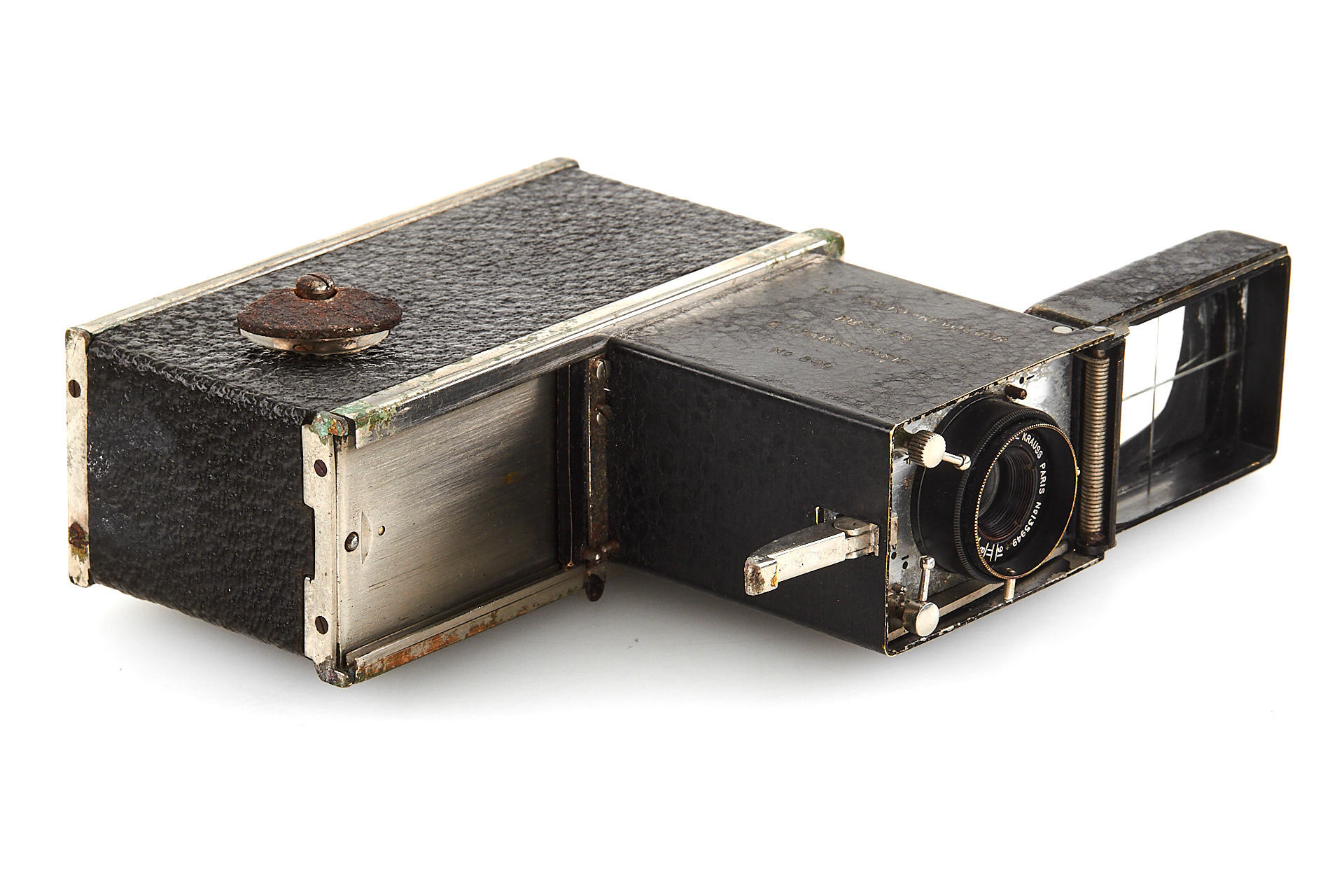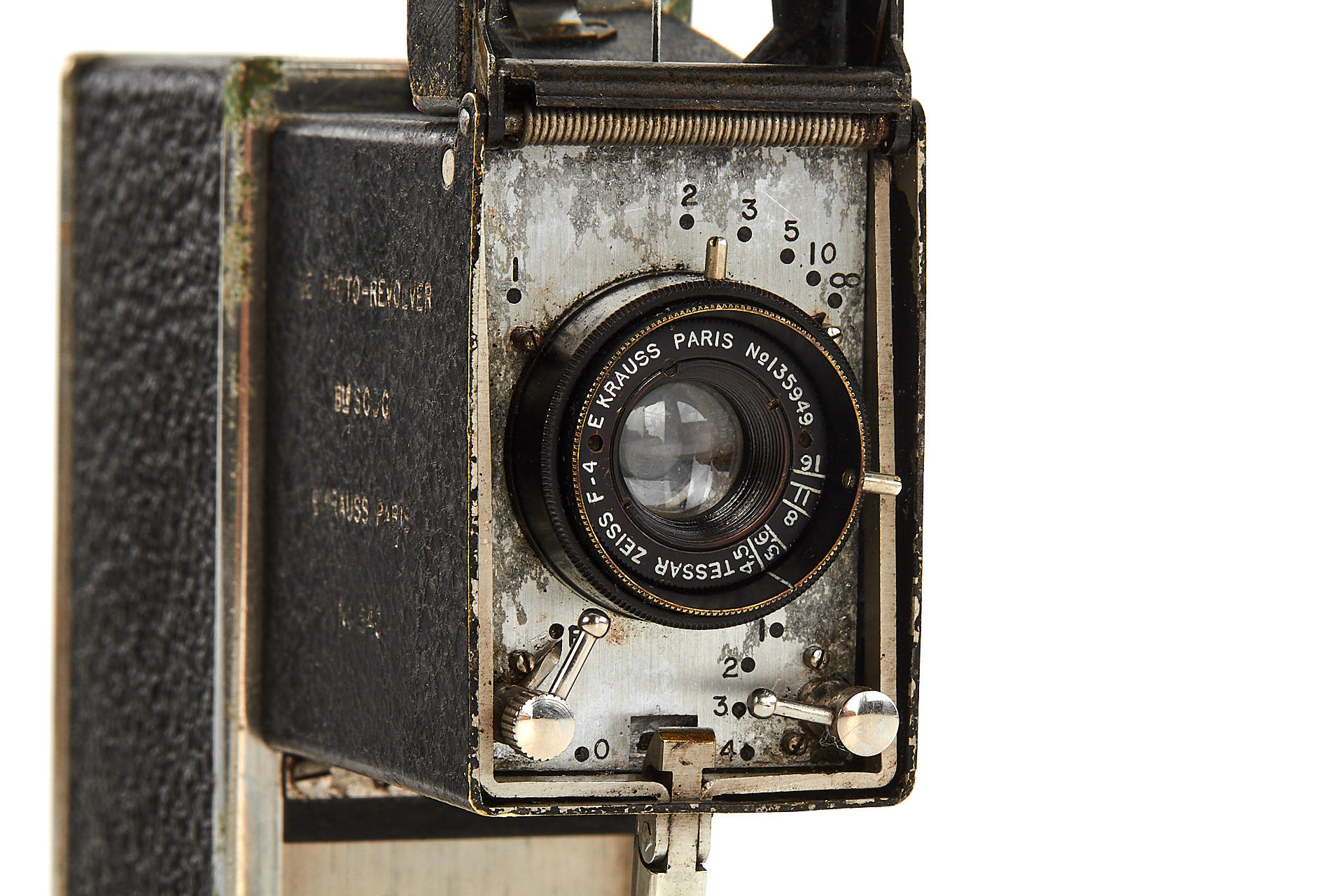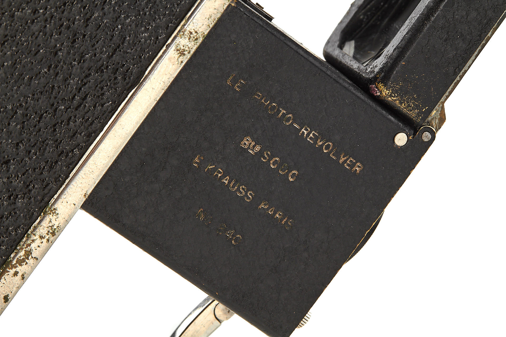 rare revolver-shaped detective camera for 18x35mm exposures, in original condition, with a roll film back, Zeiss Tessar f:4 lens no.135949, engraved on the side 'Le Photo-Revolver Bte SGDG E. Krauss Paris', with soft case
