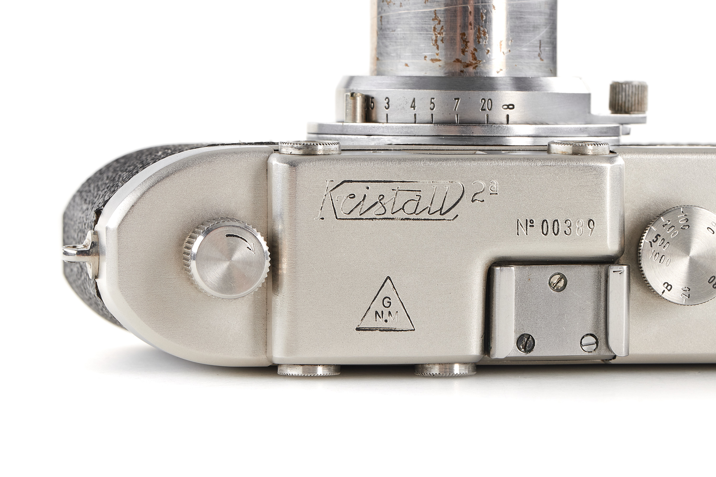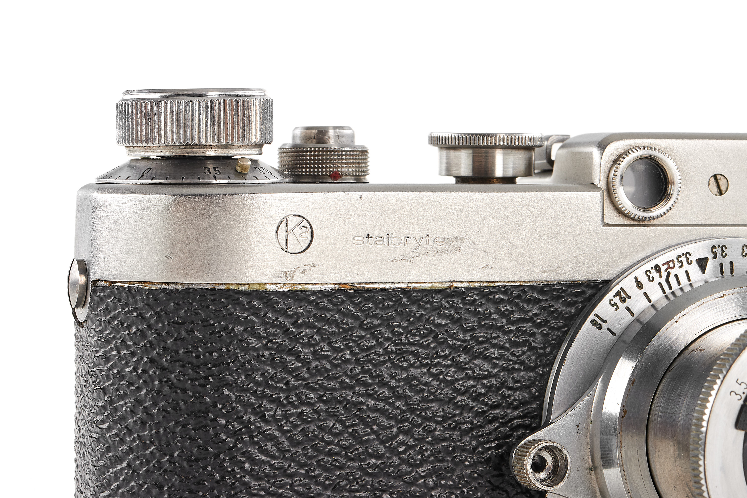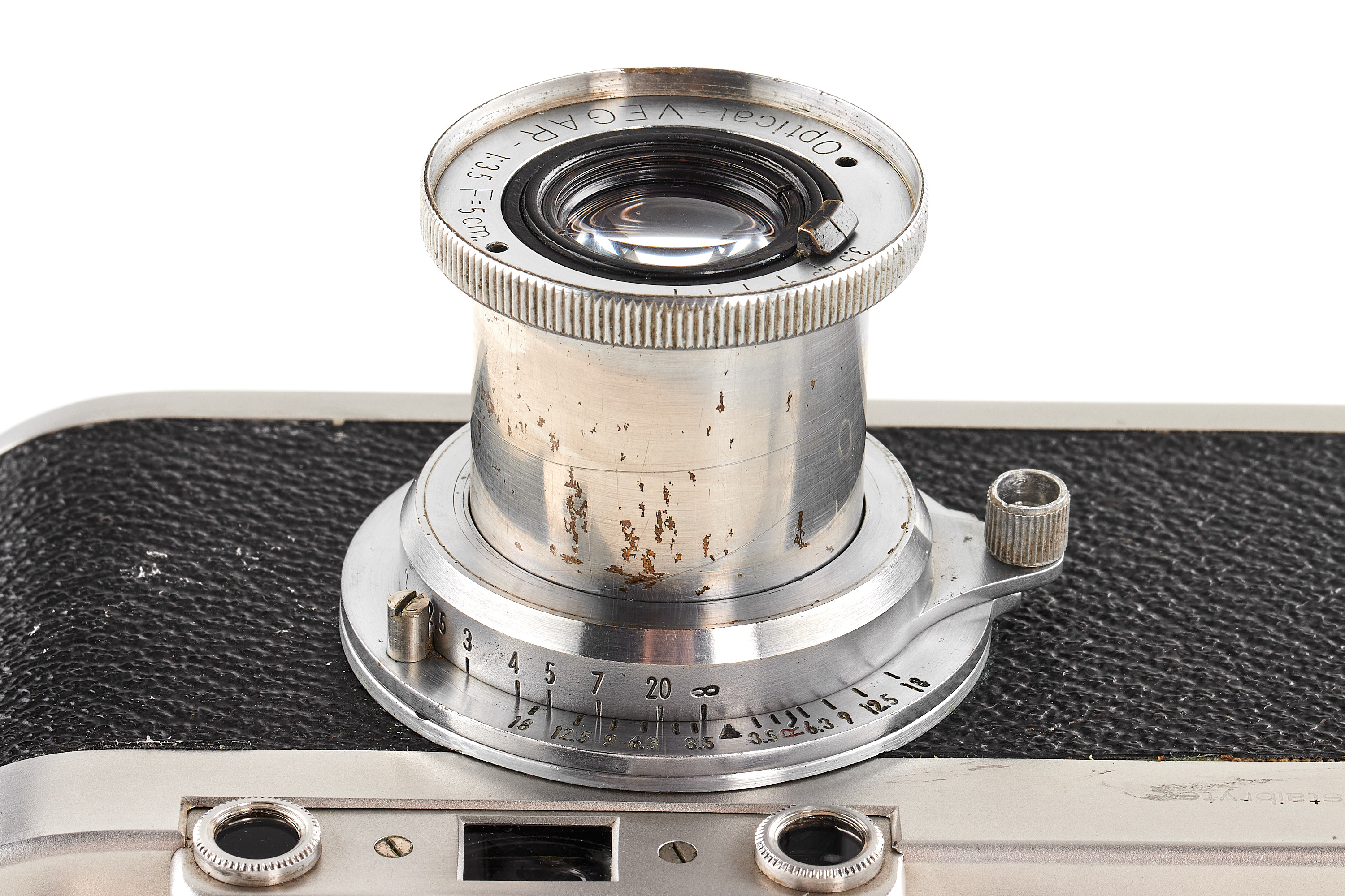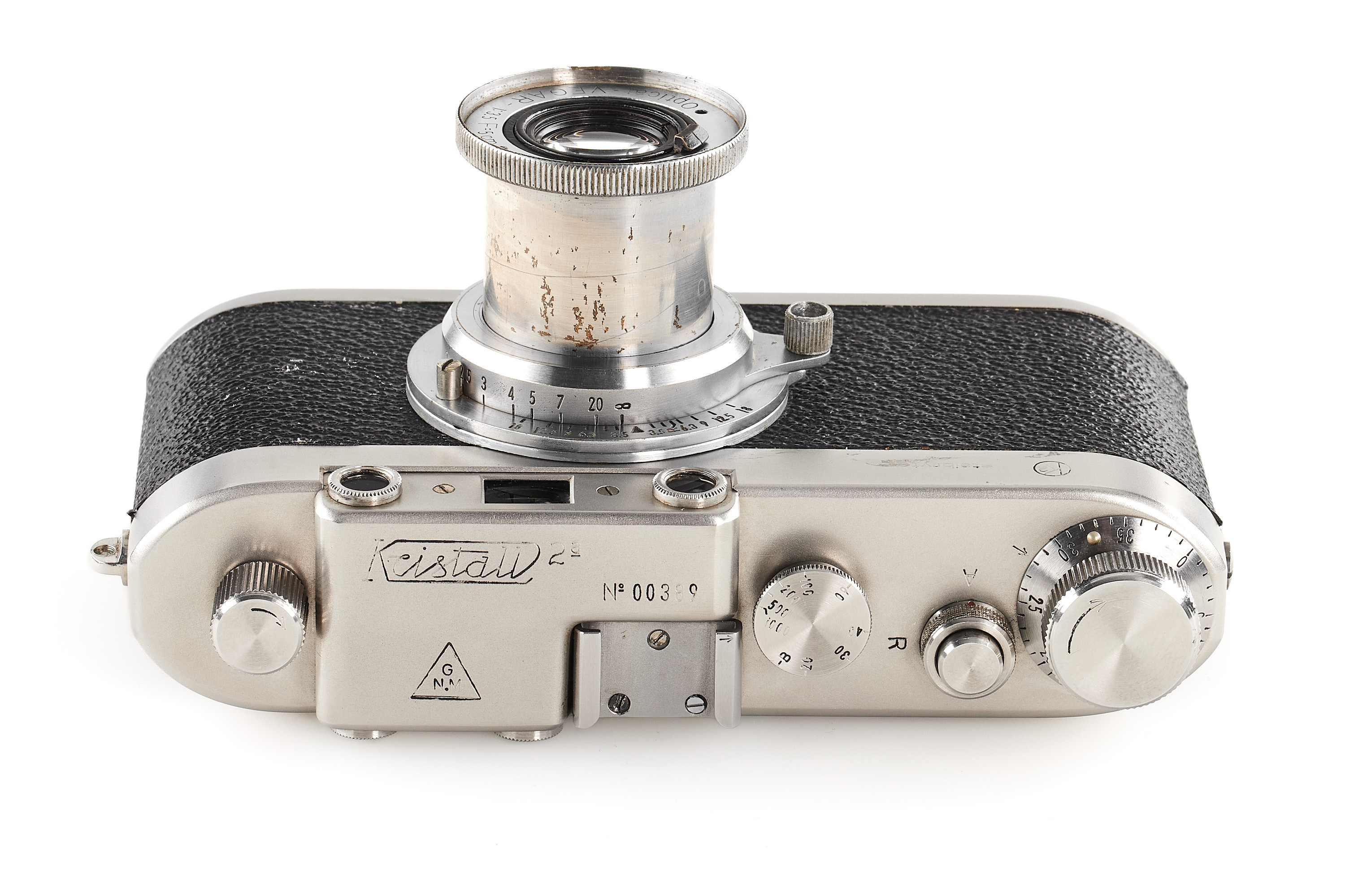 The first camera built in stainless steel. The pre-series of 10 cameras of the IIa model later produced was made of heavy nickel-plated steel and bore the wrong logo "staibryte" instead of "staybrite". Some of these devices have on the front a small brand with the letters K2 enclosed in a circle; some authors associate this mark with the conquest of the K2 summit by Italian climbers, but this hypothesis is uncertain. The offered camera is in excellent condition, comes with a matching chrome Optical-Vegar 3.5/5cm (M39 mount, in good condition with original cap, missing infinity lock), and a leather case.