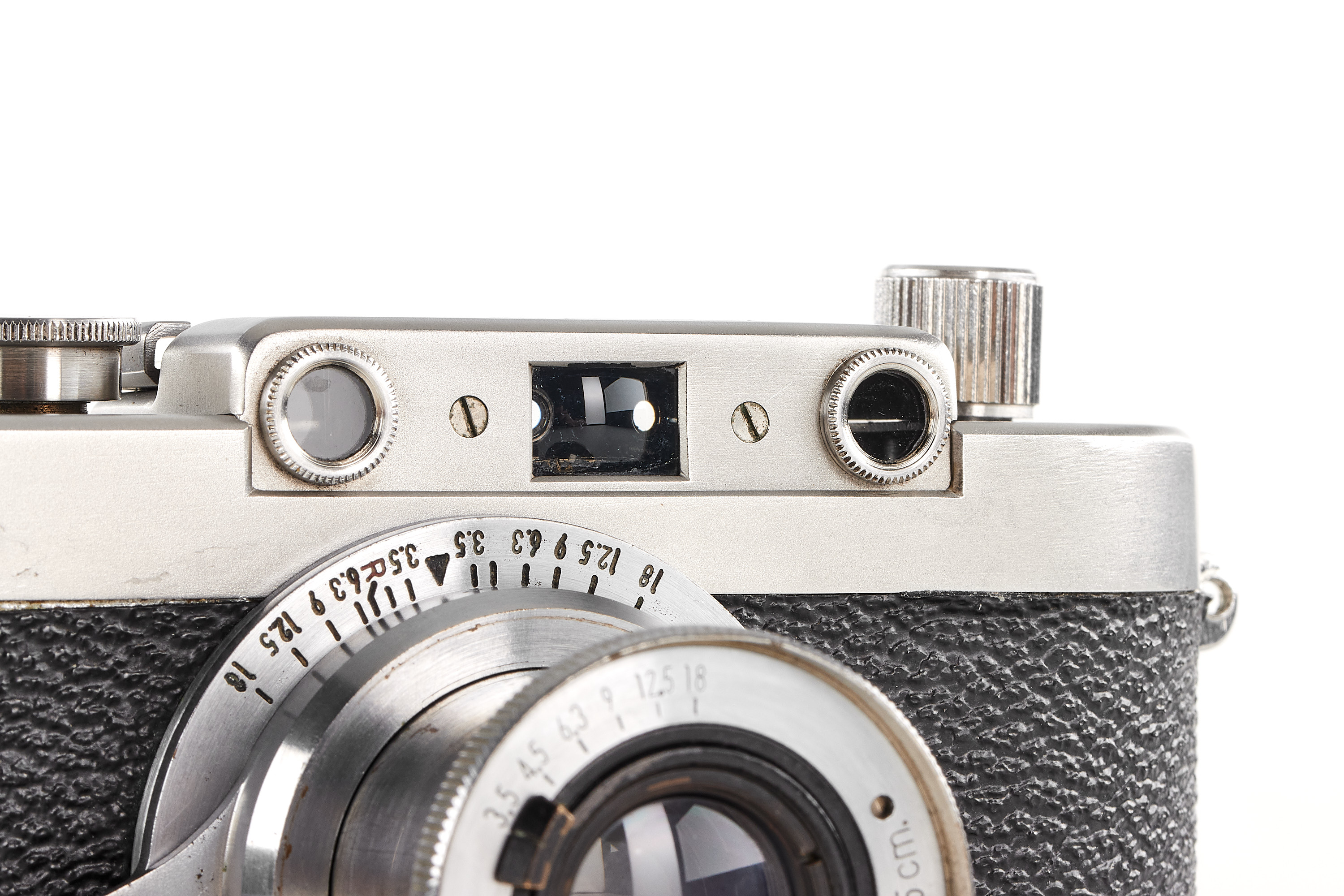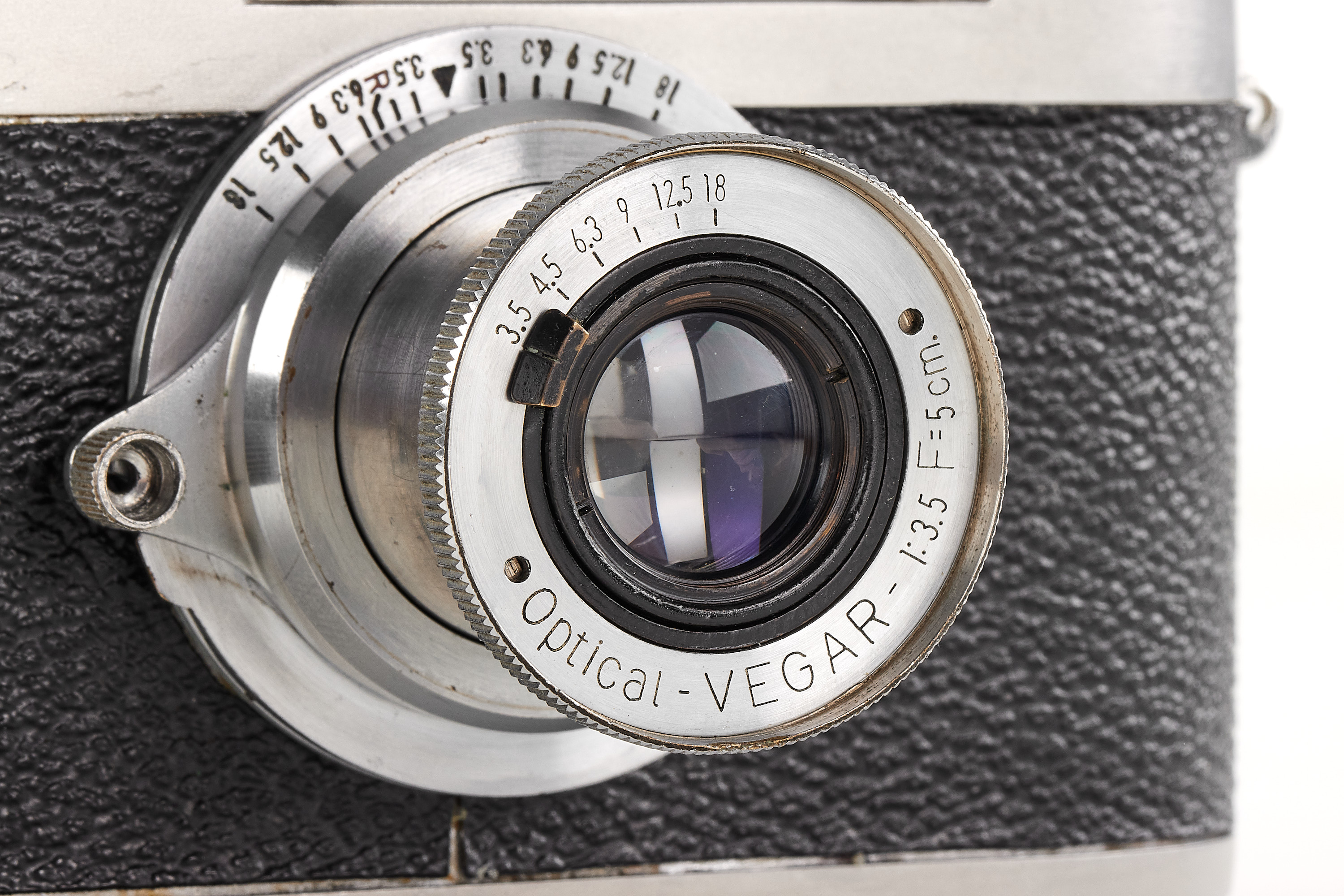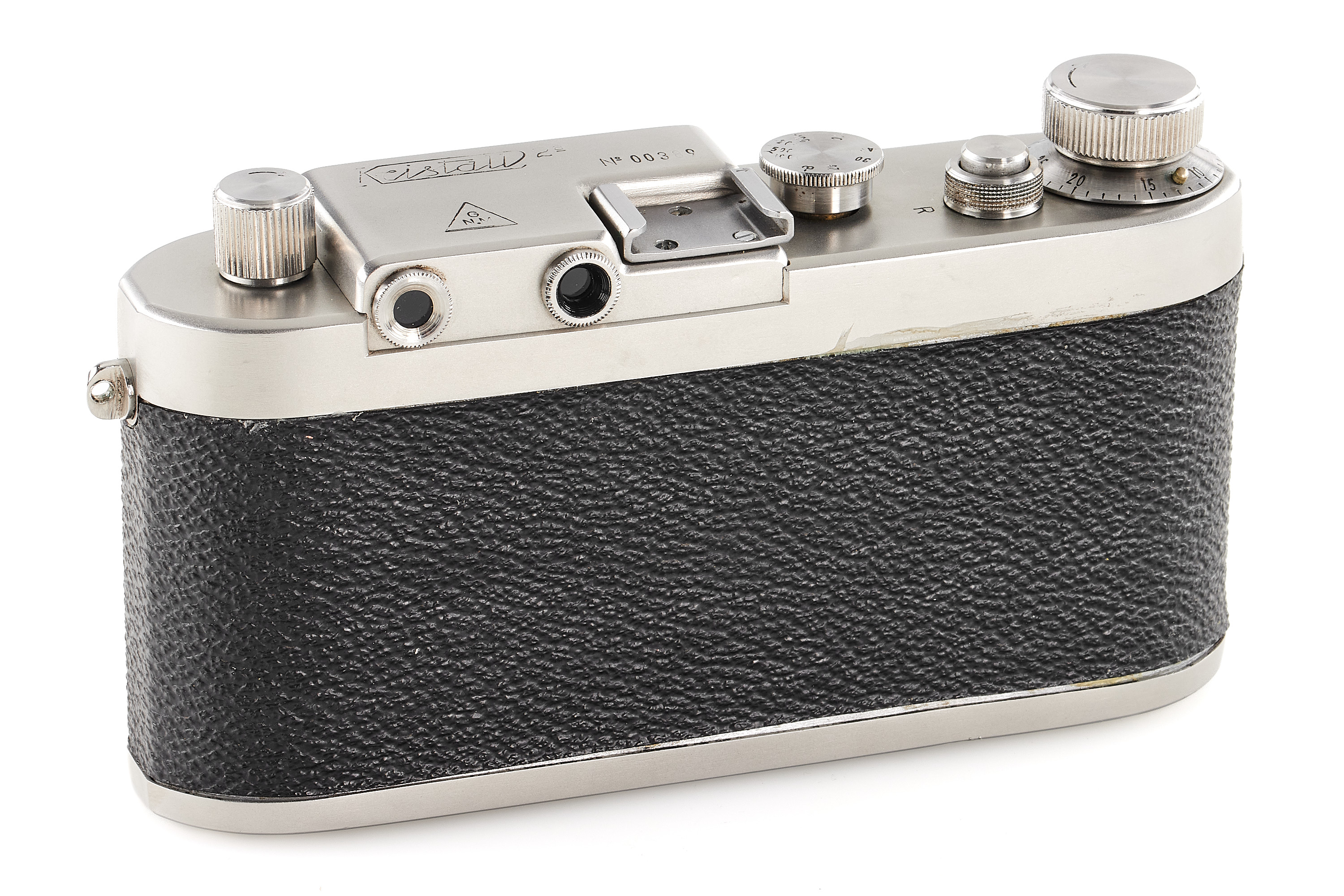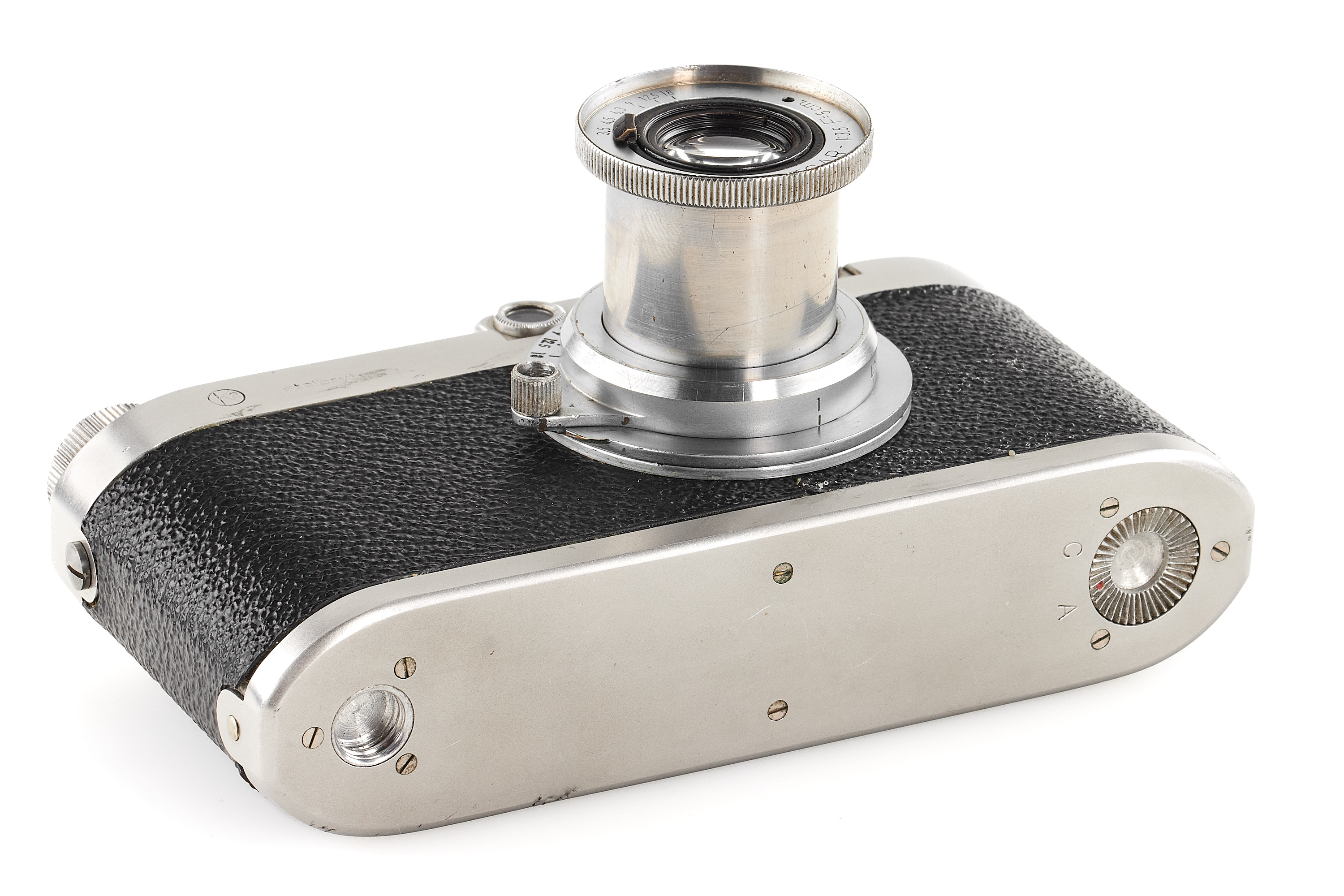 The first camera built in stainless steel. The pre-series of 10 cameras of the IIa model later produced was made of heavy nickel-plated steel and bore the wrong logo "staibryte" instead of "staybrite". Some of these devices have on the front a small brand with the letters K2 enclosed in a circle; some authors associate this mark with the conquest of the K2 summit by Italian climbers, but this hypothesis is uncertain. The offered camera is in excellent condition, comes with a matching chrome Optical-Vegar 3.5/5cm (M39 mount, in good condition with original cap, missing infinity lock), and a leather case.
