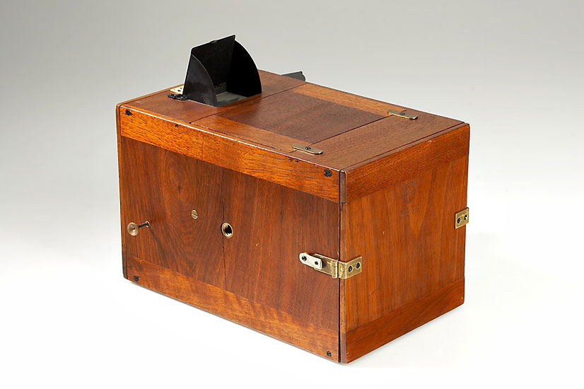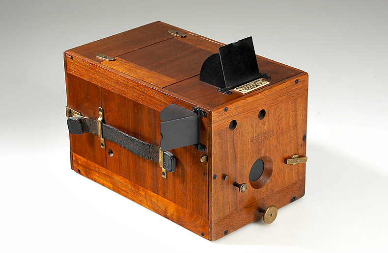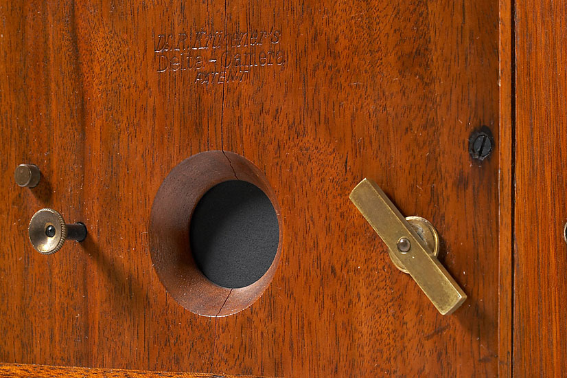 9x12cm detective camera, polished wood with magazine for 12 plates, brass fittings, Rectilinear lens with guillotine shutter, stamped: Dr.R.Krügener's Delta-Camera Patent, dealers plaque: A.MOLL WIEN I, TUCHLAUBEN 9, in top condition