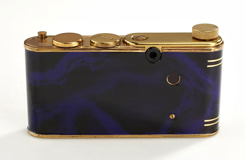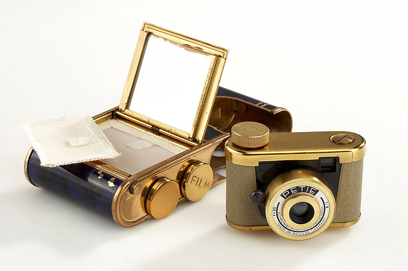 gold-colored Petie camera for 16 exposures 14x14mm with Röschlein Kreuznach Achromat 9/25mm housed in a make-up compact with mirror, blue-gold art-deco marbleised finish