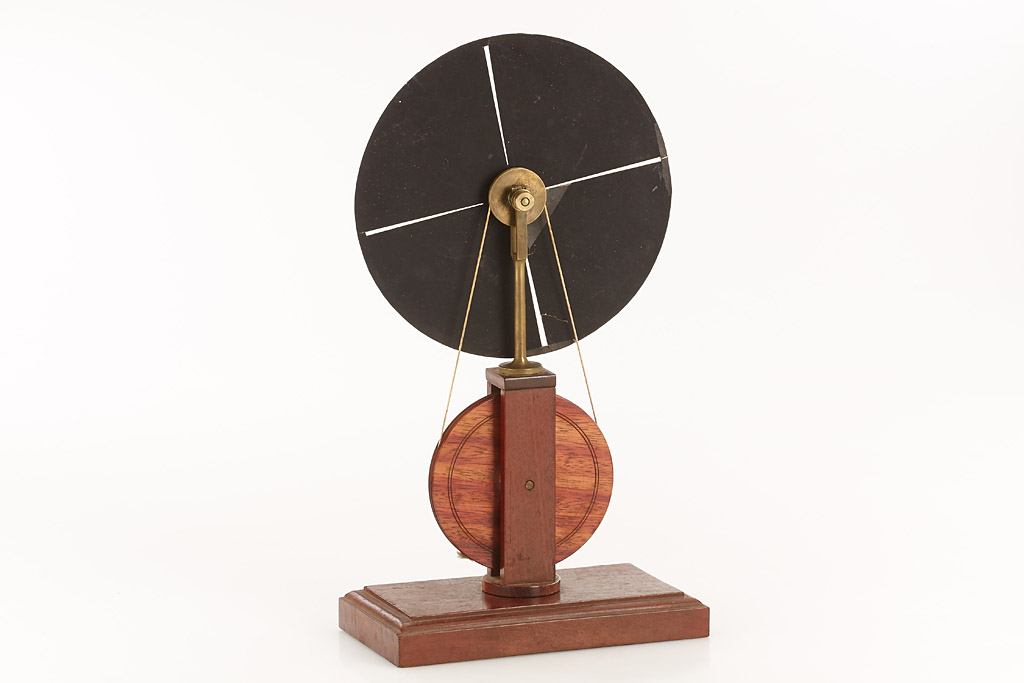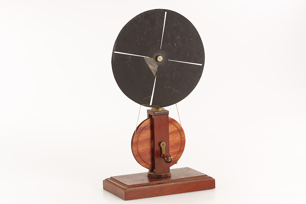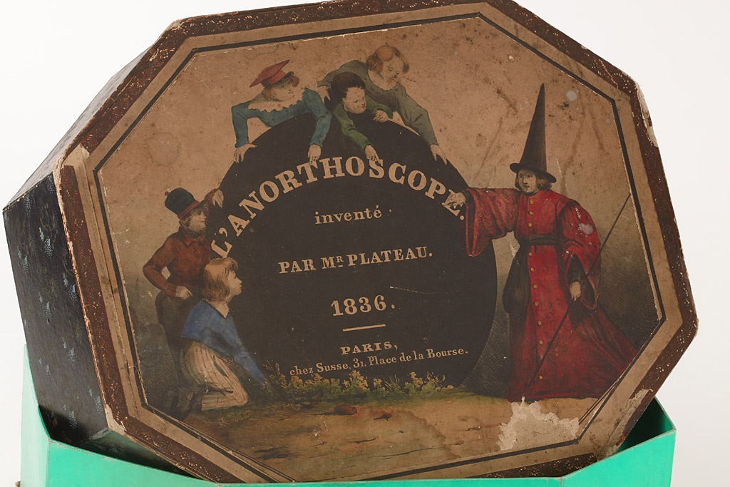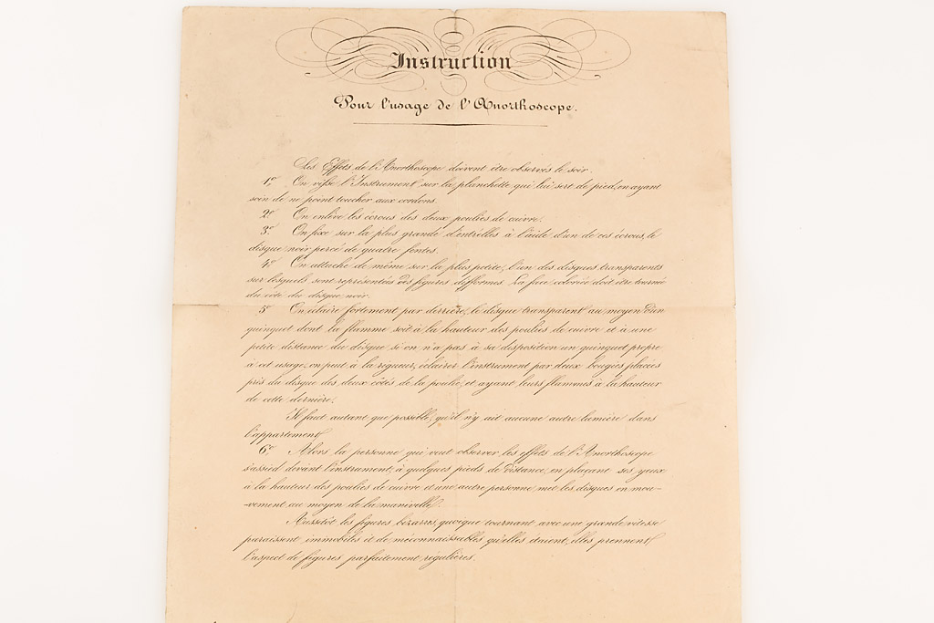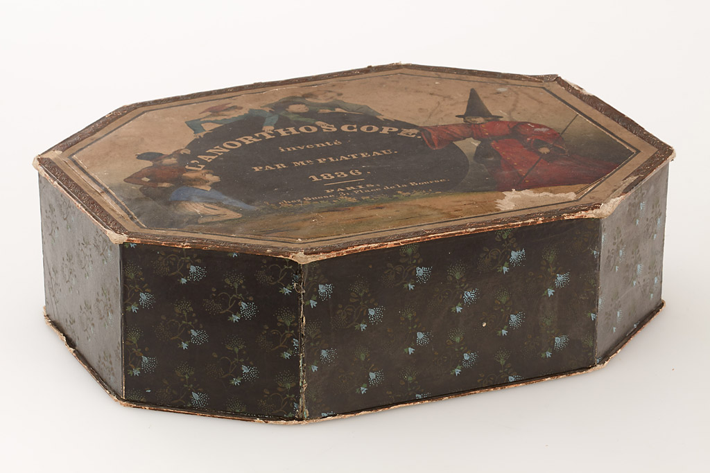 This model is extremely rare, in beautiful condition and complete with 12 anamorphic discs, mechanism, original instructions and box. It uses 2 discs spinning at different speeds to recreate a fixed image from an anamorphic one. The patent date is 1829 (i.e. before the phenakistiscope). We only know of 3 examples in collections. There is a complete example in the Nekes collection and one in the Musée Royale in Gent.