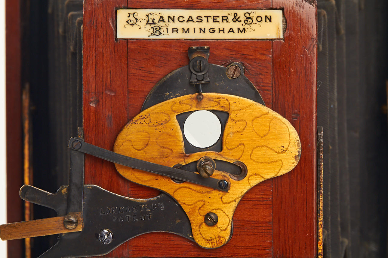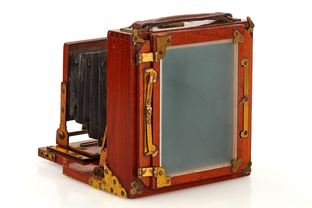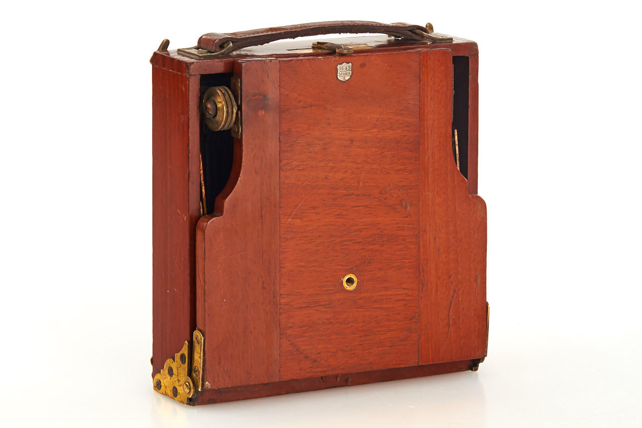 1/4-plate folding mahogany field camera, rare early version with simple lens and front shutter, in very fine condition