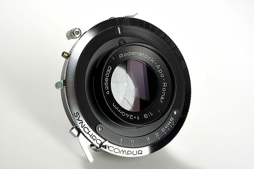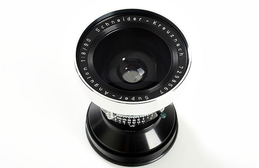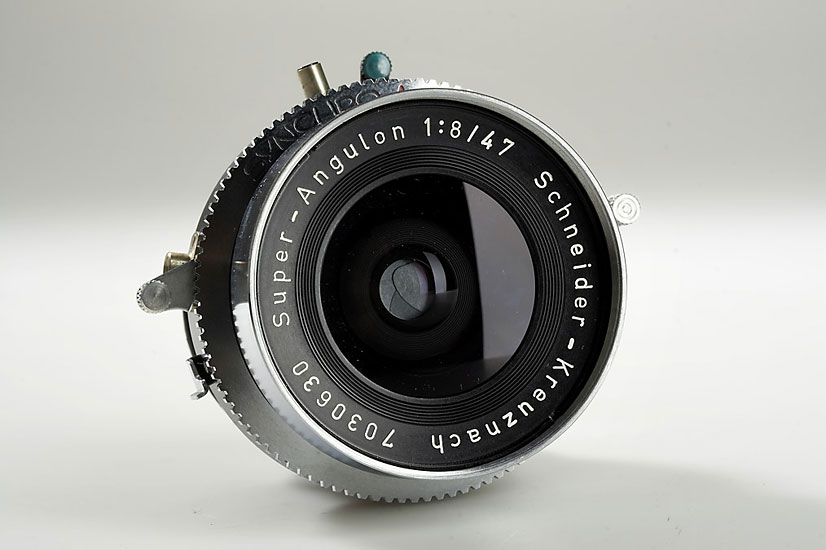Schneider Super-Angulon 8/47mm no.7030630 in Synchro-Compur shutter (mint with caps), Schneider Super-Angulon 8/90mm no.7298567 in Synchro-Compur shutter (mint with caps, maker's box), Rodenstock-Apo-Ronar 9/240mm no.4256032 in Synchro Compur shutter (mint with cap, maker's box, control card) (3)
