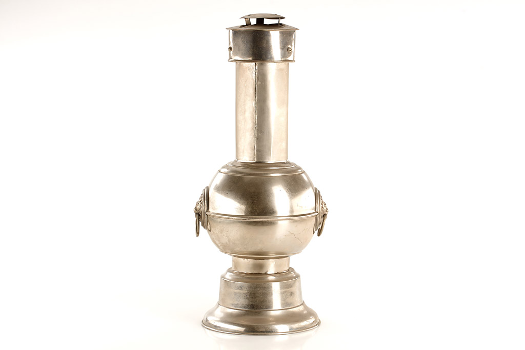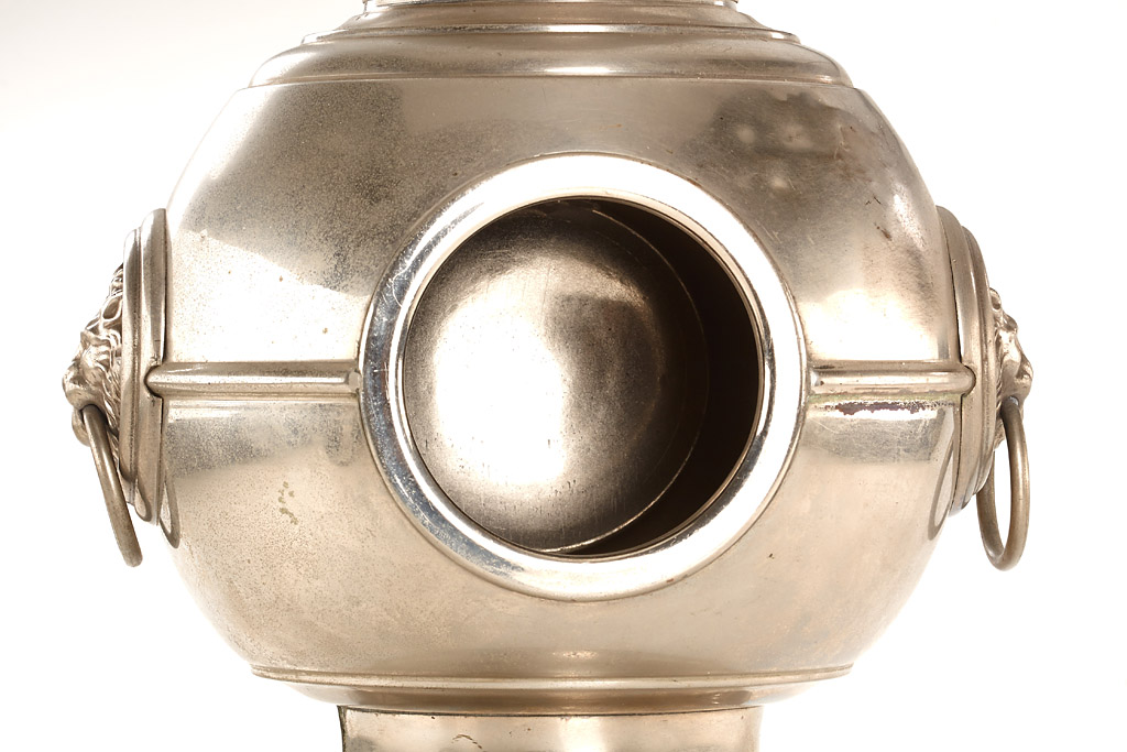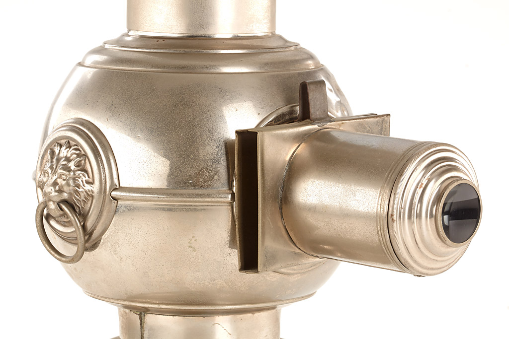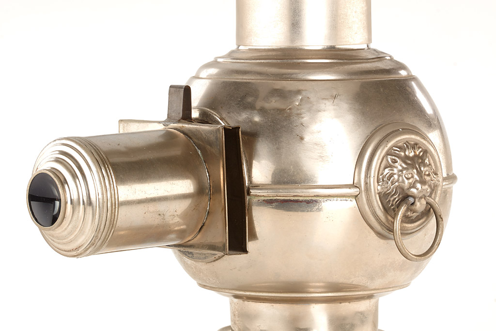 large version of the beautiful French globular lantern in very good condition, made of nickel-plated brass, embossed with a lion's head and a ring-shaped handle on either side of the lamp house, height 46cm
