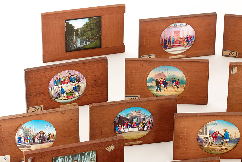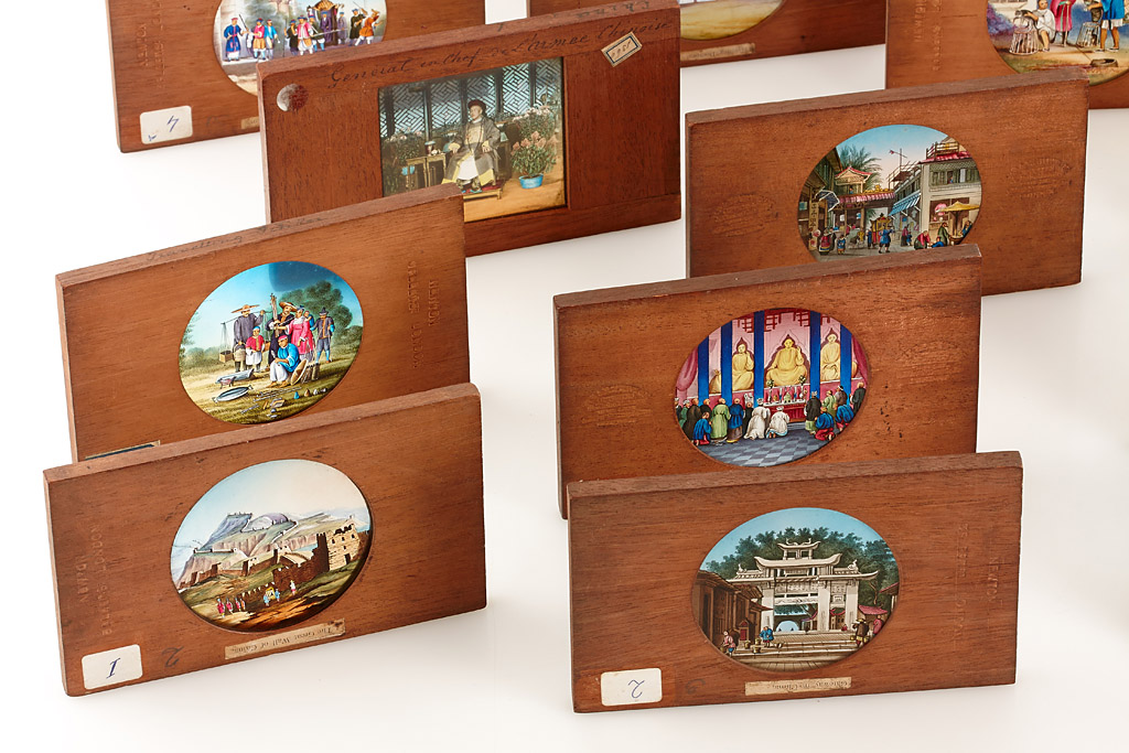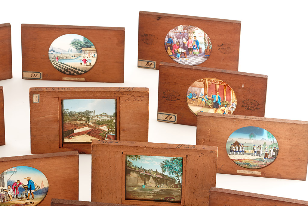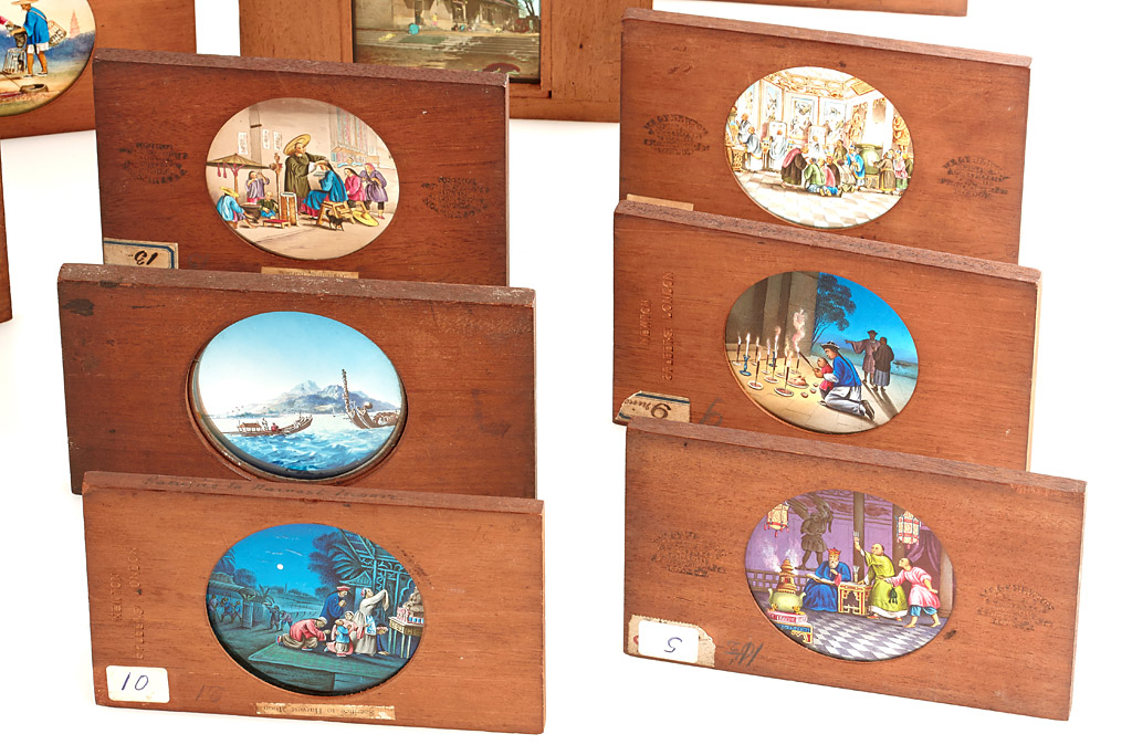 Collection of 25 English Laterna magica slides with hand-painted Chinese illustrations, made by Newton Opticians and Globe makers, 3 Fleet Street, London. A very rare set in very good original condition.