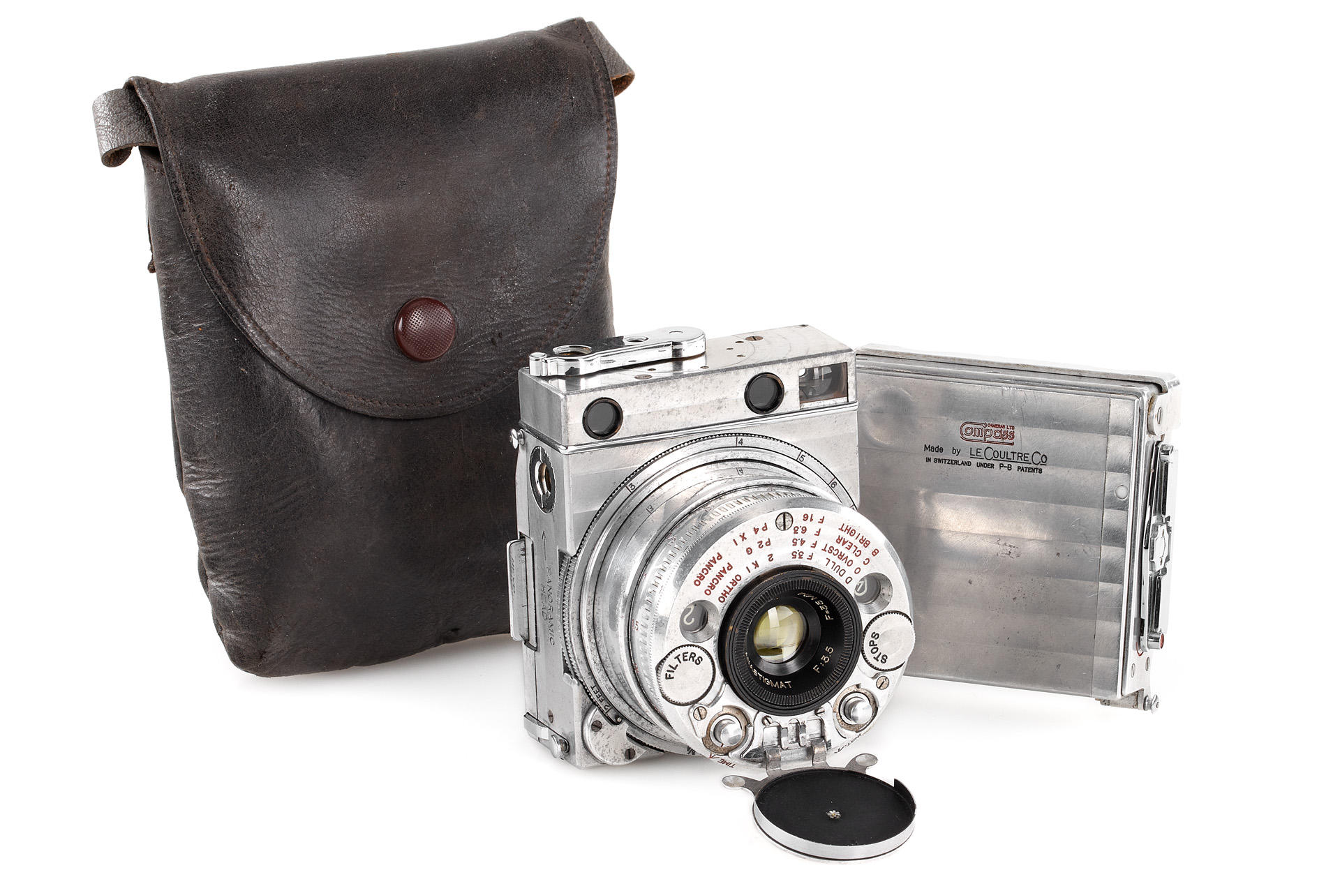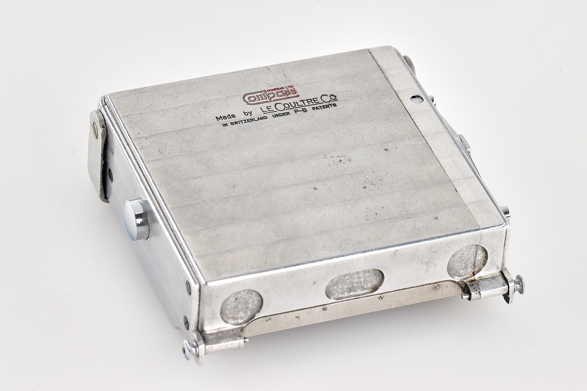 English version Compass in good condition and working order (some parts are missing), made by the famous Swiss watch manufacturer Jaeger Le Coultre, with original leather case, ground glass back and rollfilm back