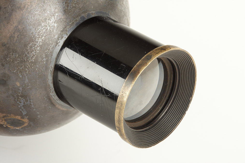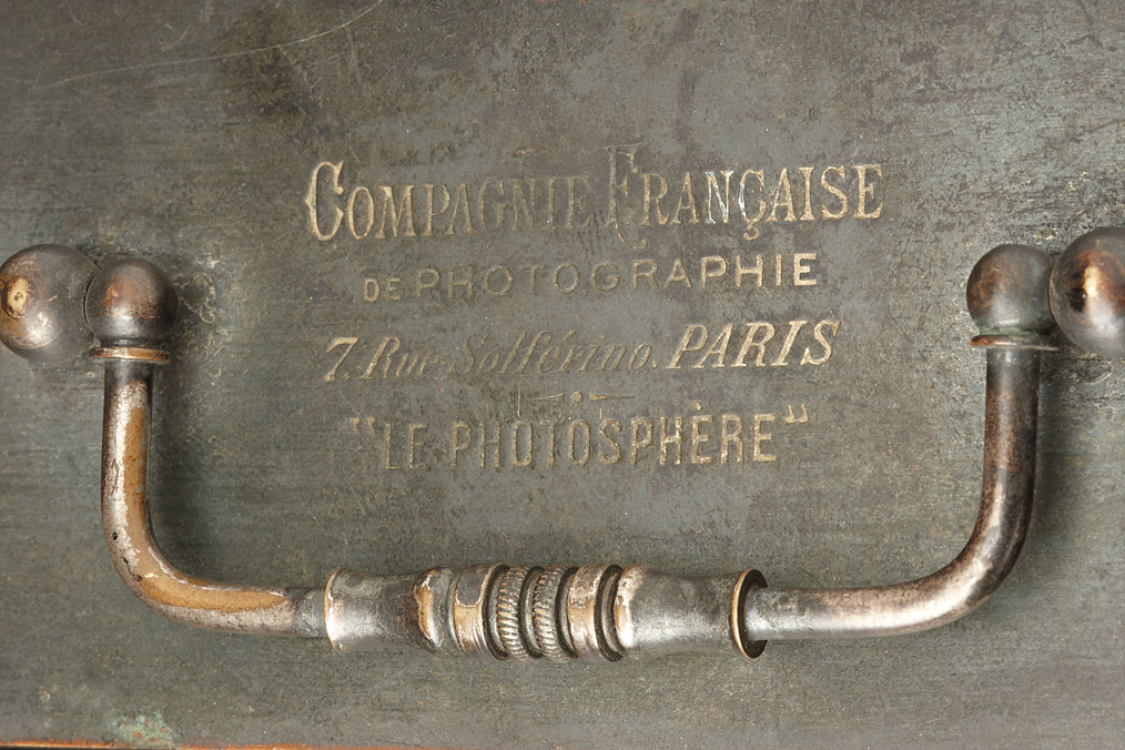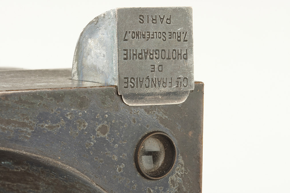very rare 13x18cm version of the classical all-metal camera with oval front, invented by Napoleon Conti in 1888 and built in different variations by Compagne Française de Photographie, Paris, dry plate camera for usage in tropical regions with spring powered hemispherical sector shutter, preset speed and aperture, two integrated reflecting view-finder with hinged covers, two integrated spirit levels on the top and on the left side, good original condition with the original lens (8/180mm Rectilinear), comes with the very rare roll film magazine back.