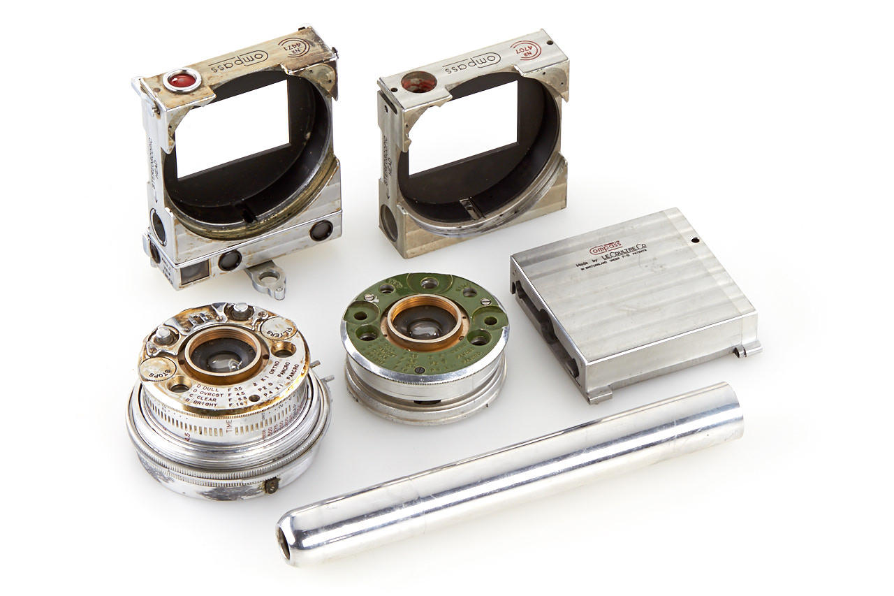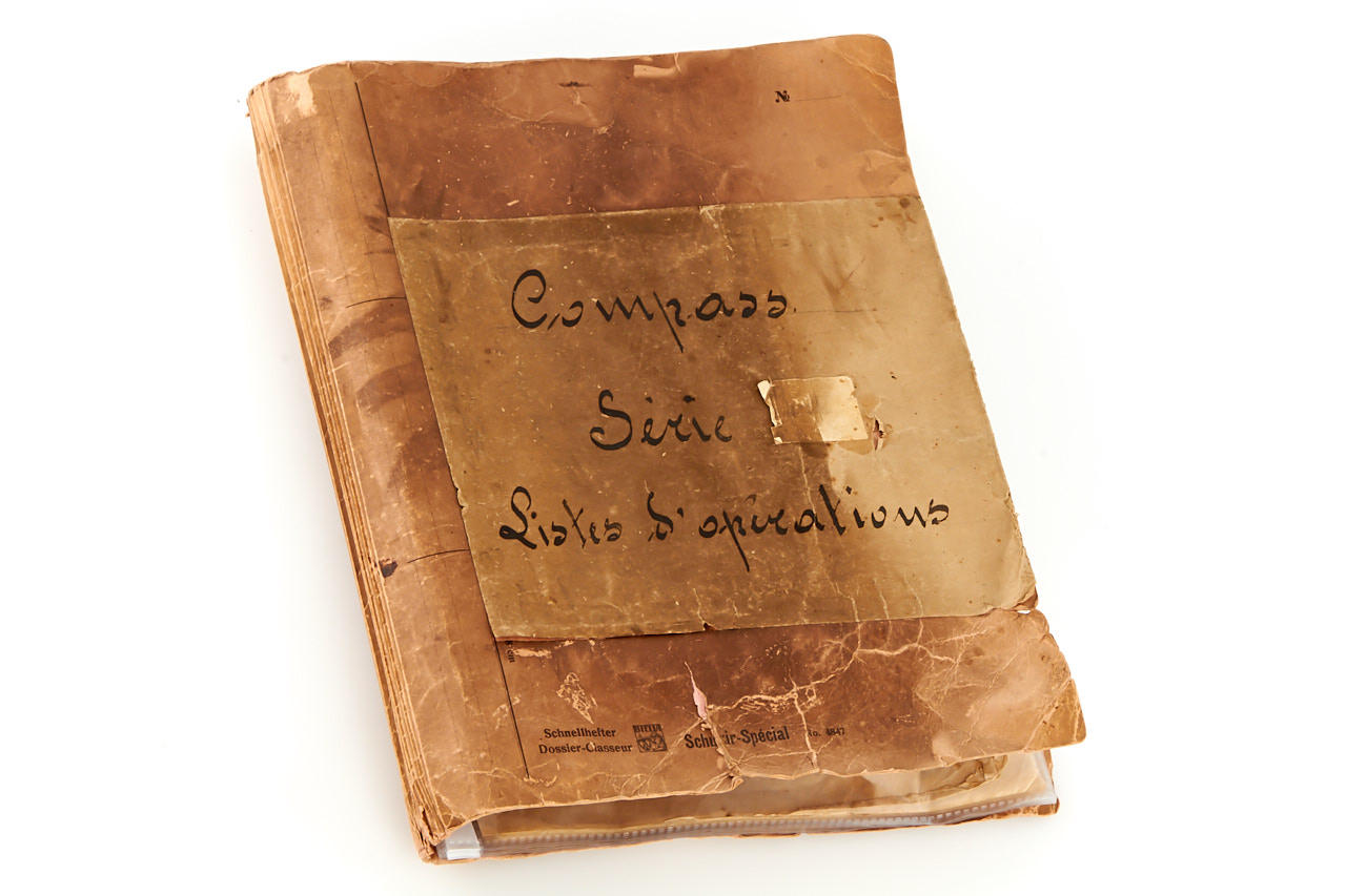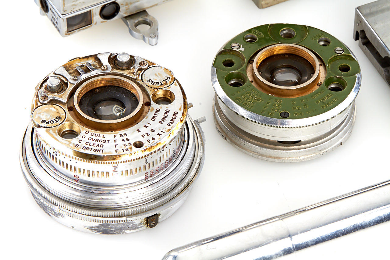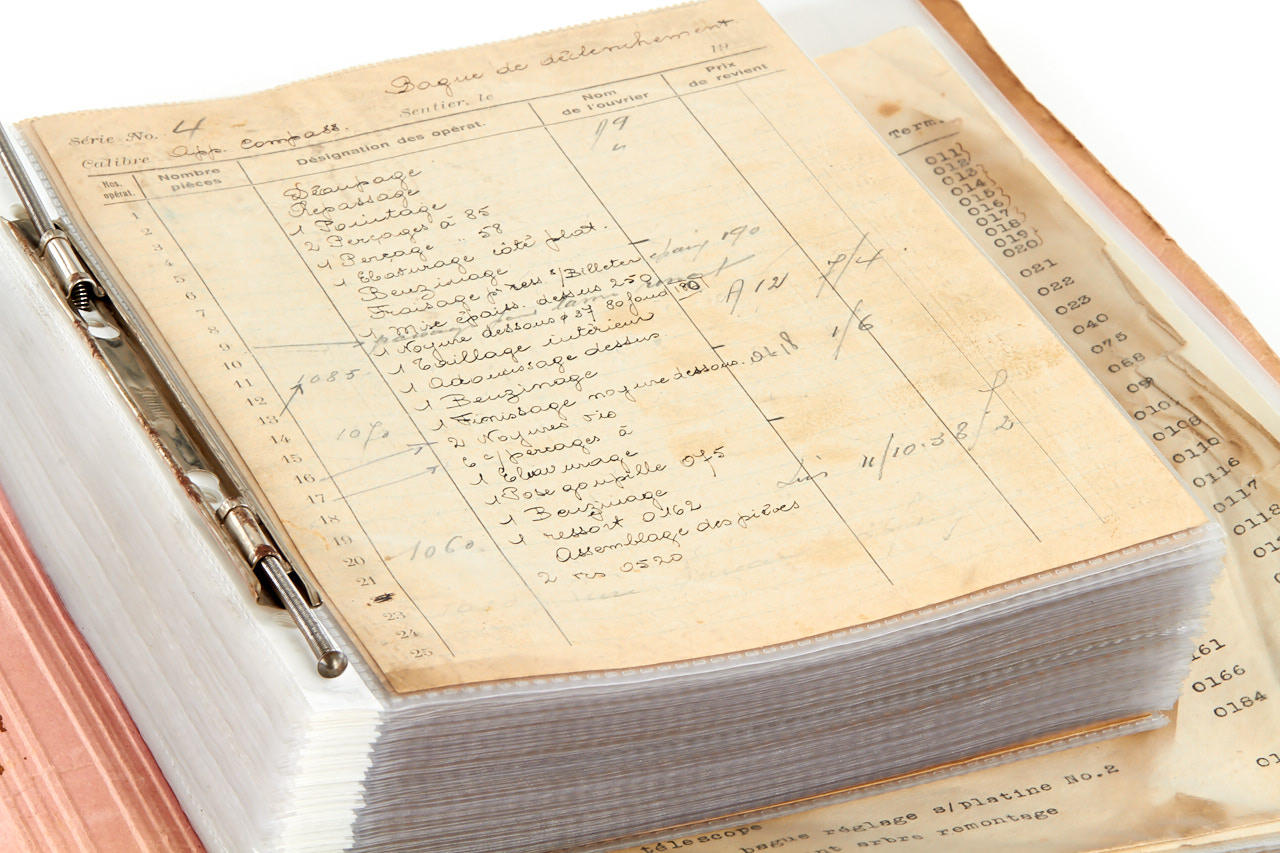 various parts incl. an incomplete camera no.4471, shutter/lens assembly, tripod housing, rollfilm back housing, camera housing no.4707, with original service archive pages for many cameras and spare parts/assembly lists in large folder