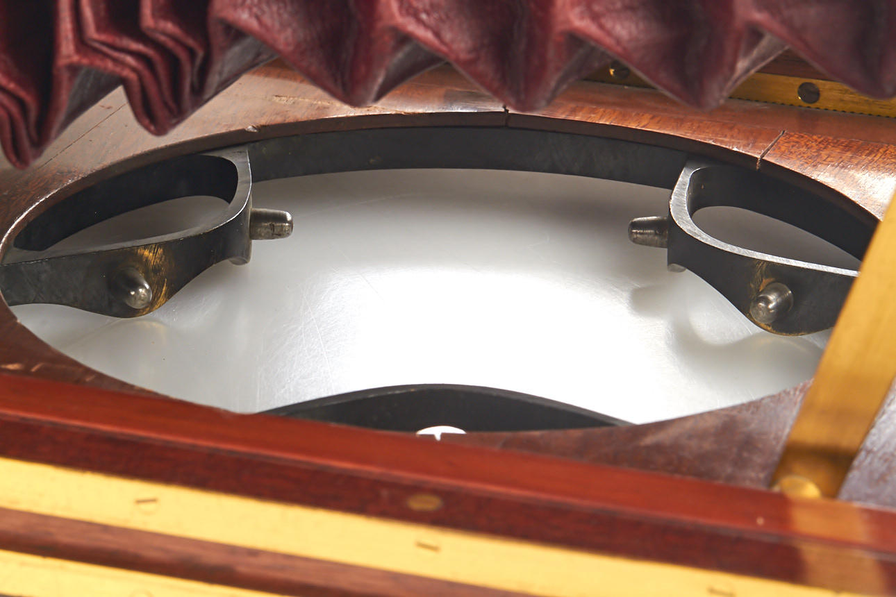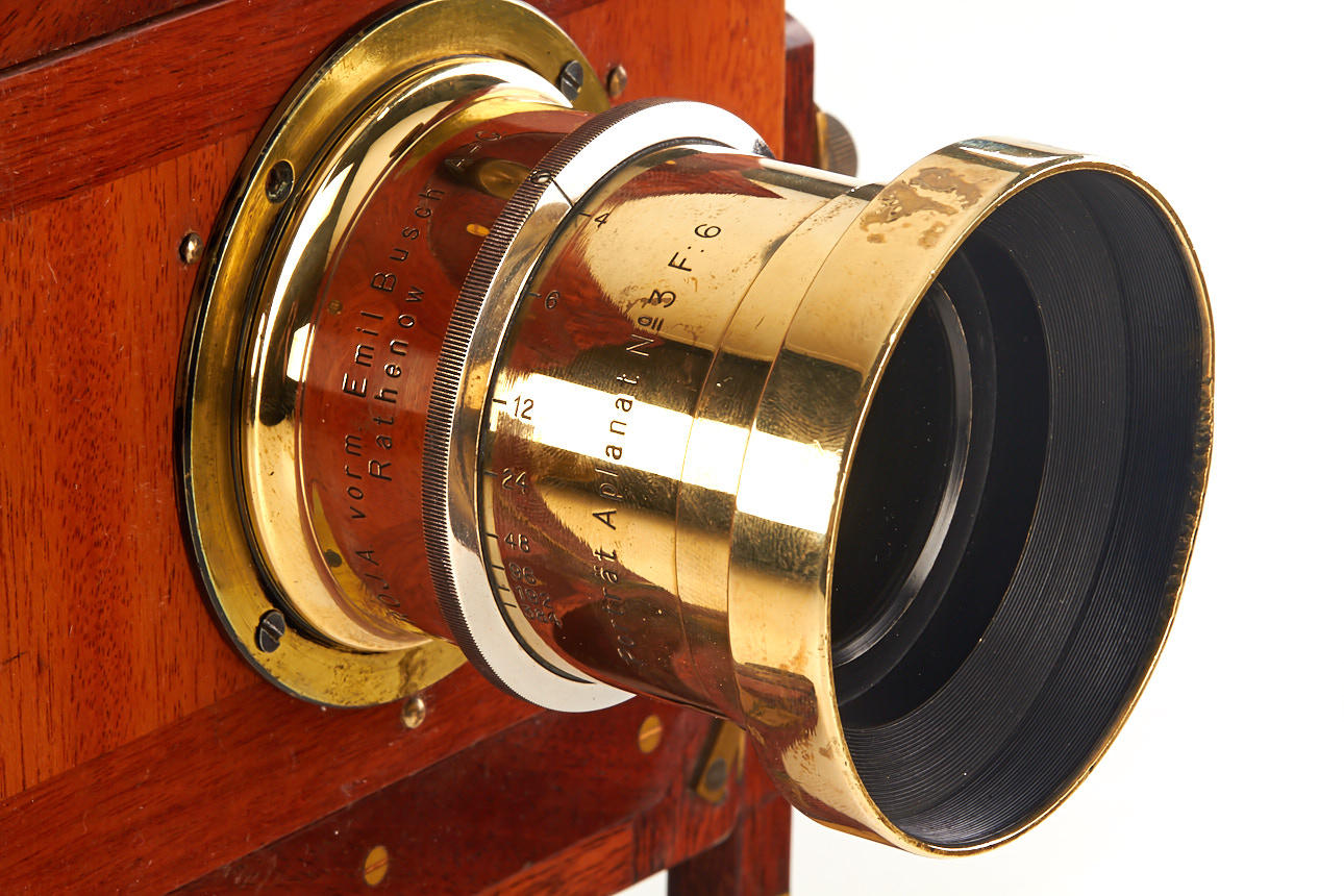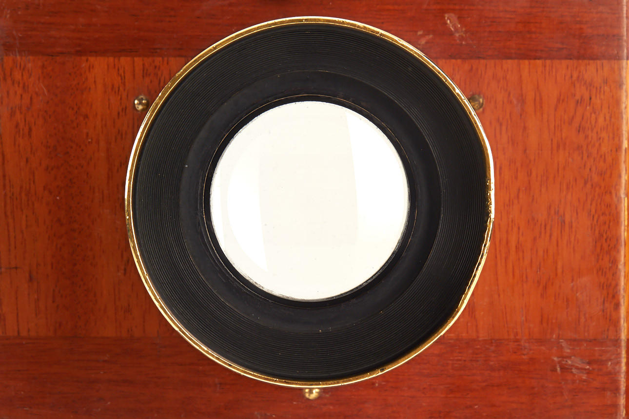 18x24cm mahogany field camera in excellent condition, original red bellows, with R.O.J.A. Porträt Aplanat No3 F:6 (clean optics, working iris diaphragm)