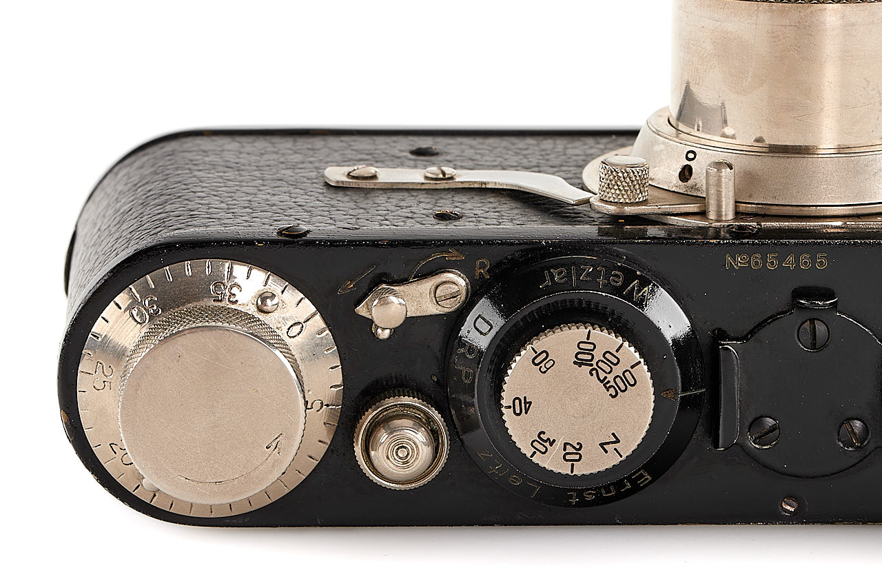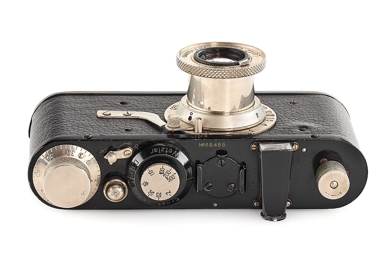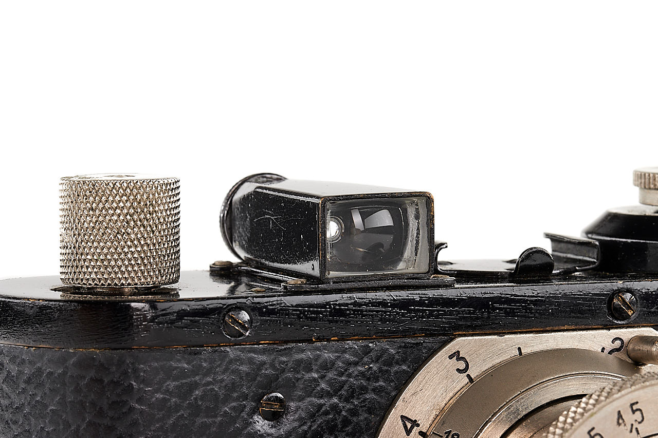 Very ingenious Soviet copy of a never-produced Leica I Mod. A Elmar for left-handed, most probably based on a soviet camera, in near-mint condition and working order, inverted focusing and winding, a similar chrome version is shown in Jean-Loup Princelle 'The Authentic Guide to Russian and Soviet Cameras' p.101.