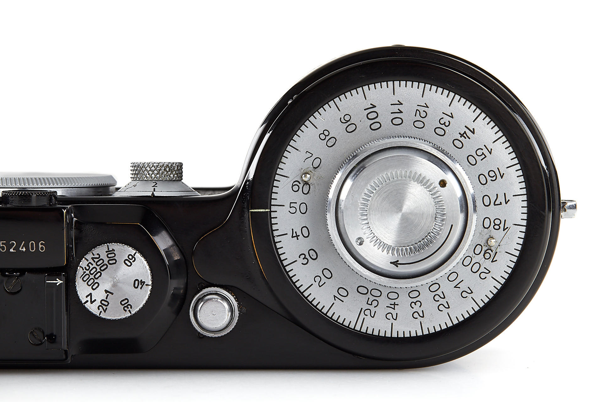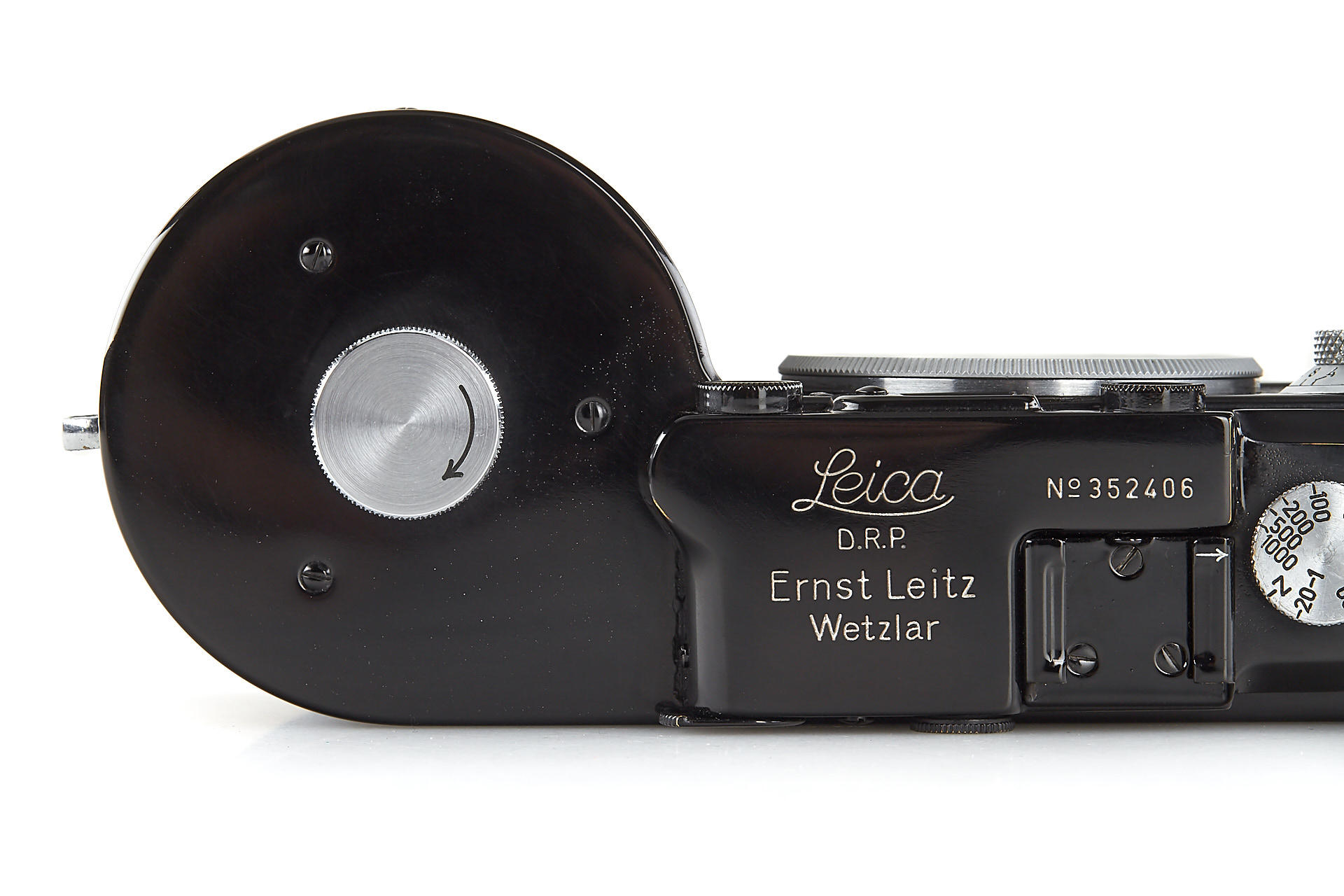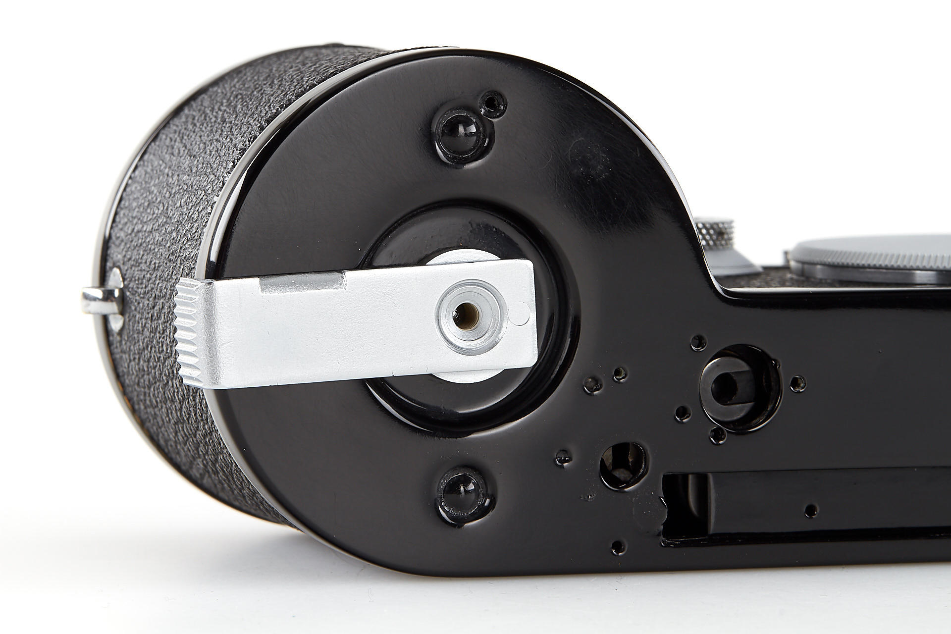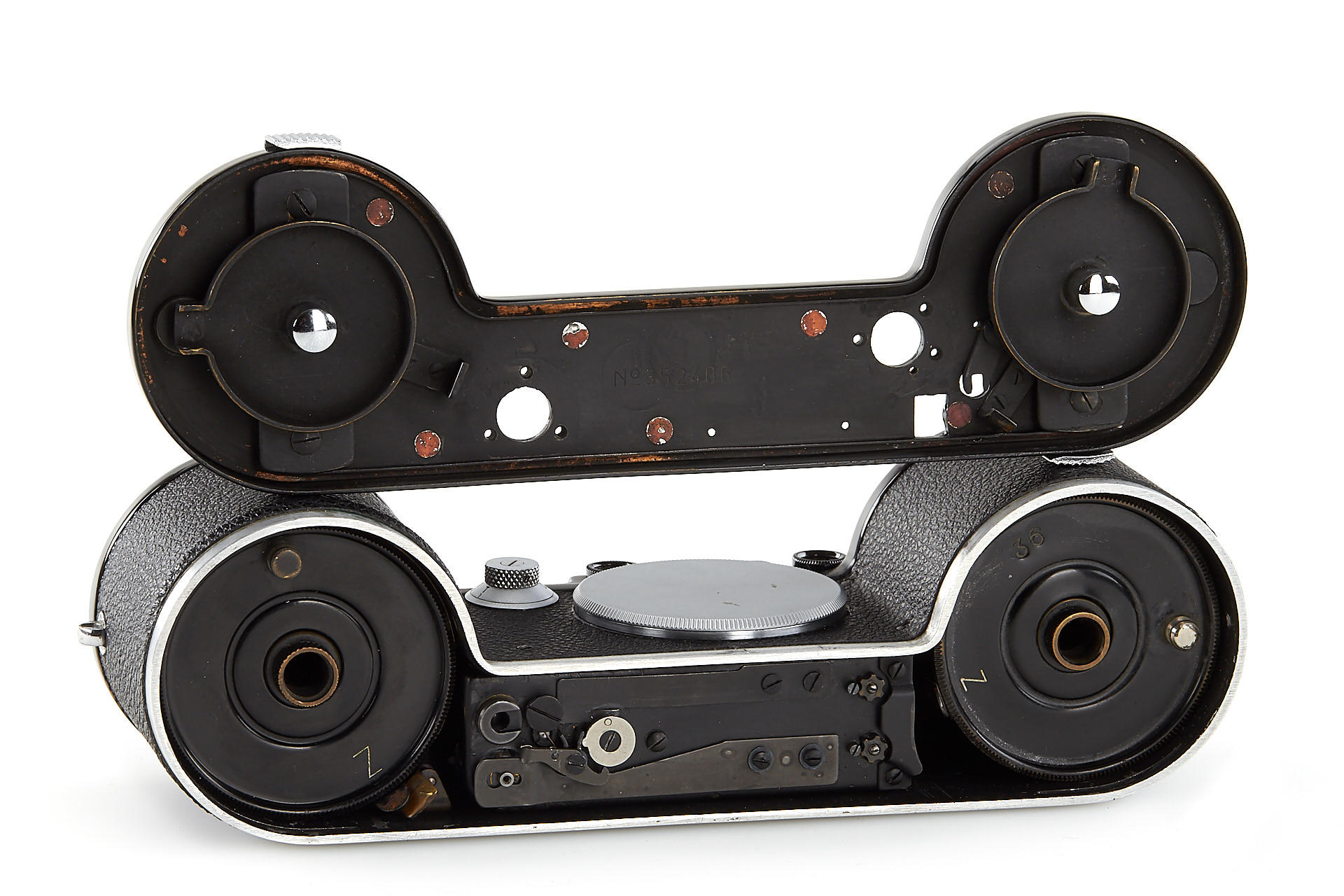 a very interesting Leica 250, equipped with motor-coupling, the base plate of the camera is actually an original top plate from the famous motor drive MOOEV - it is also engraved with the matching serial number 352406, the camera and the base plate are in excellent condition (both have been restored to present condition around 1950, the Vulkanite has been replaced with faux leather), a very interesting historical set