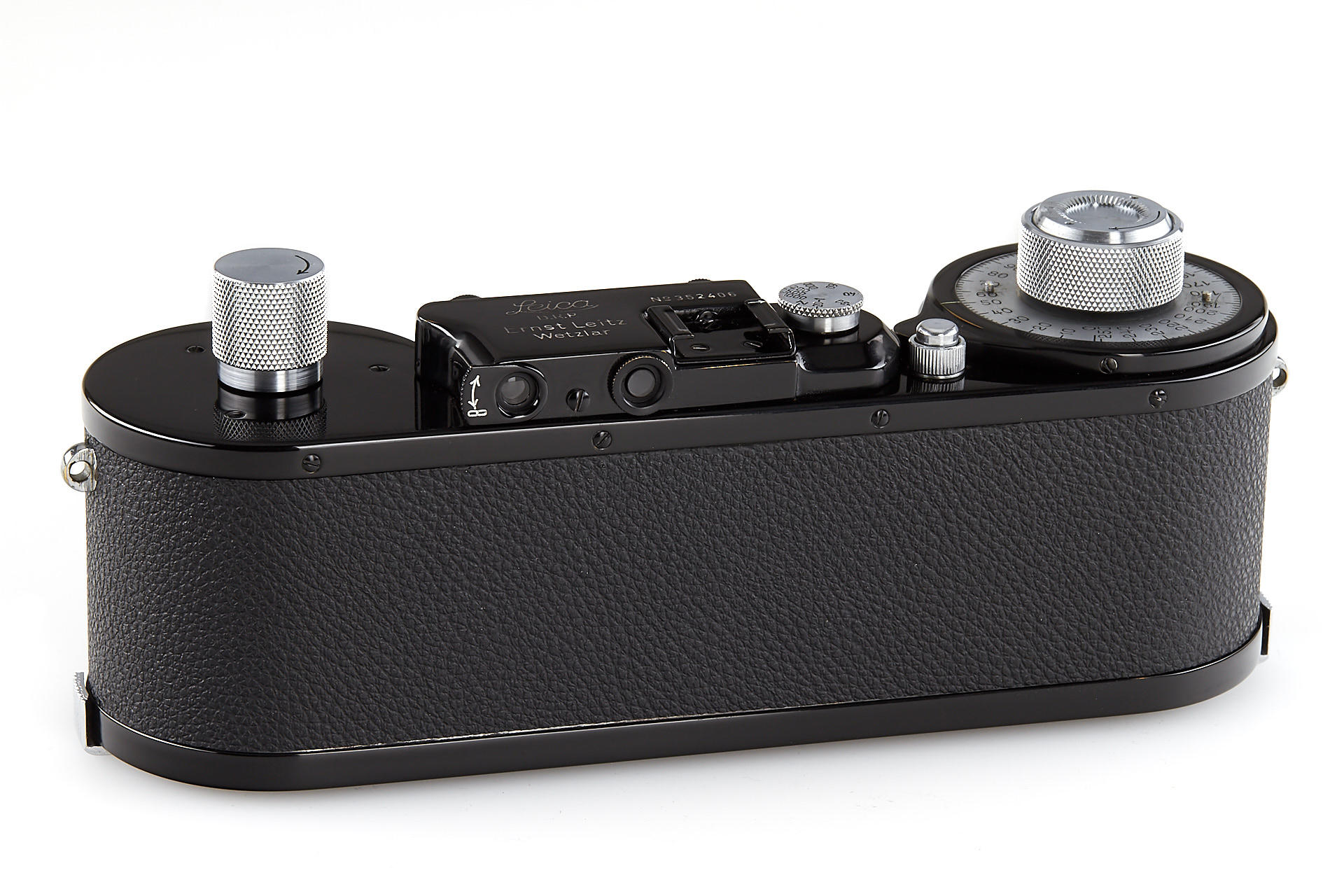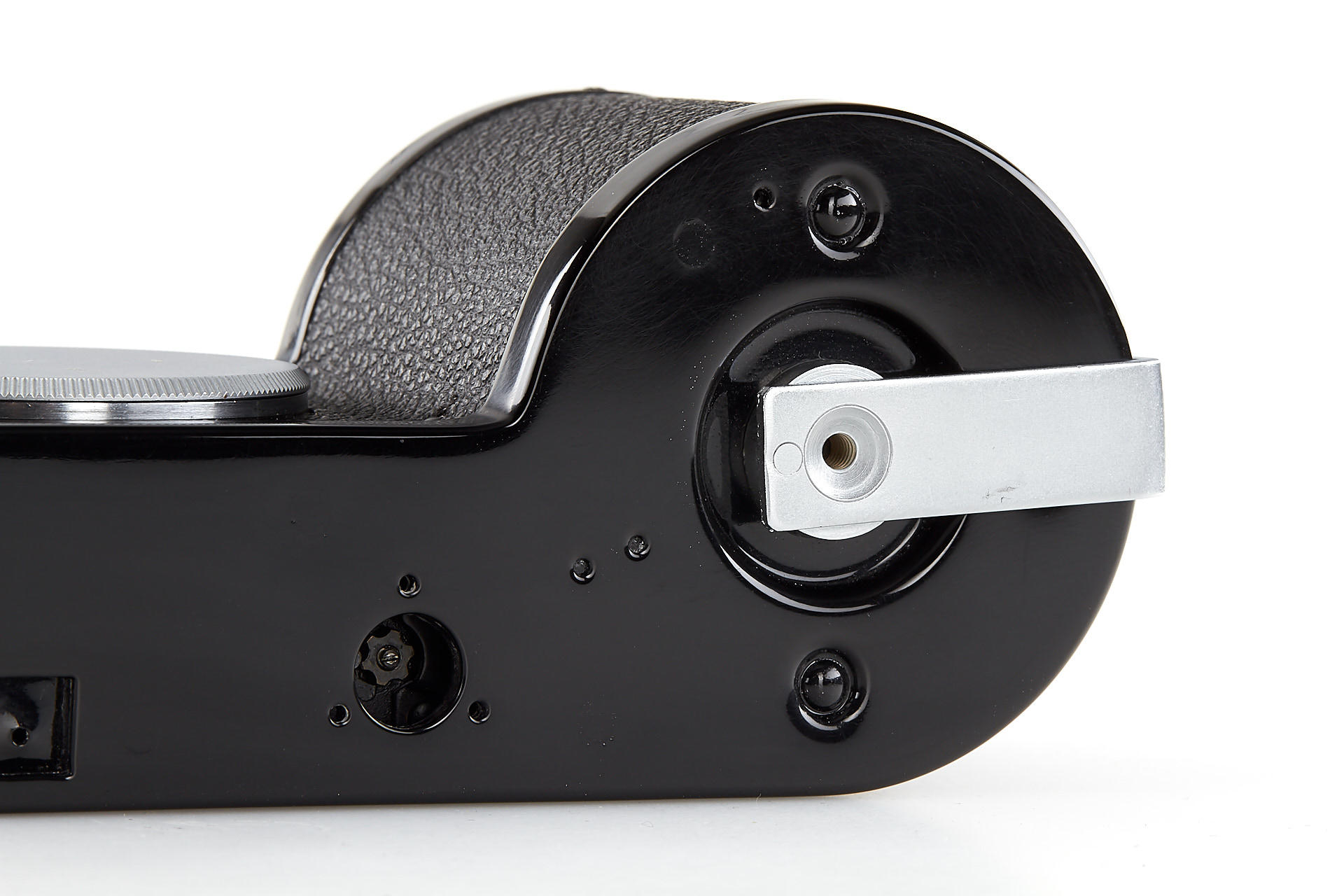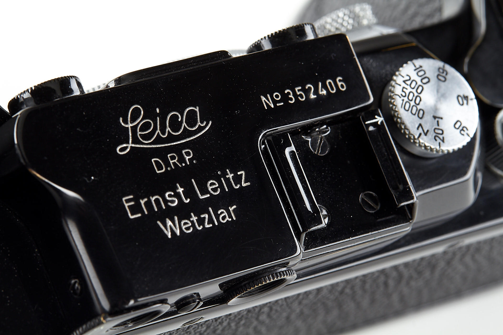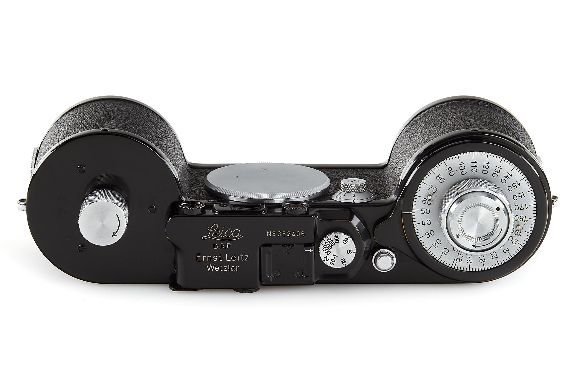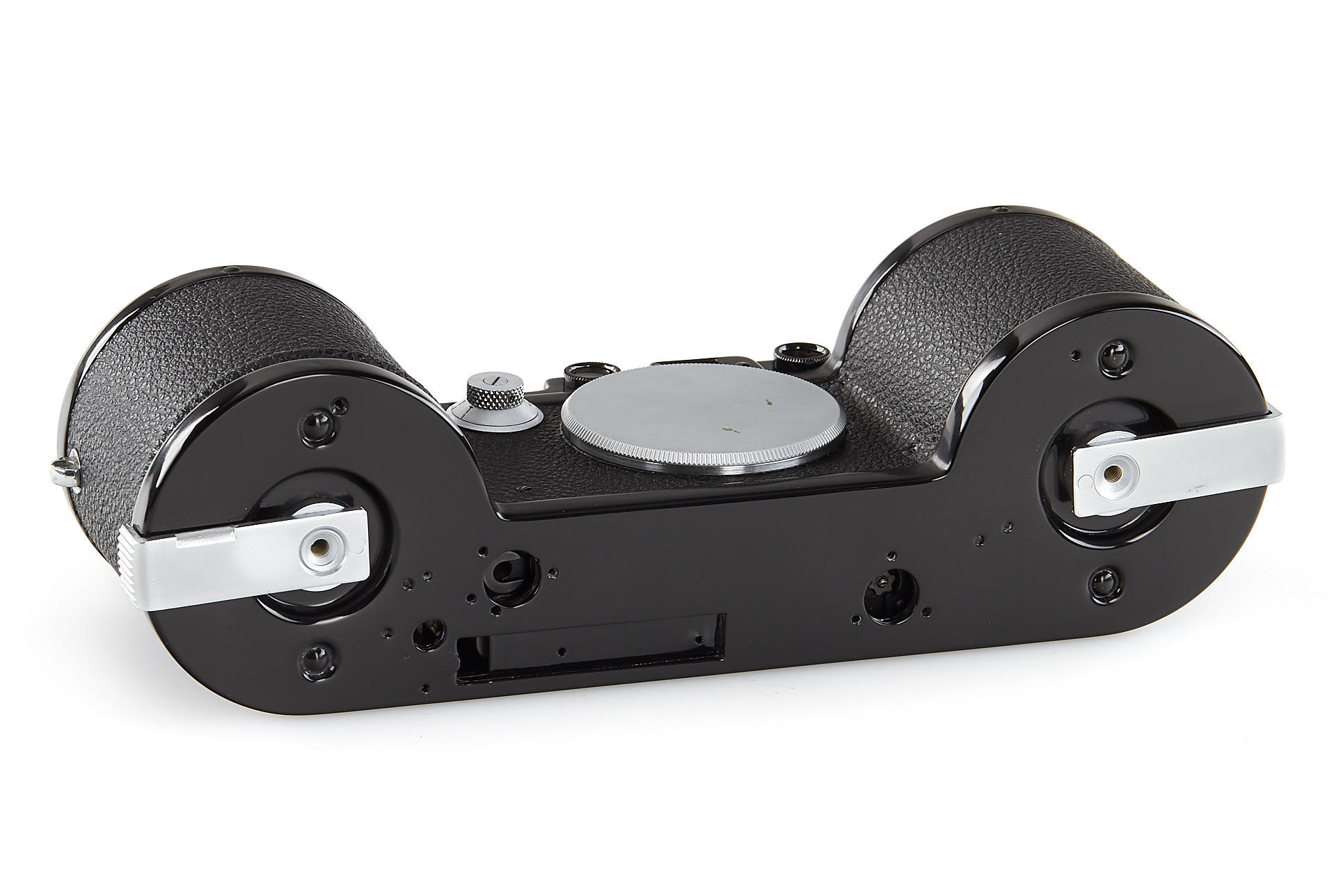 a very interesting Leica 250, equipped with motor-coupling, the base plate of the camera is actually an original top plate from the famous motor drive MOOEV - it is also engraved with the matching serial number 352406, the camera and the base plate are in excellent condition (both have been restored to present condition around 1950, the Vulkanite has been replaced with faux leather), a very interesting historical set