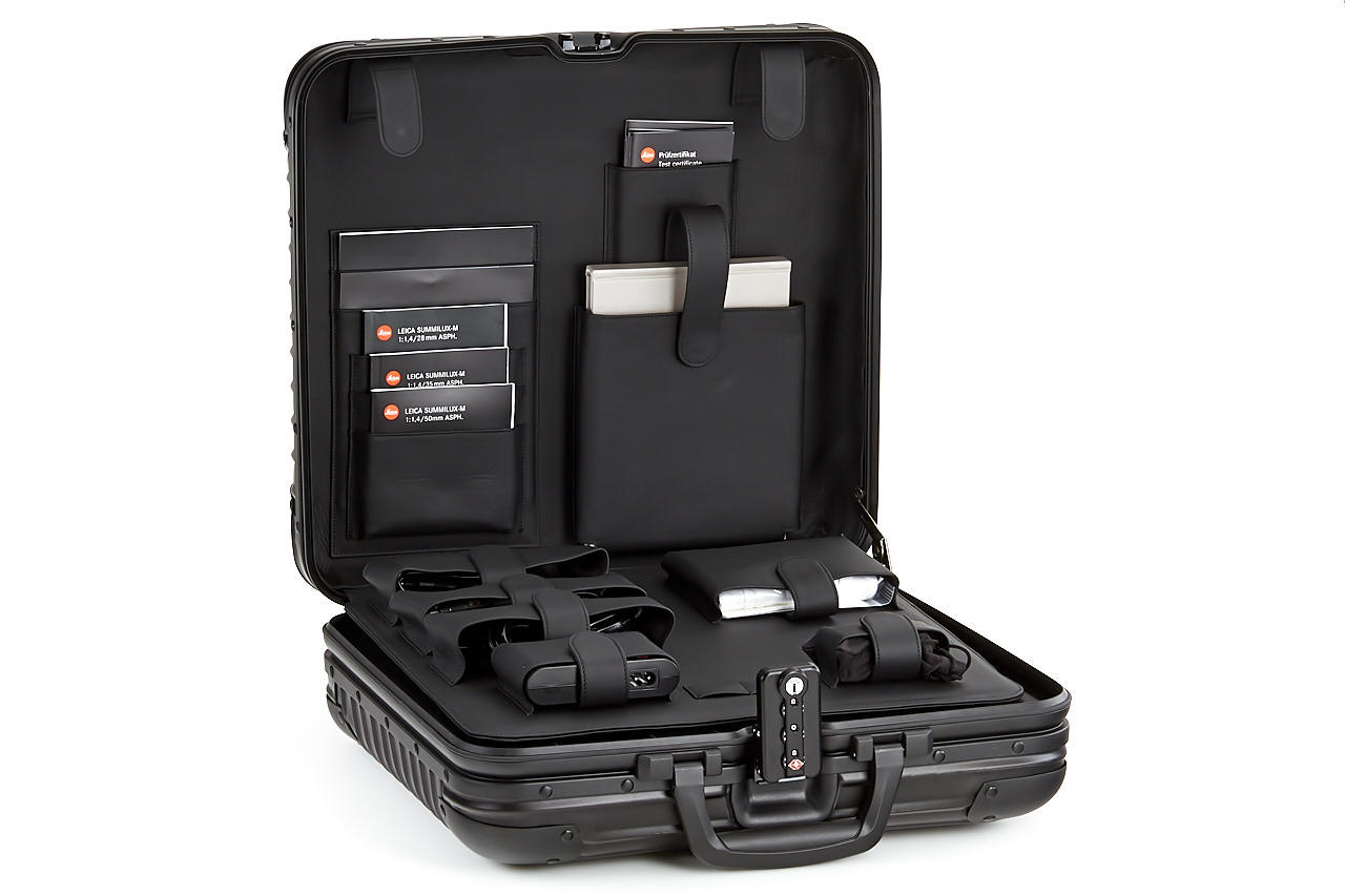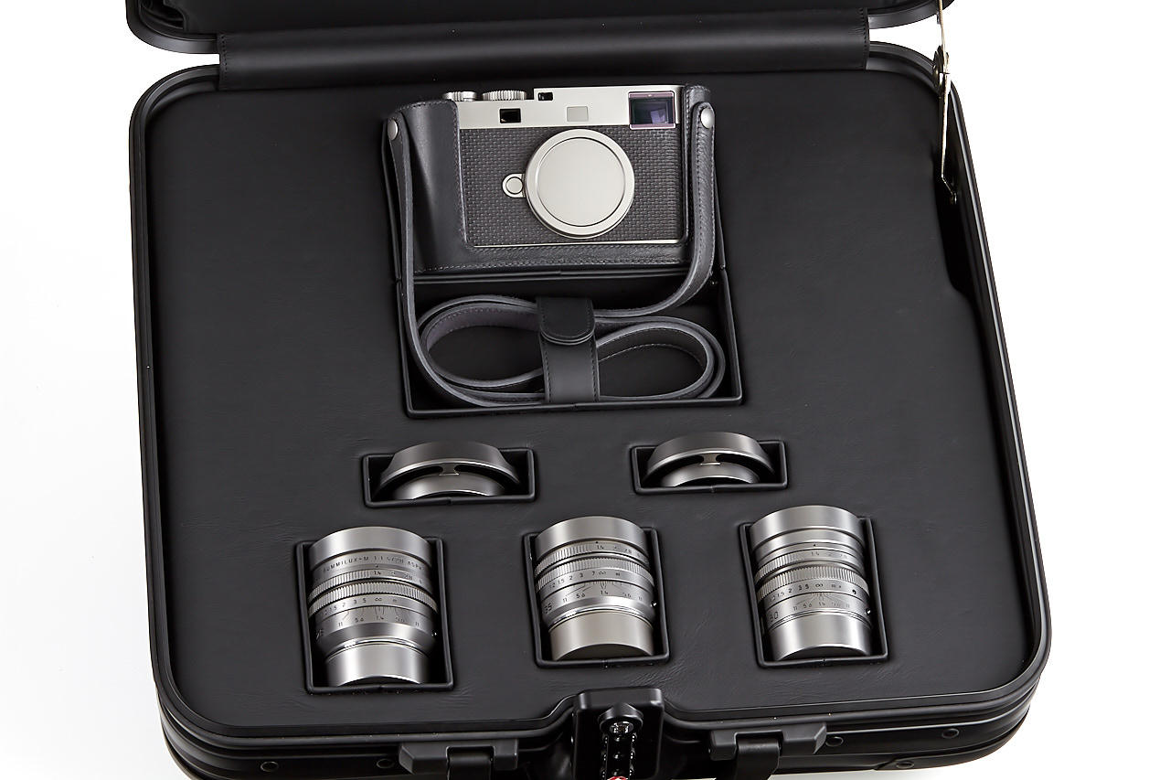 Unique set of a pre-series Leica 60 no.P01/24 with three stainless steel Summilux lenses. Summilux 1.4/50mm no.P026, Summilux 1.4/28mm no.11/24, Summilux 1.4/35mm no.11/24 - with all accessories (hoods, caps, special grey leather case with strap, charger, battery etc.) and all papers, guarantee cards, certificate of authenticity. All in special fitted RIMOWA suitcase, with Leica 100 outer box