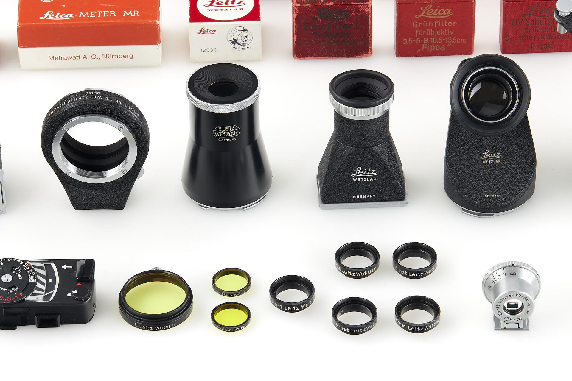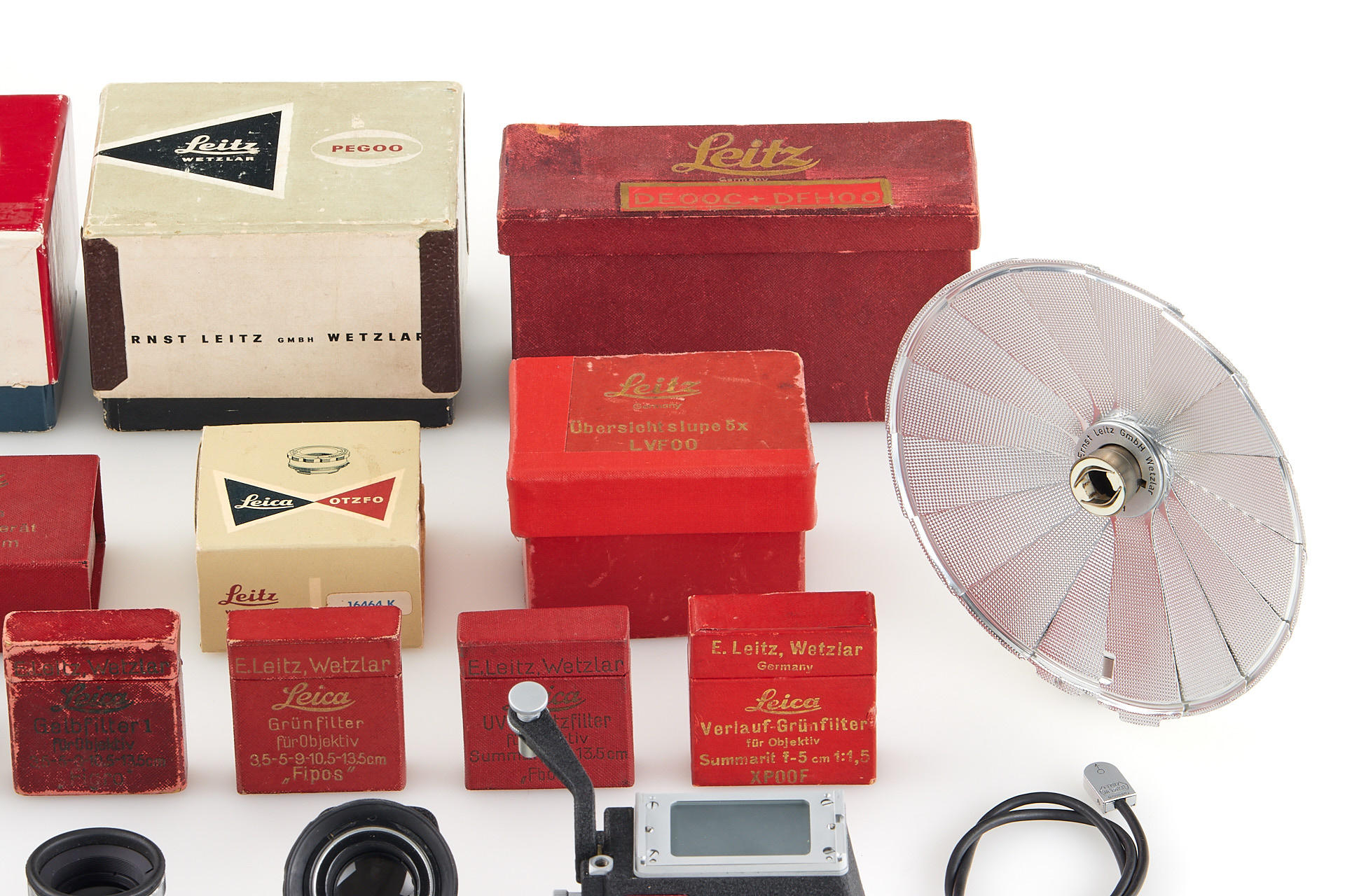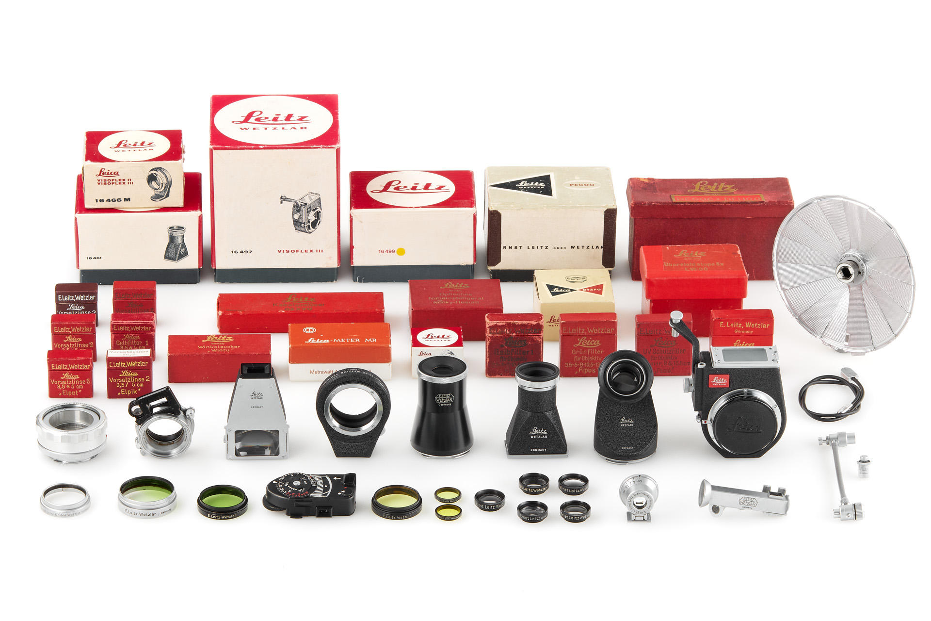 A large lot of various Leica accessories, like black Leica-Meter MR, Visoflex III, OTZFO focusing adapter, five filters etc. all in excellent to mint condition, with maker's boxes