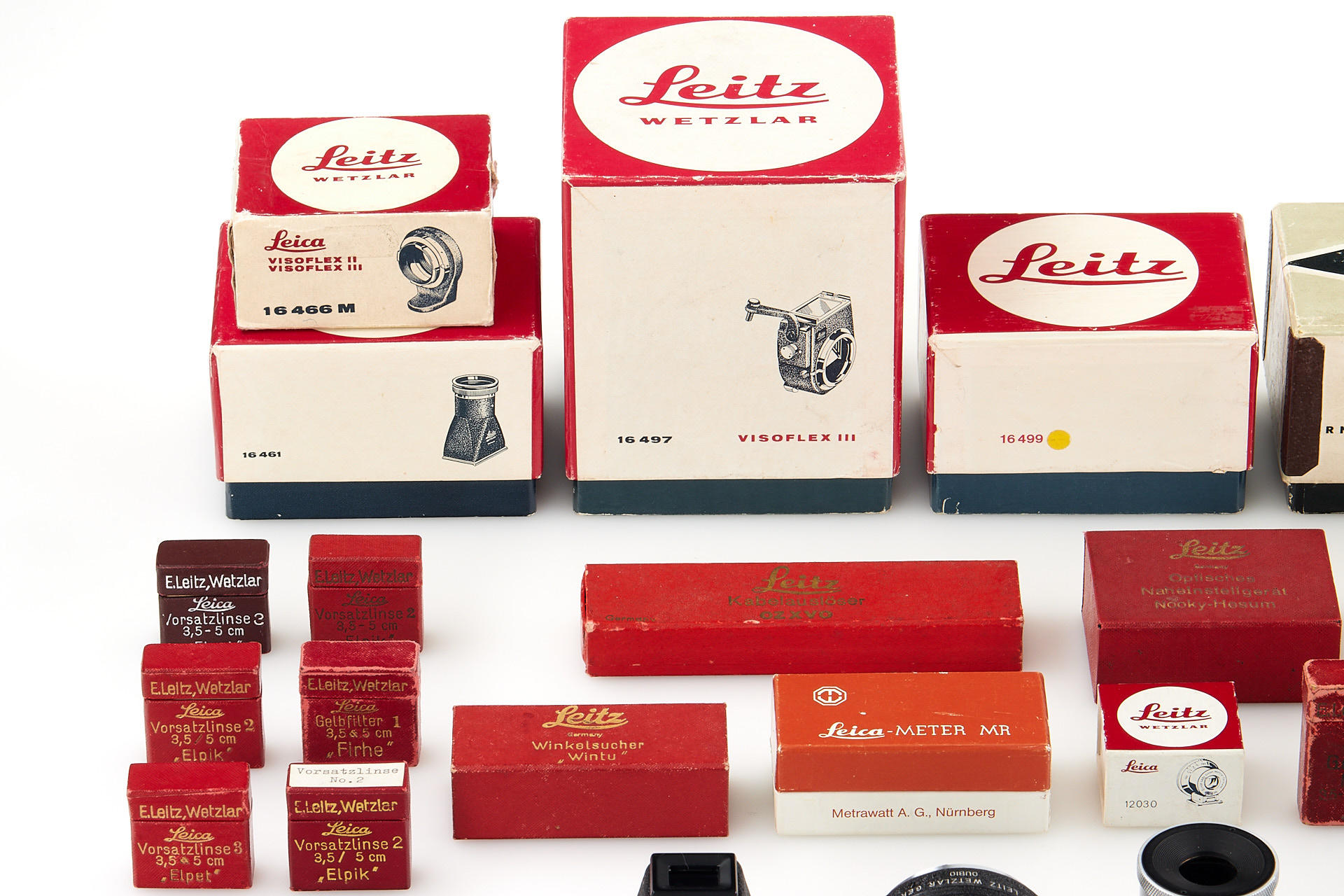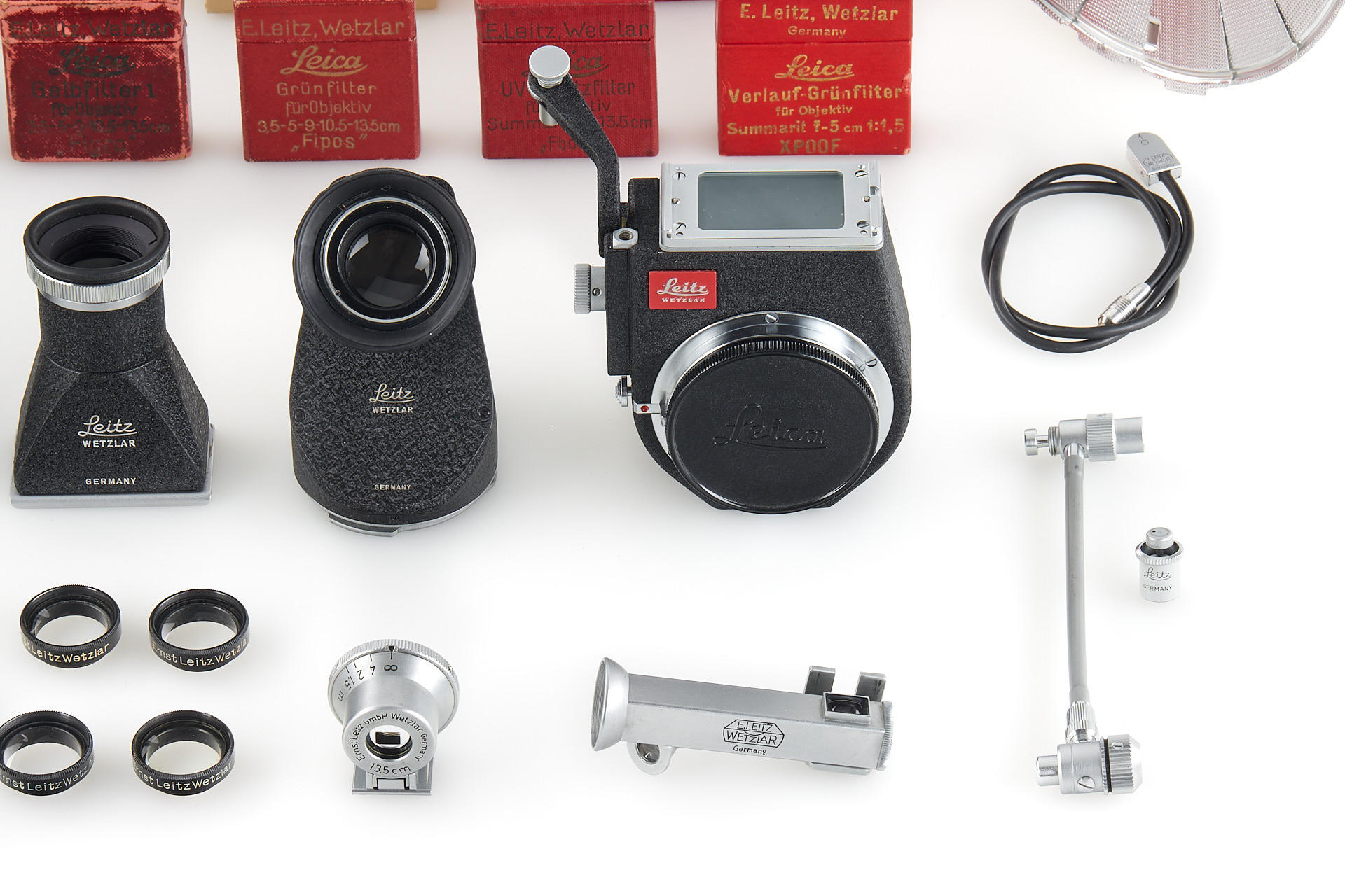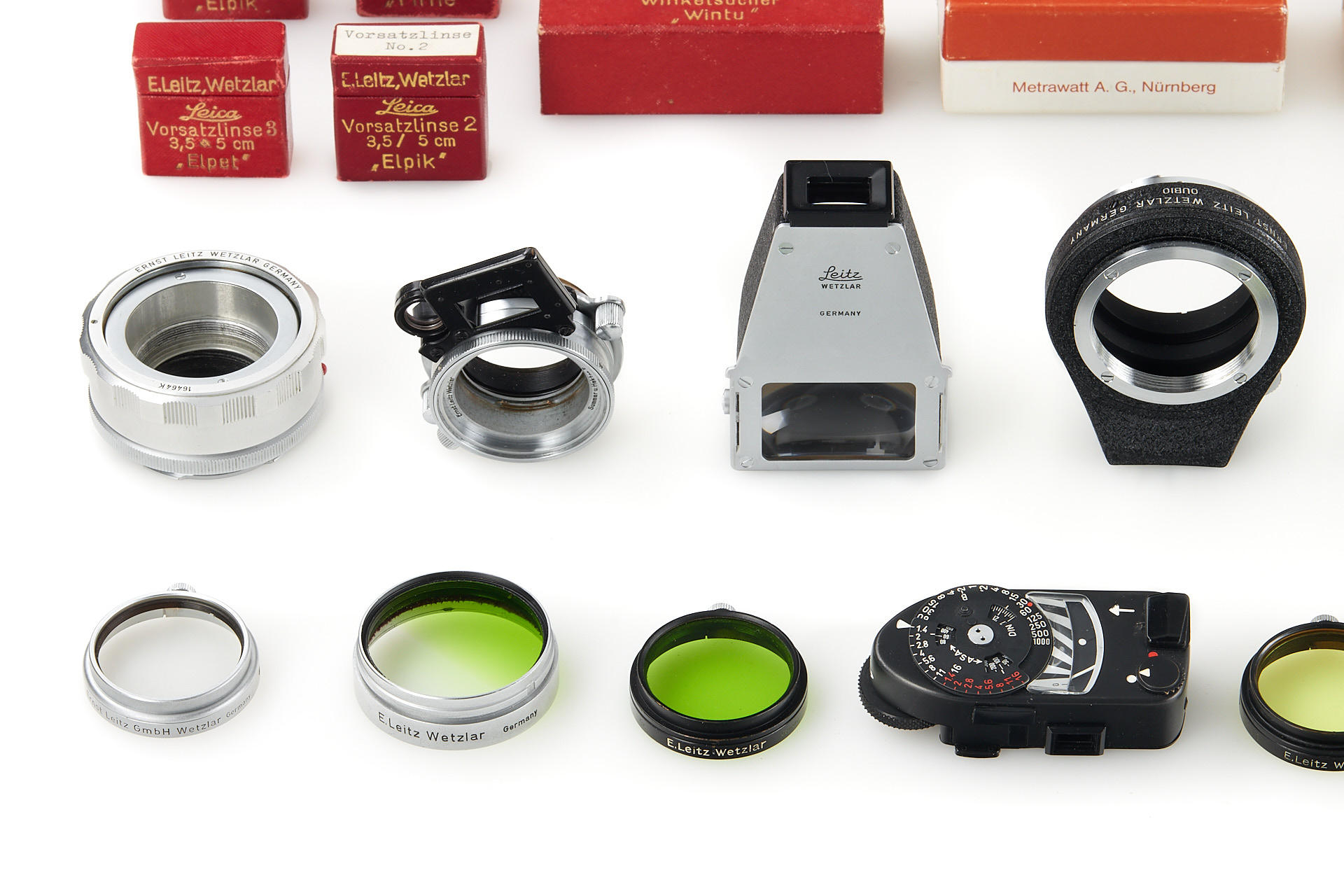 A large lot of various Leica accessories, like black Leica-Meter MR, Visoflex III, OTZFO focusing adapter, five filters etc. all in excellent to mint condition, with maker's boxes