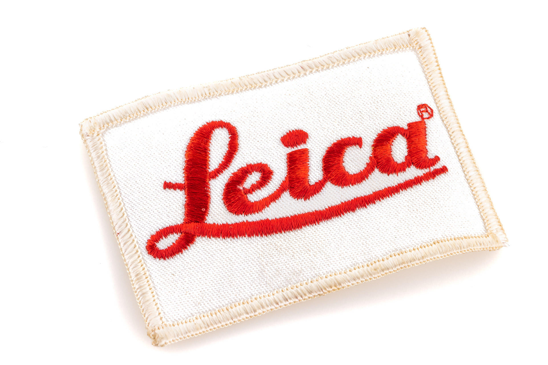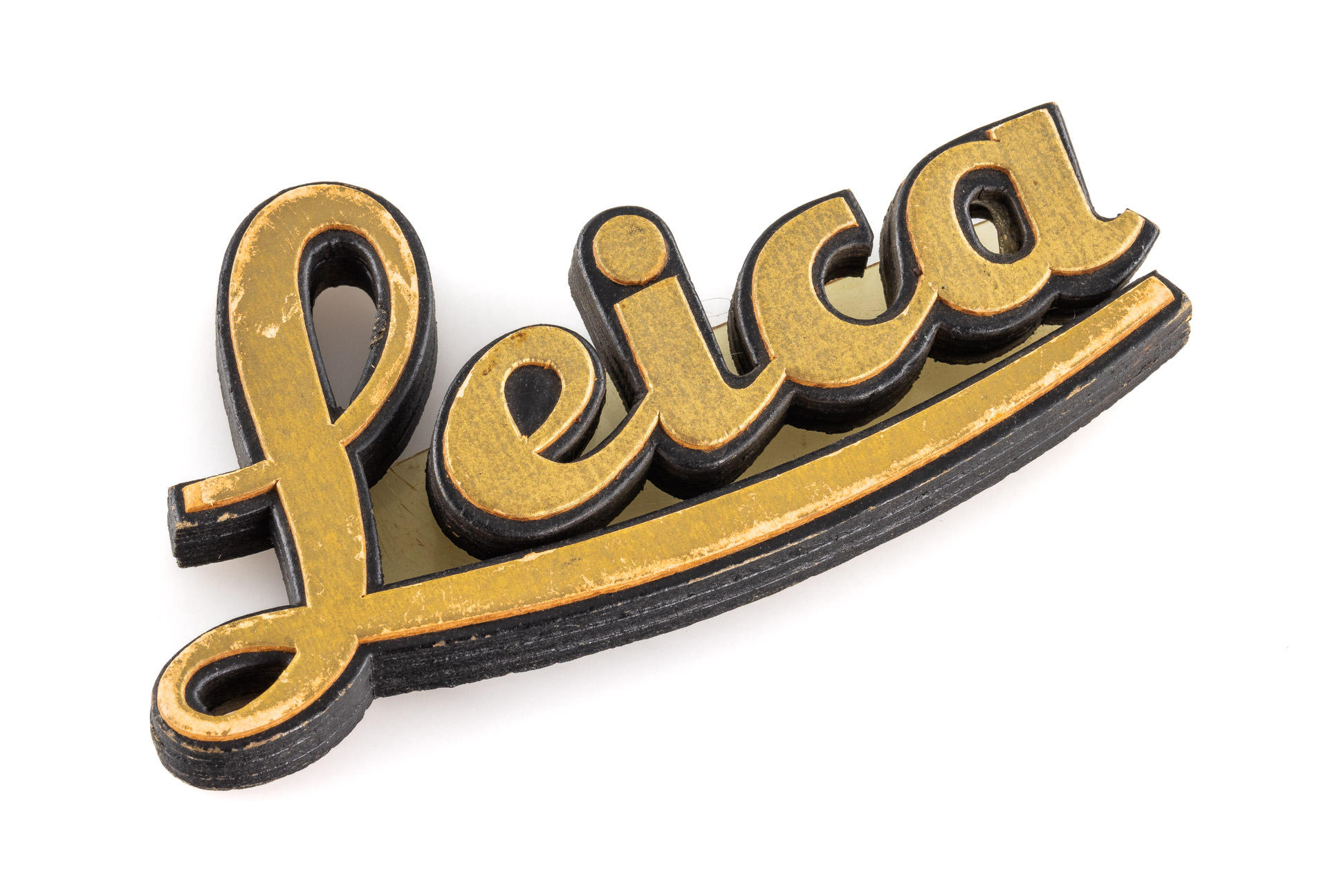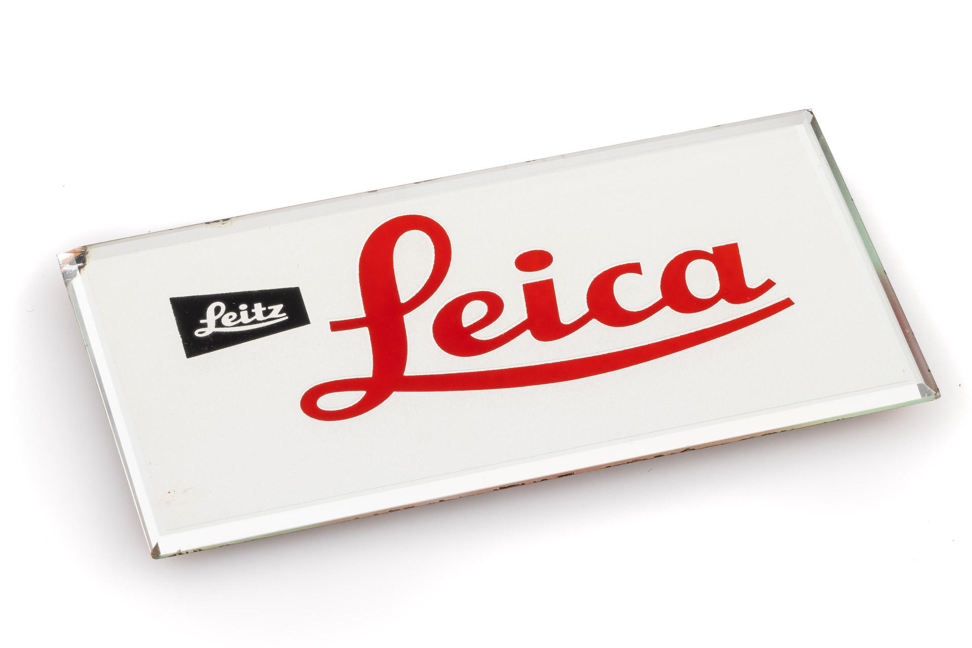 very nice Leica dealer's counter sign, 15x7.5cm printed glass, Leica badge (6.5x9cm) and Leica logo, painted wood c.6x10cm