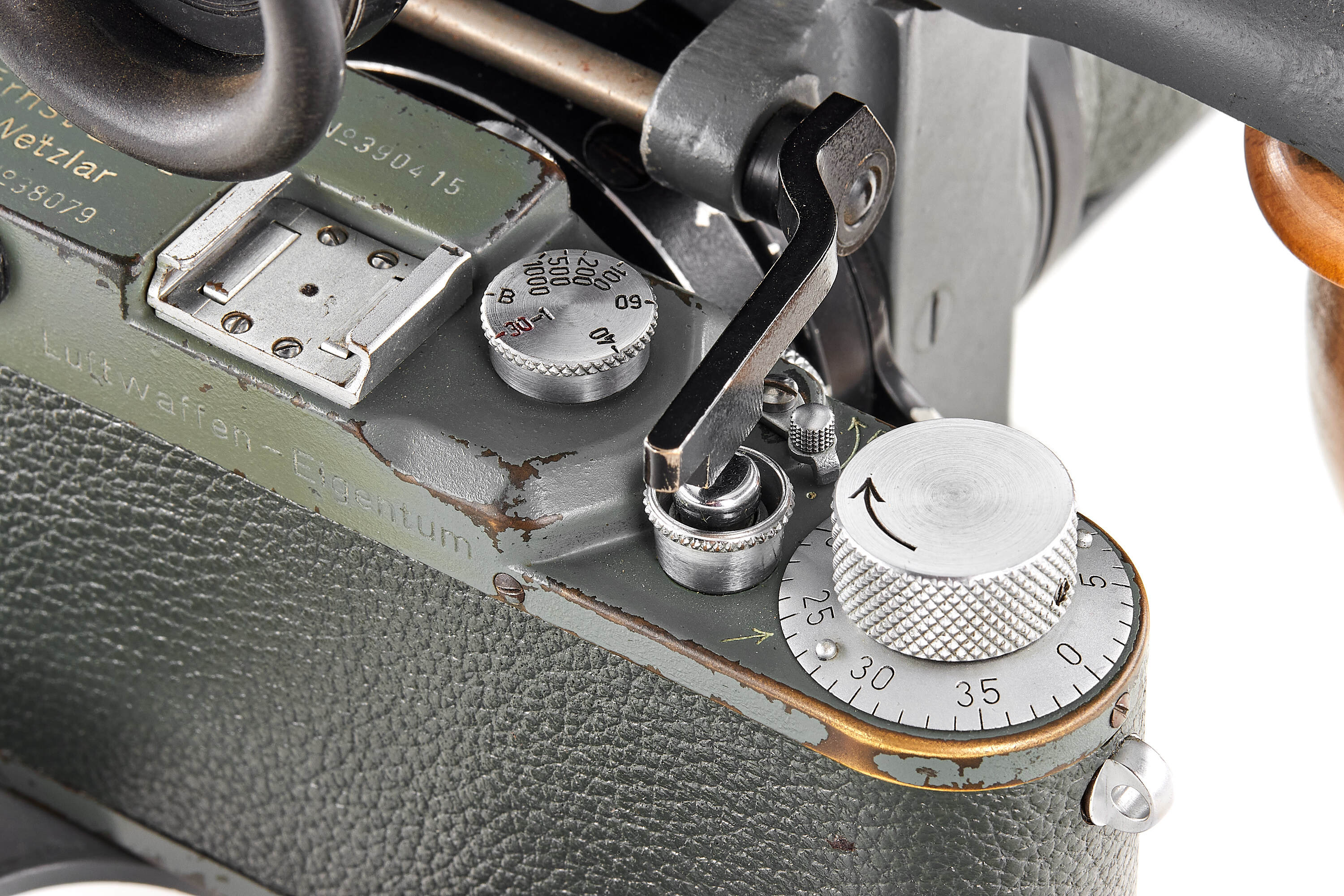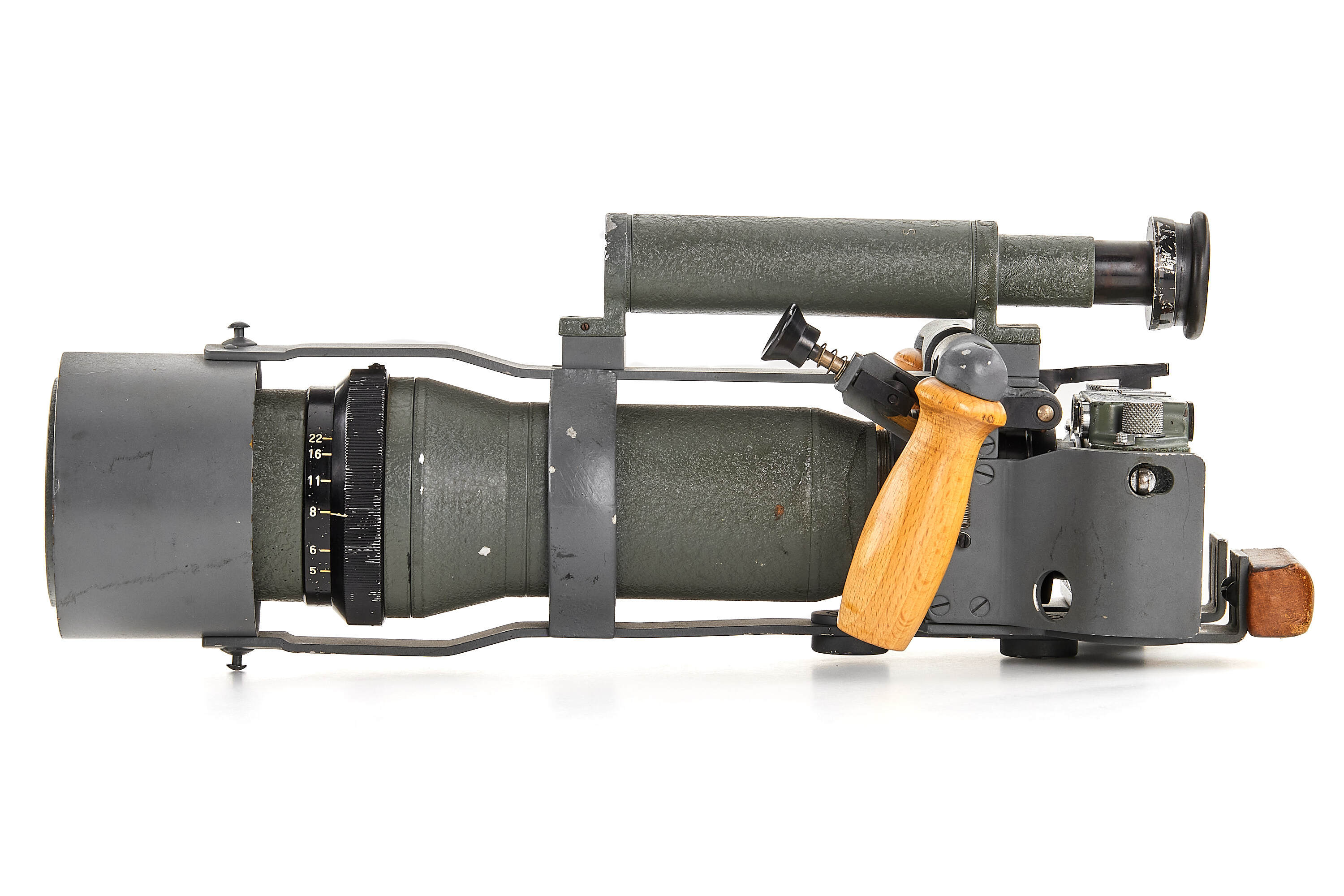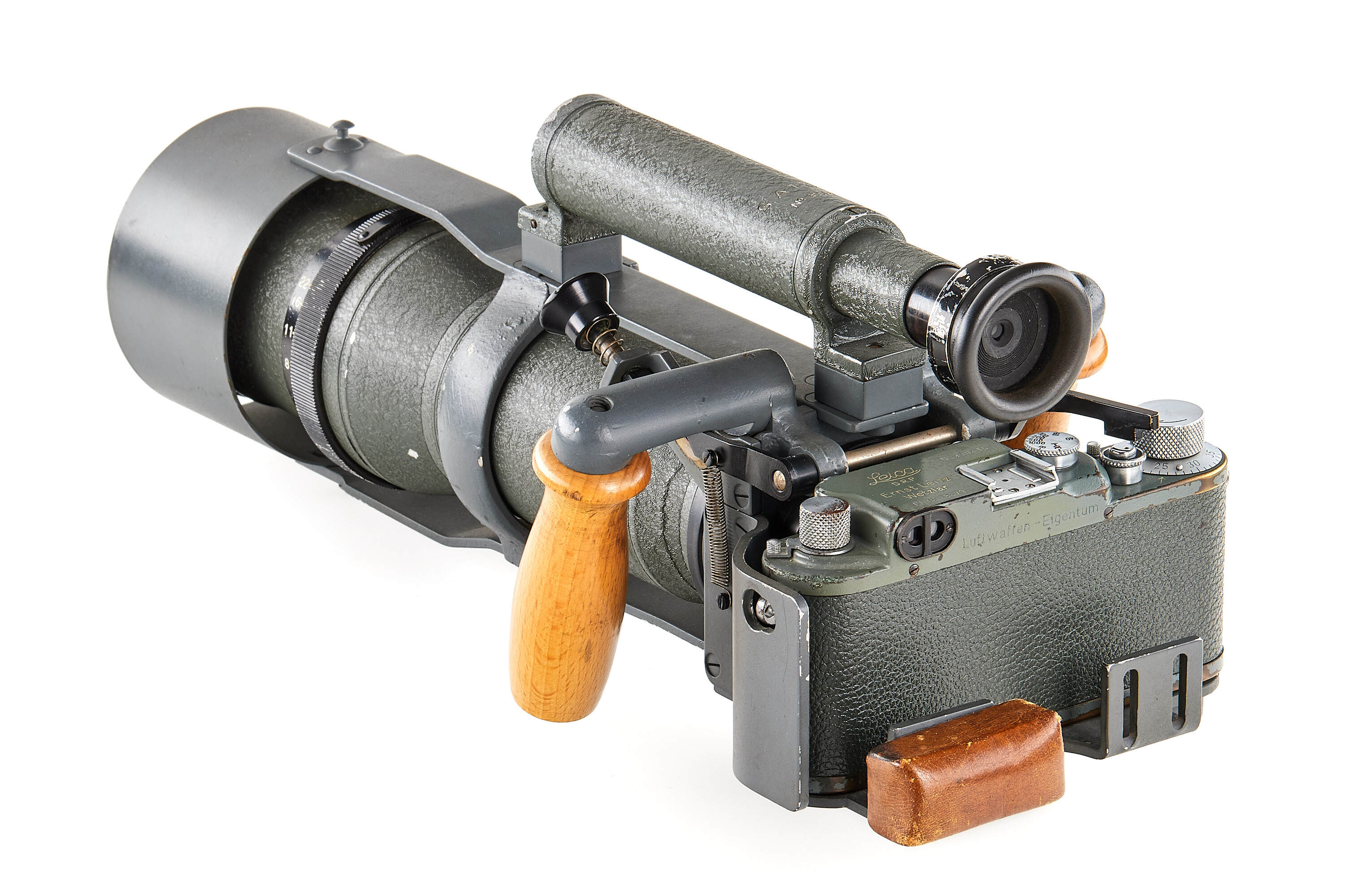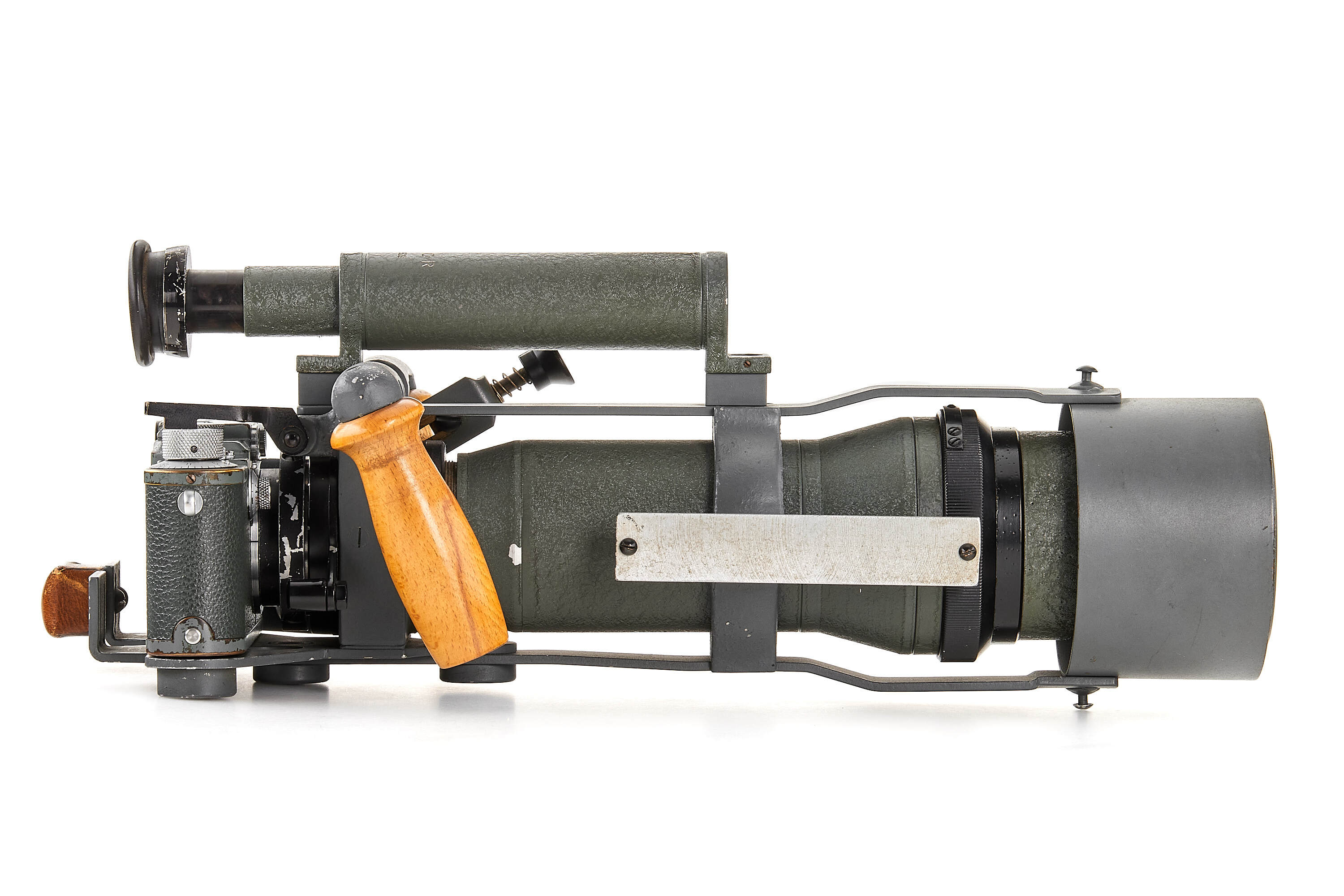 Das einzige bekannte Exemplar der für die deutsche Luftwaffe entwickelten Astro-Berlin-Kamera. Diese einzigartige Ausrüstung wurde für den Einsatz aus der Hand und auf einem Stativ konzipiert; die Konstruktion ist leicht und verfügt über zwei Holzgriffe, einen Auslöser auf der linken Seite sowie eine gepolsterte Gesichtsstütze für maximale Stabilität. Das Objektiv (Astro Fernbildlinse 5/300 mm Nr. 38912) und der Sucher sind olivgrün lackiert, die Halterung und die Stativbefestigung grau. Das Gewehr ist mit einer ungewöhnlichen Luftwaffen-Leica IIIc Nr. 390415 kombiniert, die in grüner Lackierung gehalten ist, in einem ähnlichen Farbton wie das Objektiv; es handelt sich zudem um eine der neuesten Luftwaffen-Eigentum-Kameras, die im Leica-Archiv verzeichnet sind. Genau dieses Astro-Gewehr wird in Lager I „Kameras“ auf Seite 87 vorgestellt. Es ist eines der raffiniertesten militärischen Kamera-Outfits, die wir je gesehen haben!