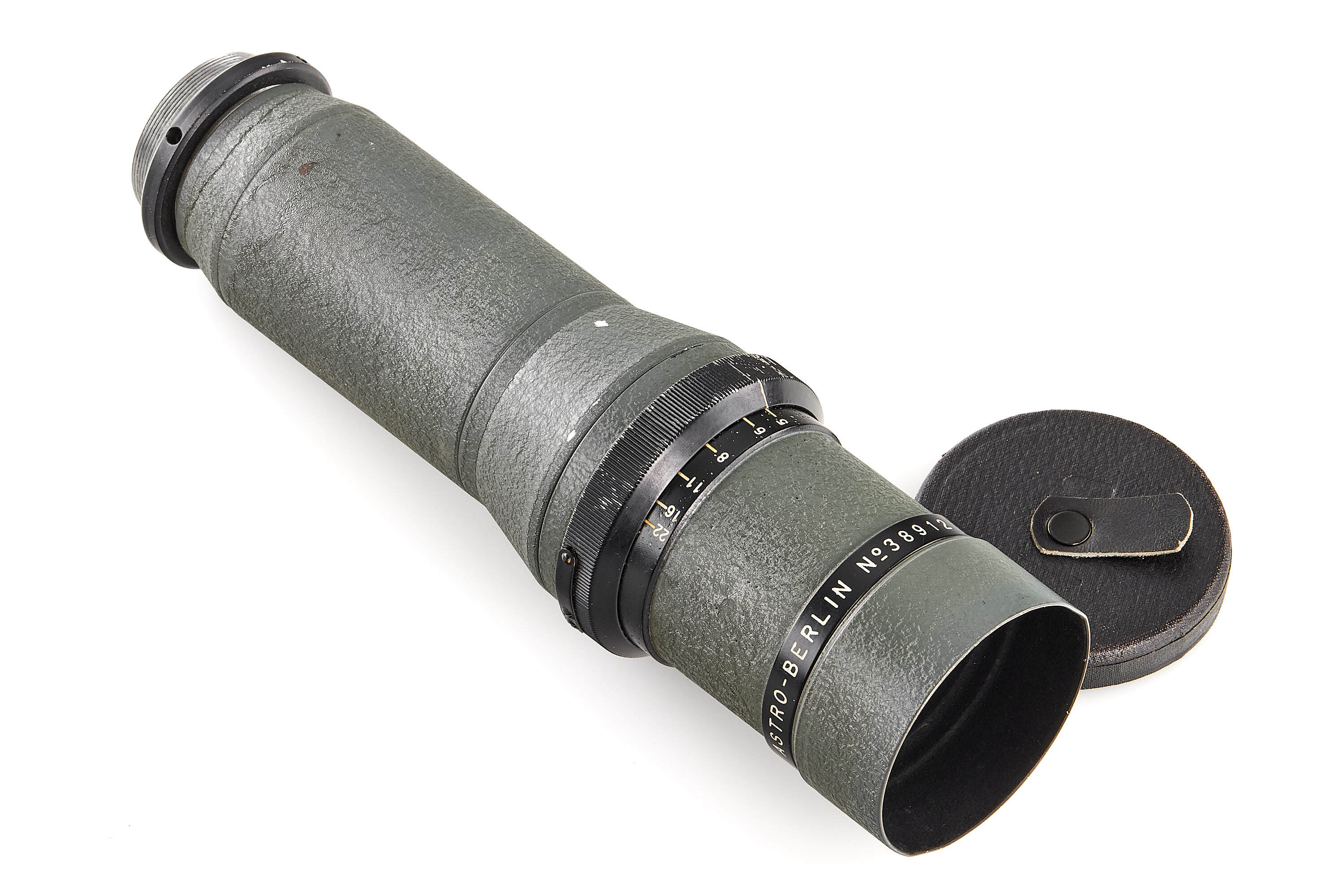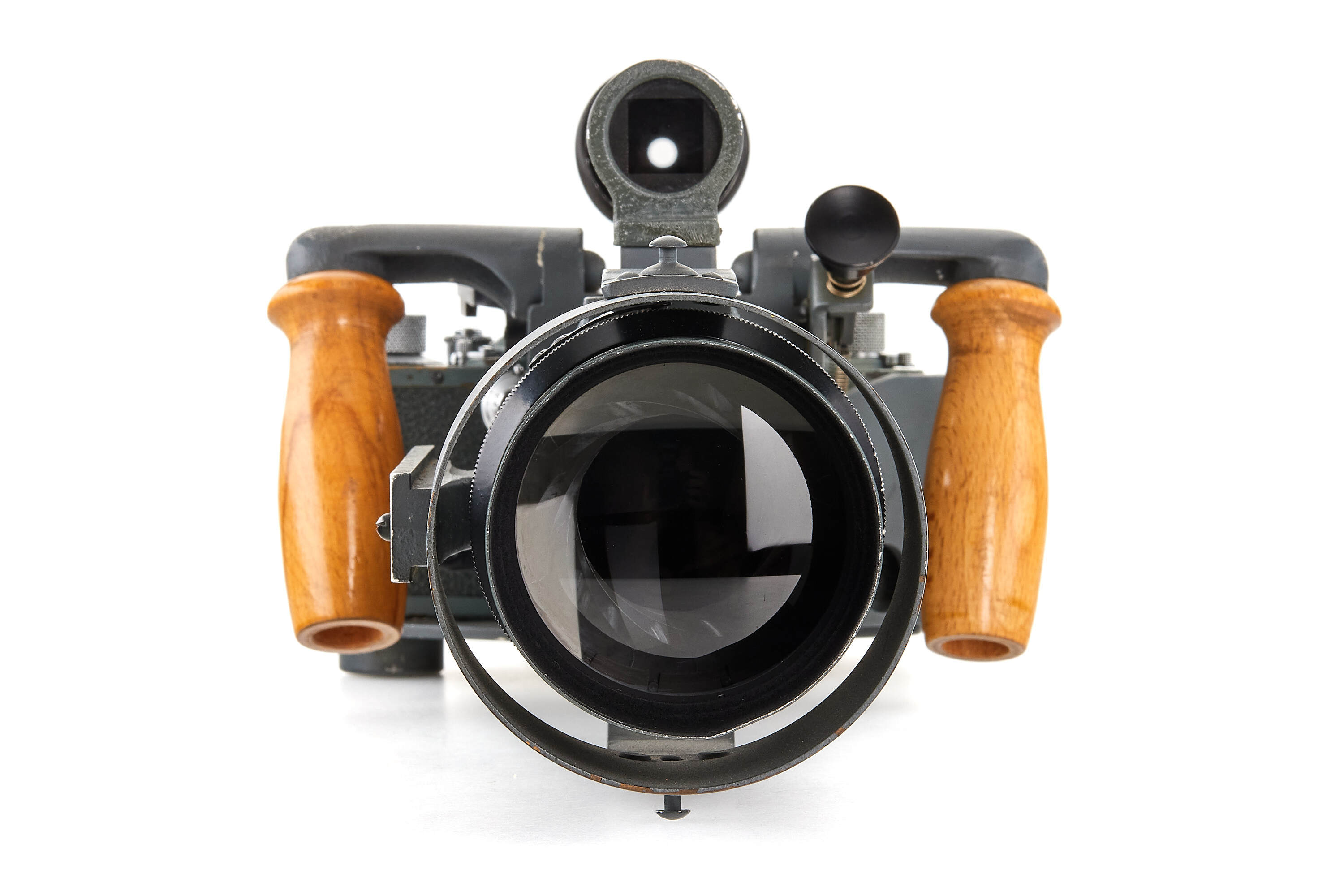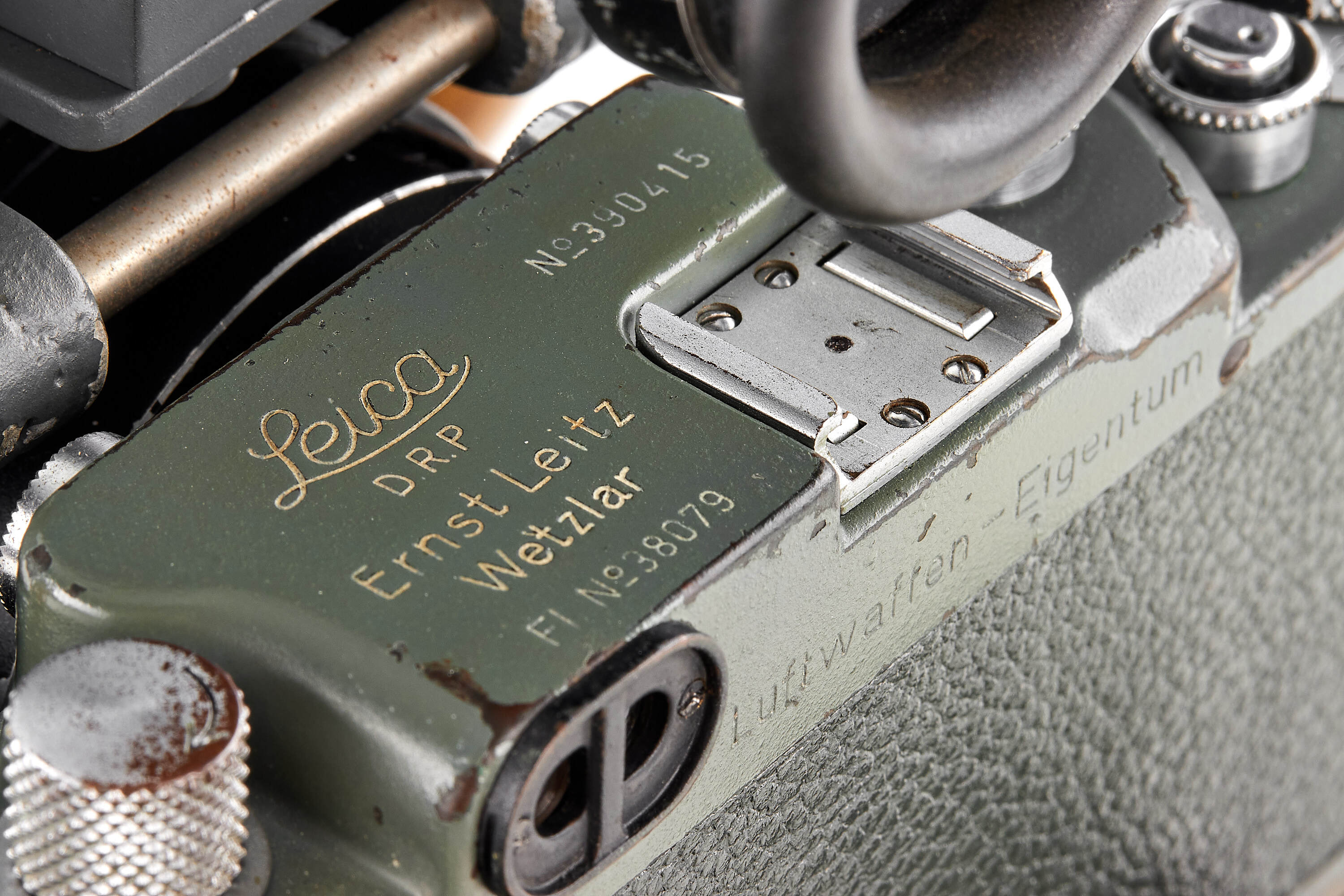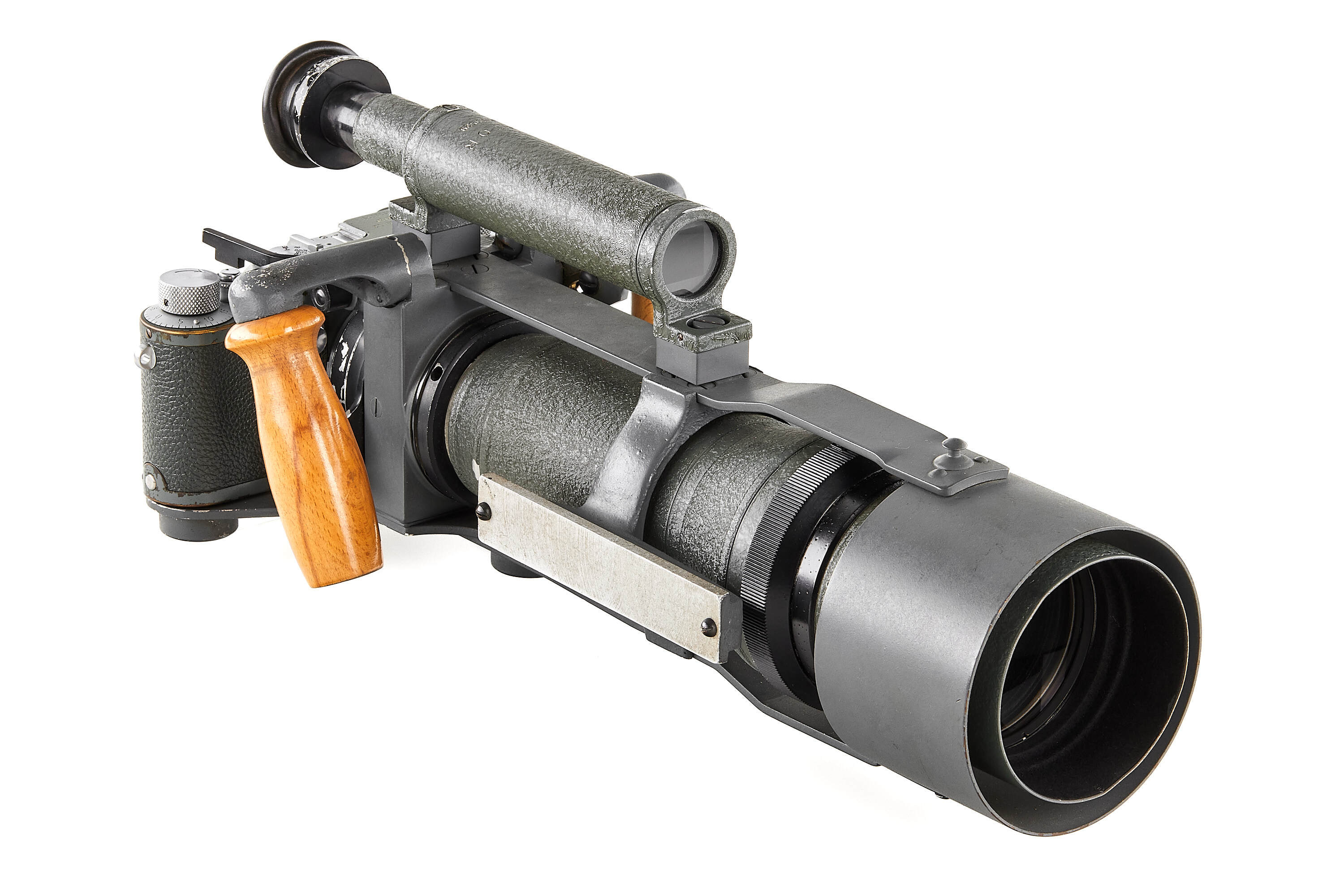 Das einzige bekannte Exemplar der für die deutsche Luftwaffe entwickelten Astro-Berlin-Kamera. Diese einzigartige Ausrüstung wurde für den Einsatz aus der Hand und auf einem Stativ konzipiert; die Konstruktion ist leicht und verfügt über zwei Holzgriffe, einen Auslöser auf der linken Seite sowie eine gepolsterte Gesichtsstütze für maximale Stabilität. Das Objektiv (Astro Fernbildlinse 5/300 mm Nr. 38912) und der Sucher sind olivgrün lackiert, die Halterung und die Stativbefestigung grau. Das Gewehr ist mit einer ungewöhnlichen Luftwaffen-Leica IIIc Nr. 390415 kombiniert, die in grüner Lackierung gehalten ist, in einem ähnlichen Farbton wie das Objektiv; es handelt sich zudem um eine der neuesten Luftwaffen-Eigentum-Kameras, die im Leica-Archiv verzeichnet sind. Genau dieses Astro-Gewehr wird in Lager I „Kameras“ auf Seite 87 vorgestellt. Es ist eines der raffiniertesten militärischen Kamera-Outfits, die wir je gesehen haben!