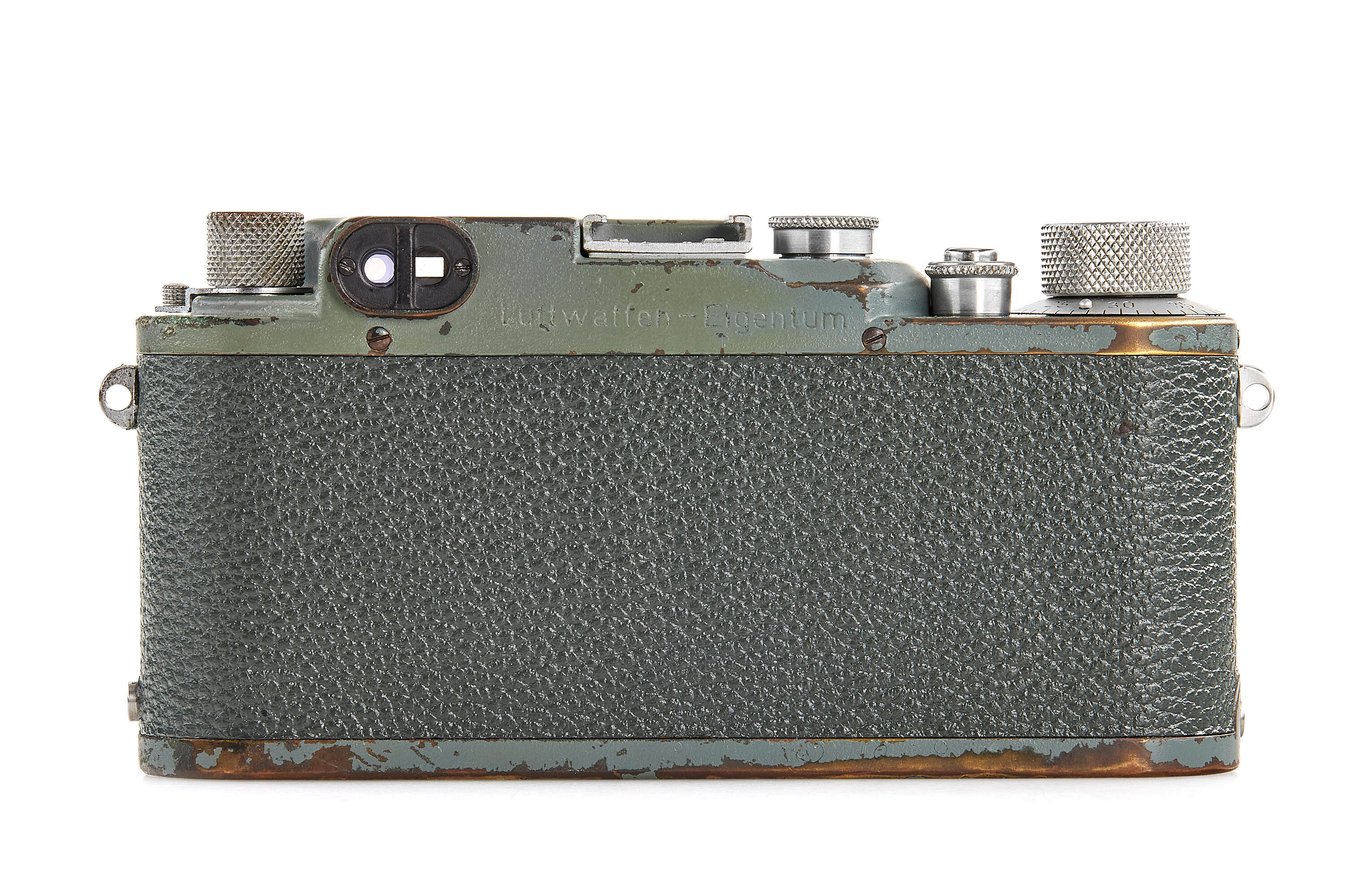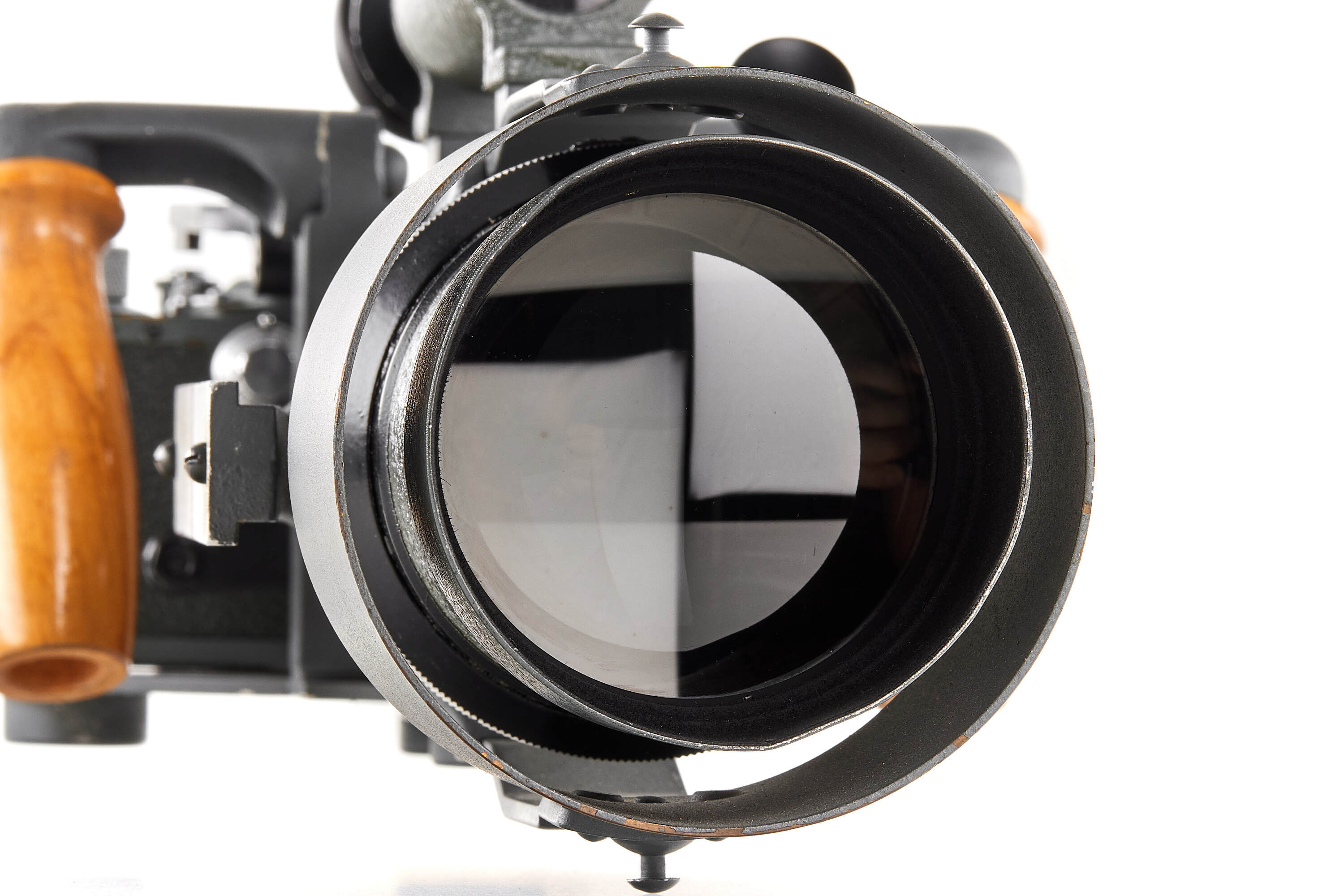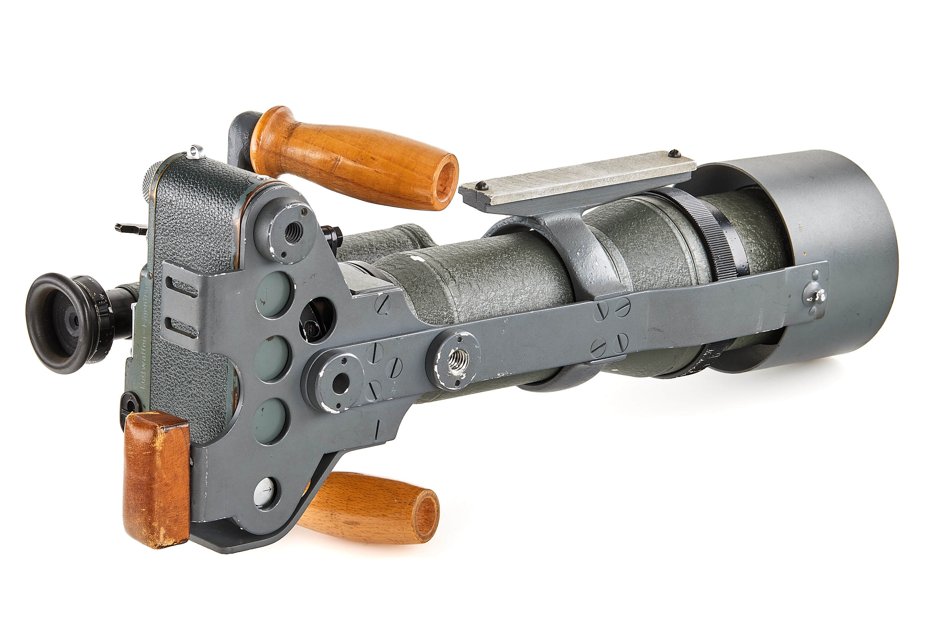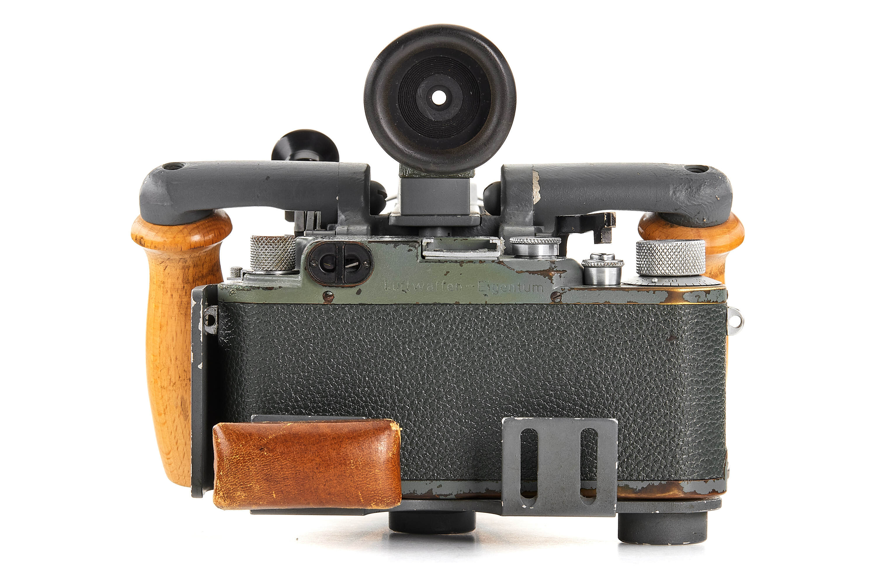 Das einzige bekannte Exemplar der für die deutsche Luftwaffe entwickelten Astro-Berlin-Kamera. Diese einzigartige Ausrüstung wurde für den Einsatz aus der Hand und auf einem Stativ konzipiert; die Konstruktion ist leicht und verfügt über zwei Holzgriffe, einen Auslöser auf der linken Seite sowie eine gepolsterte Gesichtsstütze für maximale Stabilität. Das Objektiv (Astro Fernbildlinse 5/300 mm Nr. 38912) und der Sucher sind olivgrün lackiert, die Halterung und die Stativbefestigung grau. Das Gewehr ist mit einer ungewöhnlichen Luftwaffen-Leica IIIc Nr. 390415 kombiniert, die in grüner Lackierung gehalten ist, in einem ähnlichen Farbton wie das Objektiv; es handelt sich zudem um eine der neuesten Luftwaffen-Eigentum-Kameras, die im Leica-Archiv verzeichnet sind. Genau dieses Astro-Gewehr wird in Lager I „Kameras“ auf Seite 87 vorgestellt. Es ist eines der raffiniertesten militärischen Kamera-Outfits, die wir je gesehen haben!