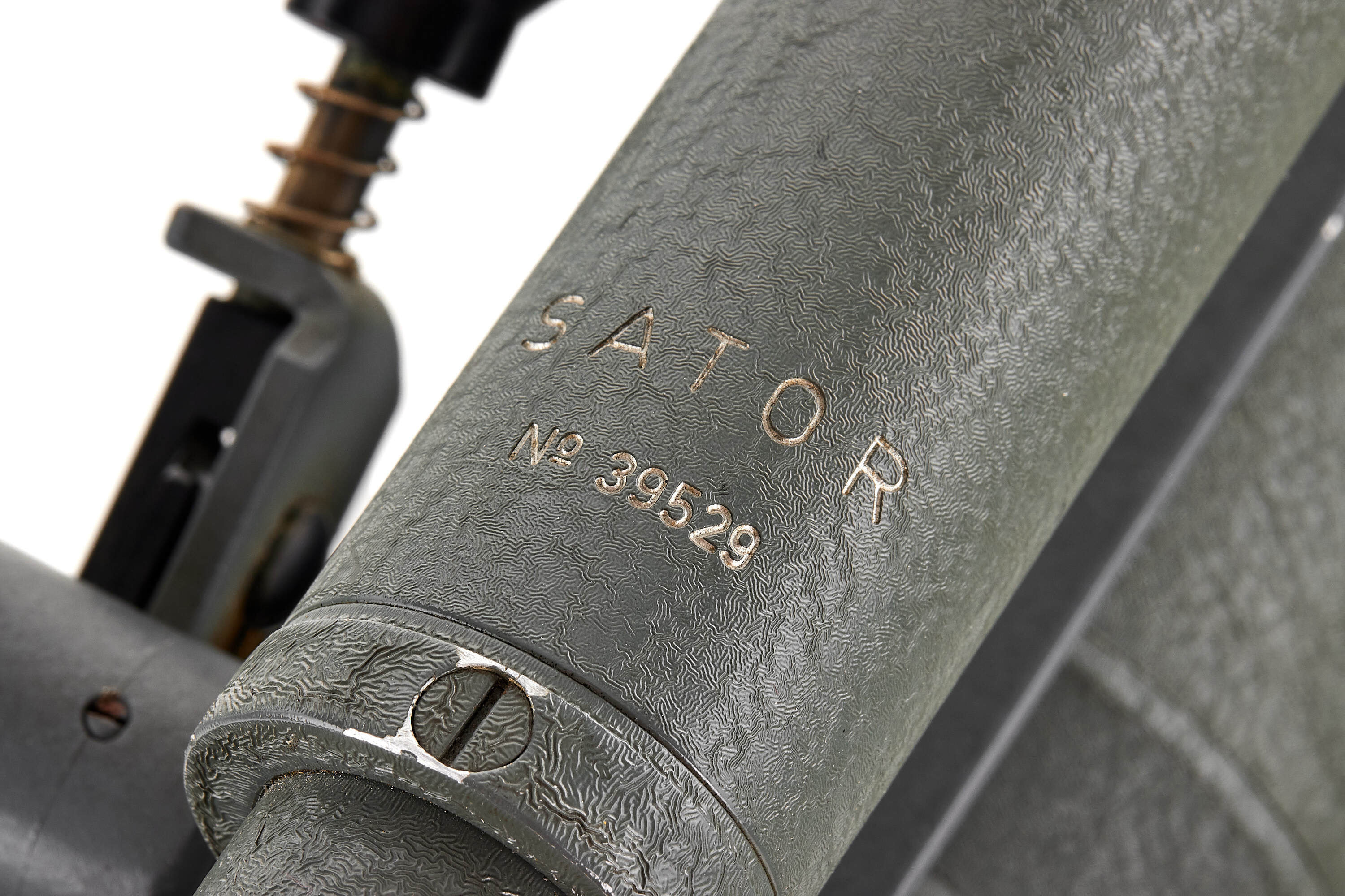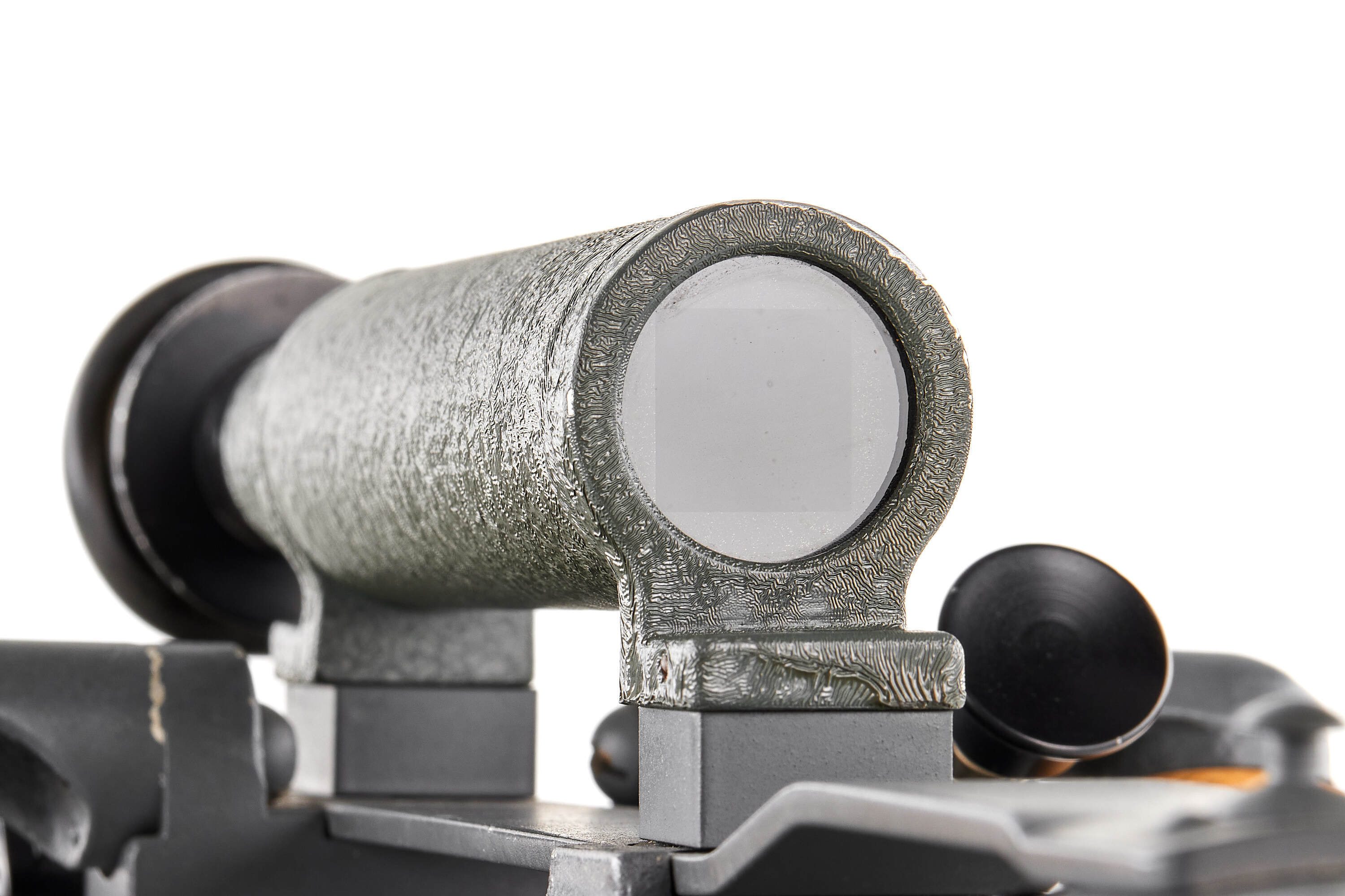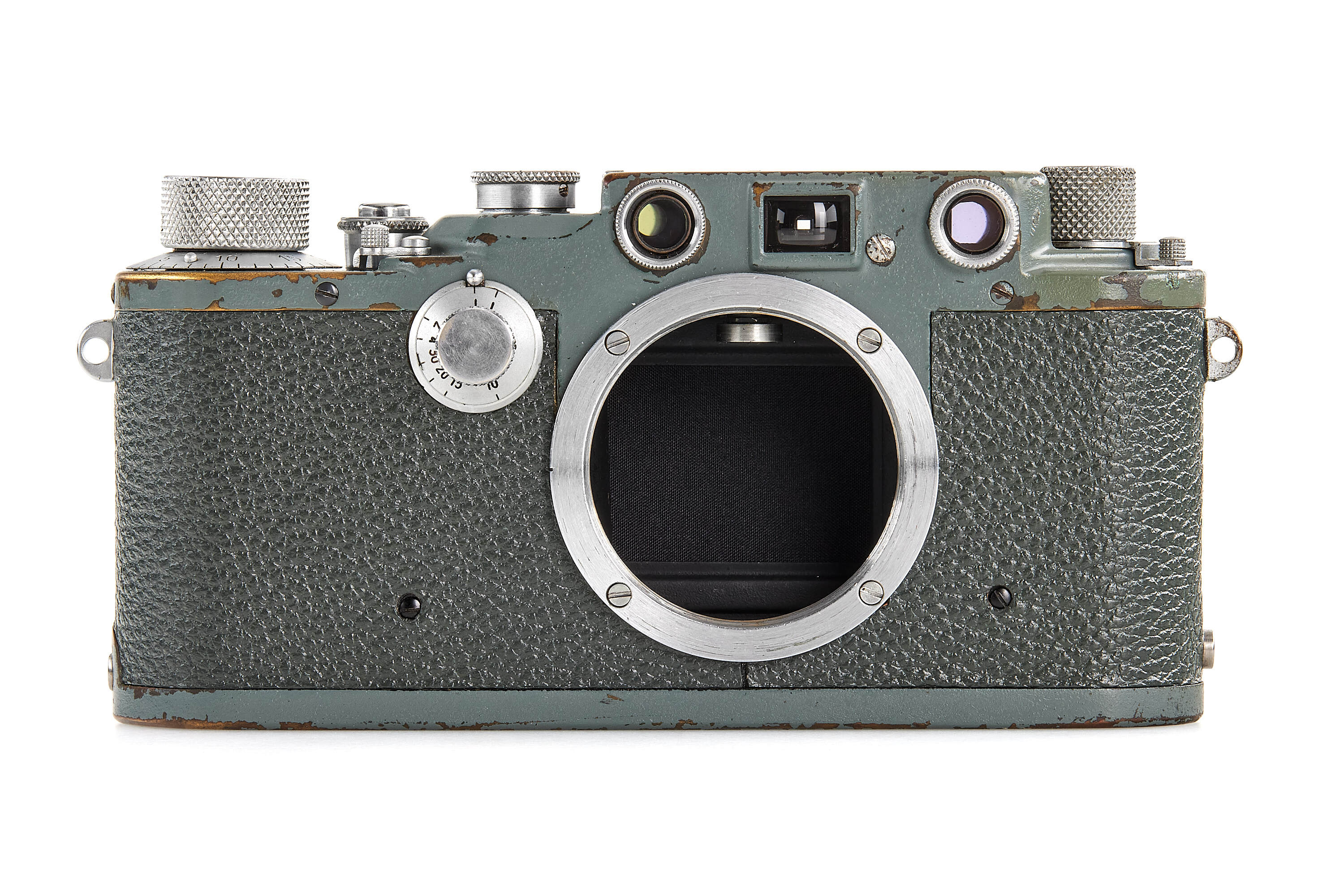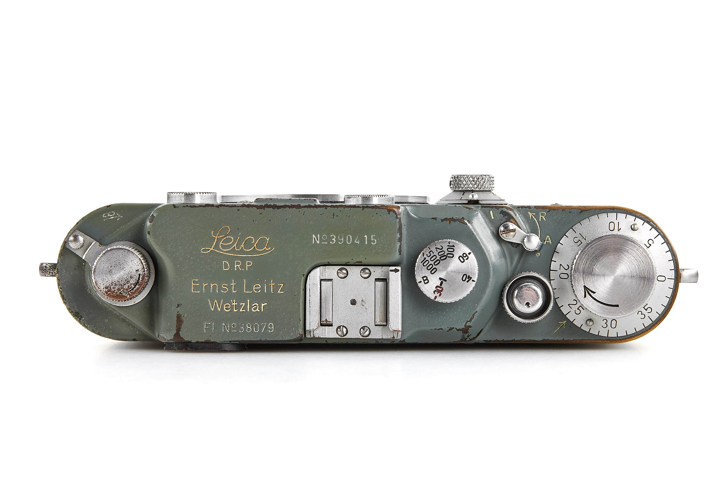 Das einzige bekannte Exemplar der für die deutsche Luftwaffe entwickelten Astro-Berlin-Kamera. Diese einzigartige Ausrüstung wurde für den Einsatz aus der Hand und auf einem Stativ konzipiert; die Konstruktion ist leicht und verfügt über zwei Holzgriffe, einen Auslöser auf der linken Seite sowie eine gepolsterte Gesichtsstütze für maximale Stabilität. Das Objektiv (Astro Fernbildlinse 5/300 mm Nr. 38912) und der Sucher sind olivgrün lackiert, die Halterung und die Stativbefestigung grau. Das Gewehr ist mit einer ungewöhnlichen Luftwaffen-Leica IIIc Nr. 390415 kombiniert, die in grüner Lackierung gehalten ist, in einem ähnlichen Farbton wie das Objektiv; es handelt sich zudem um eine der neuesten Luftwaffen-Eigentum-Kameras, die im Leica-Archiv verzeichnet sind. Genau dieses Astro-Gewehr wird in Lager I „Kameras“ auf Seite 87 vorgestellt. Es ist eines der raffiniertesten militärischen Kamera-Outfits, die wir je gesehen haben!