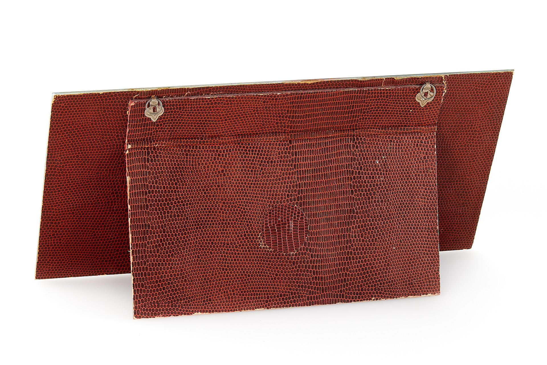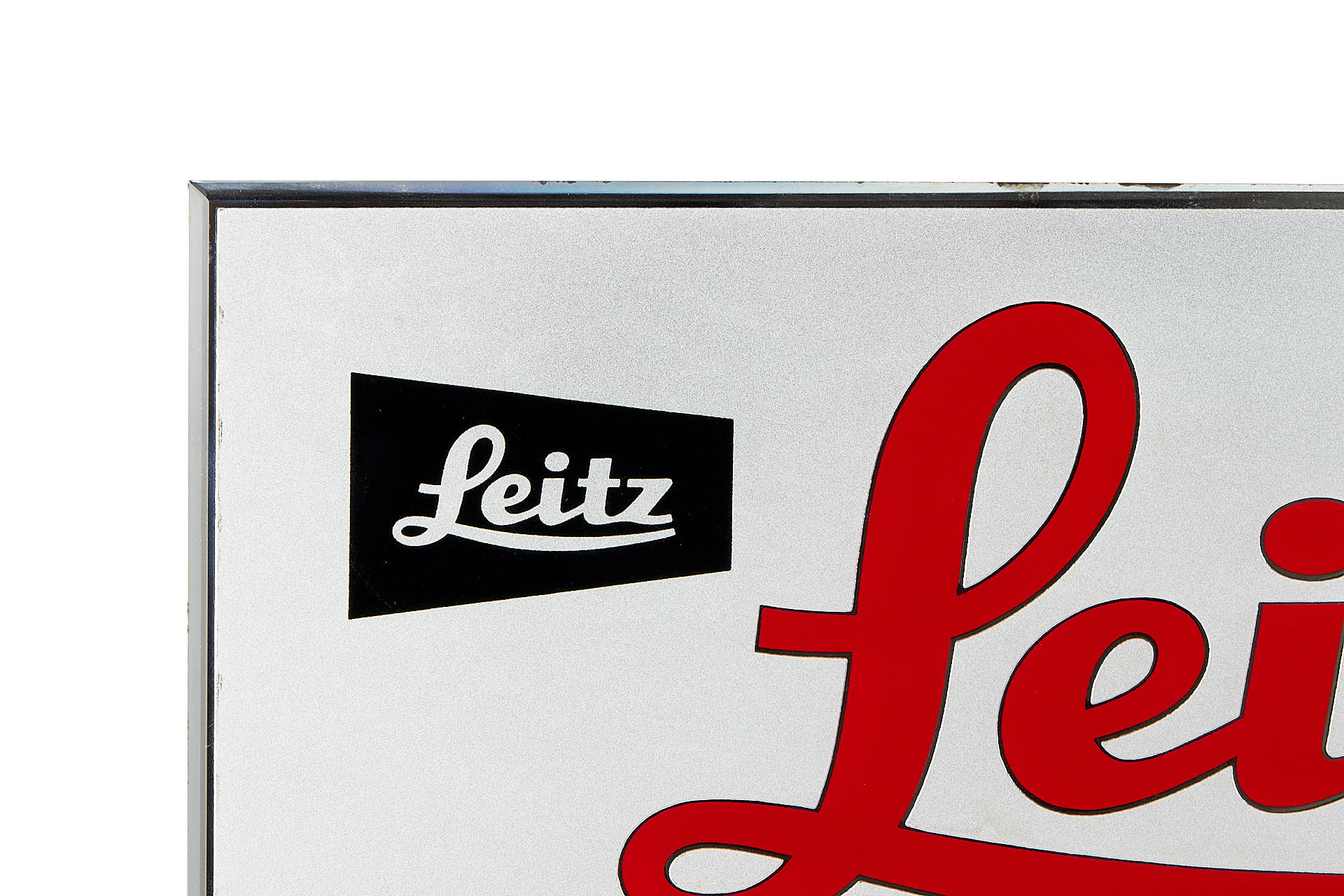 Beautiful Leica counter sign made of metal and glass, with built-in stand, covered with snake skin replica on the back, hooks, in very good condition (29x15cm)