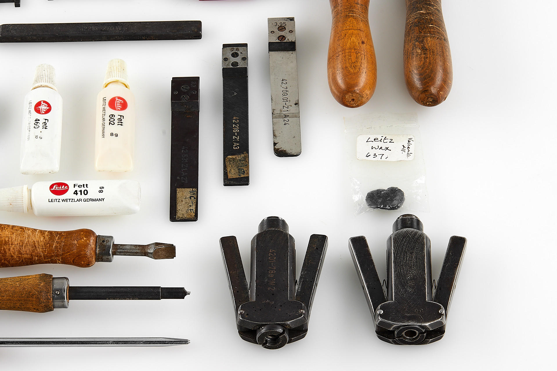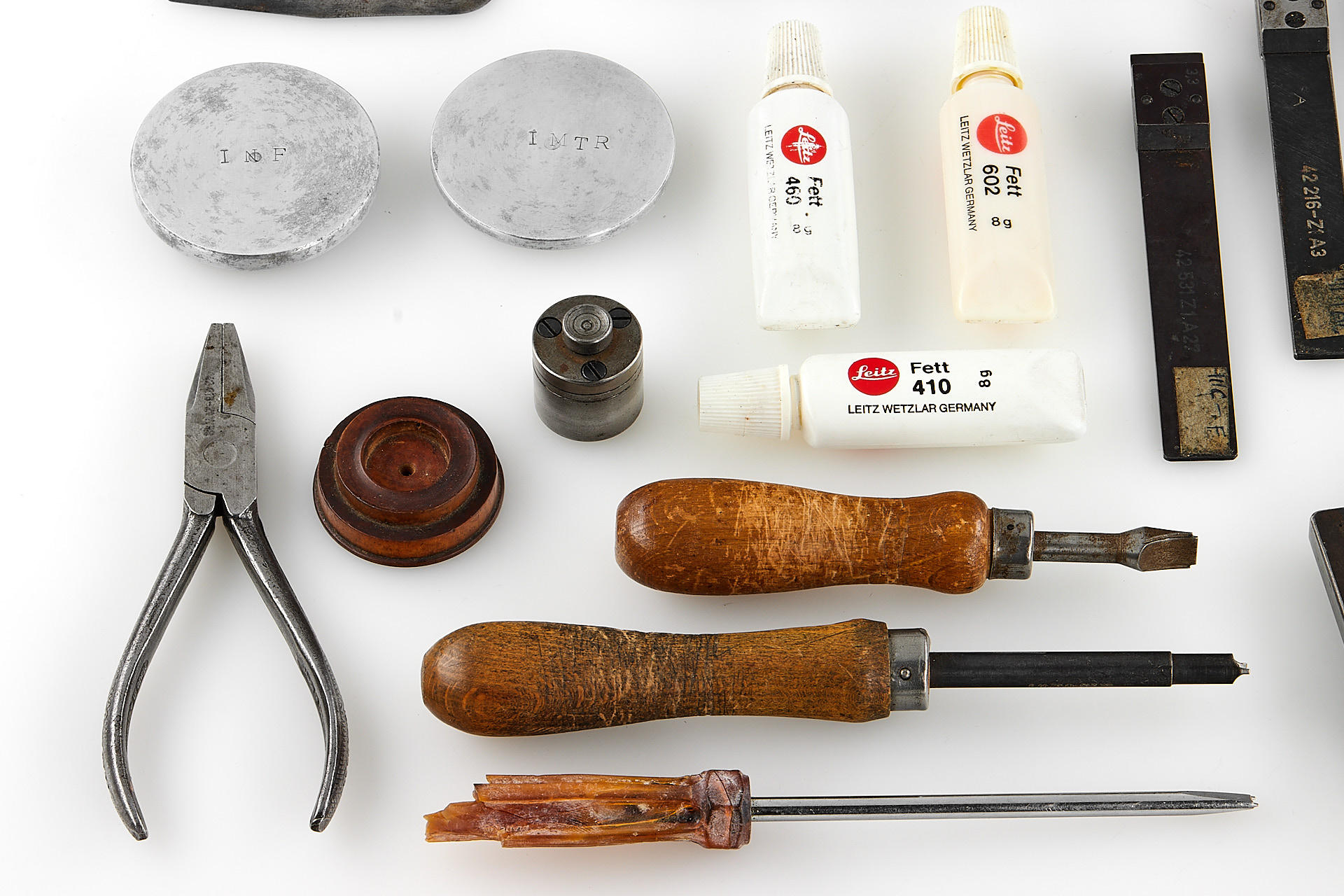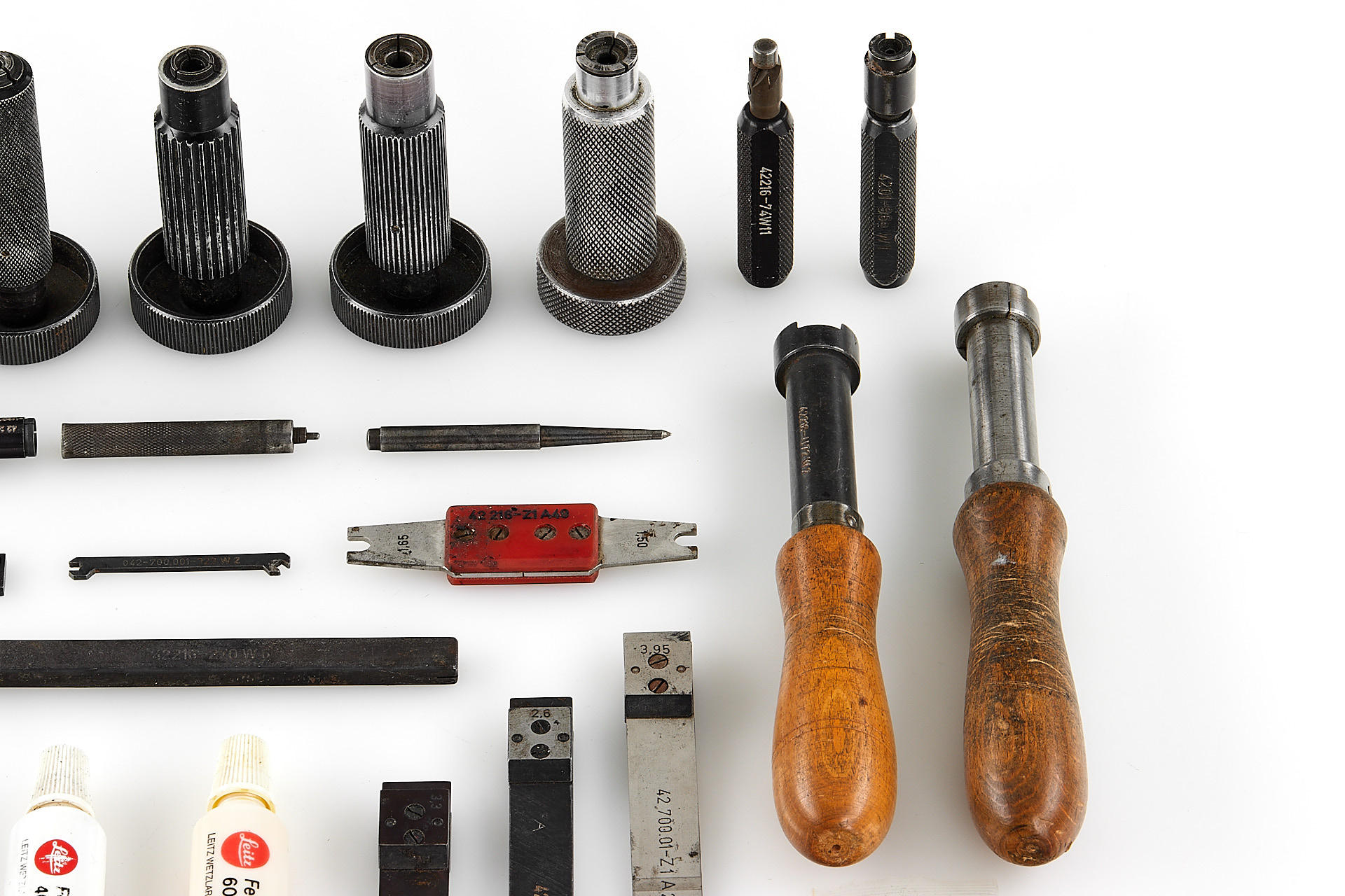 a set of over 30 original factory tools, used in production and maintenance of Screw-mount and M cameras, most of them marked with inventory codes, in a plastic box