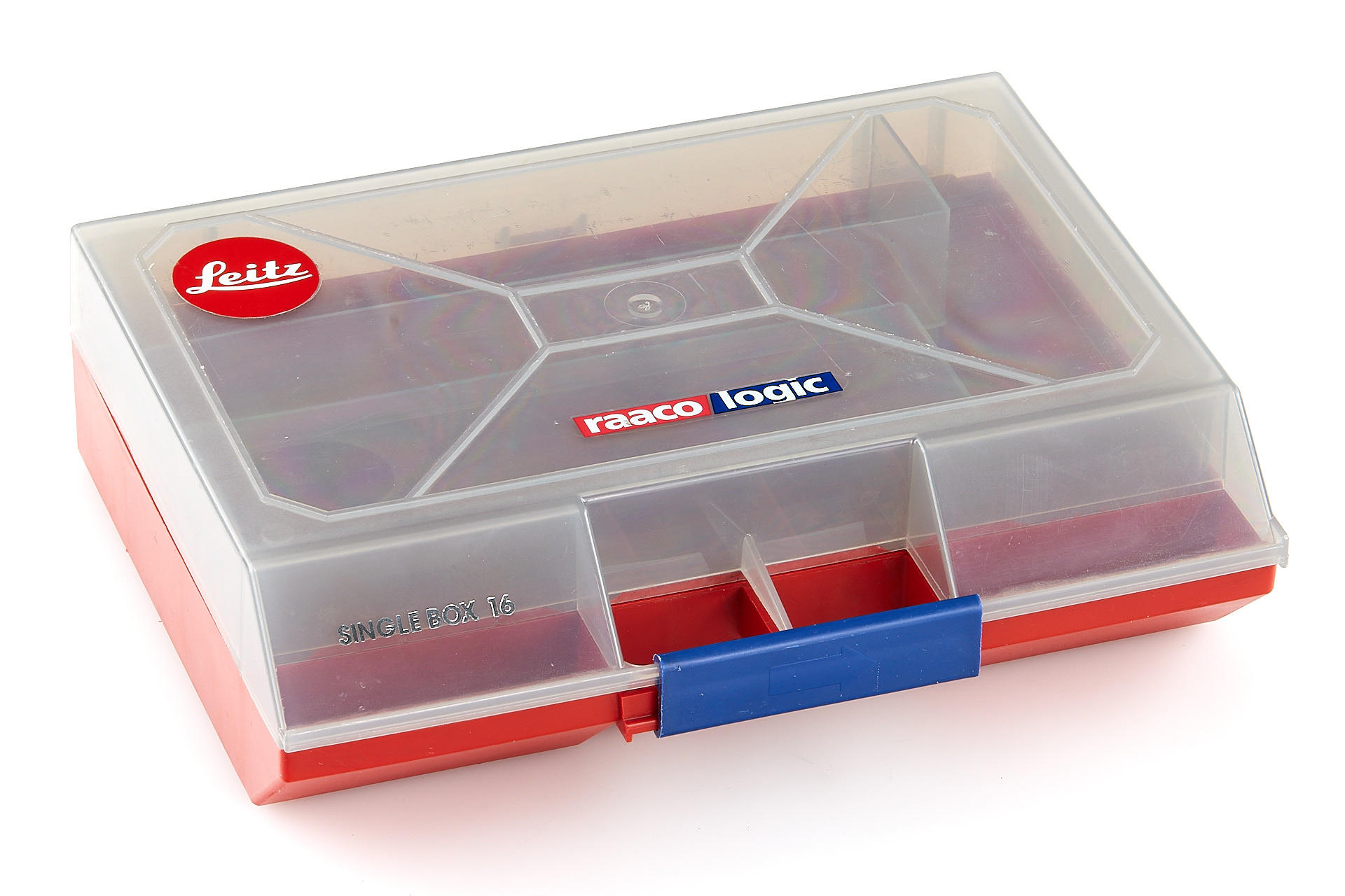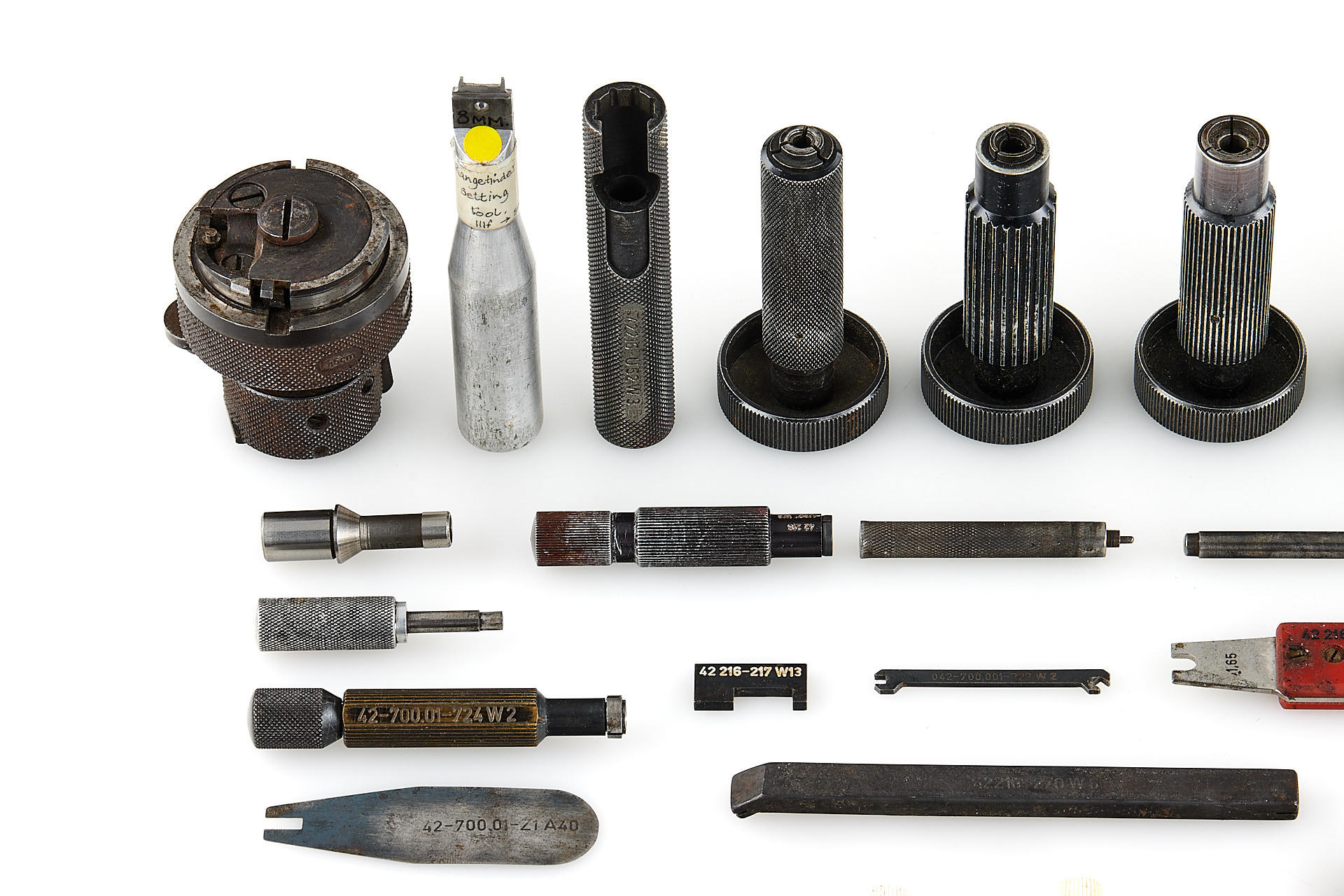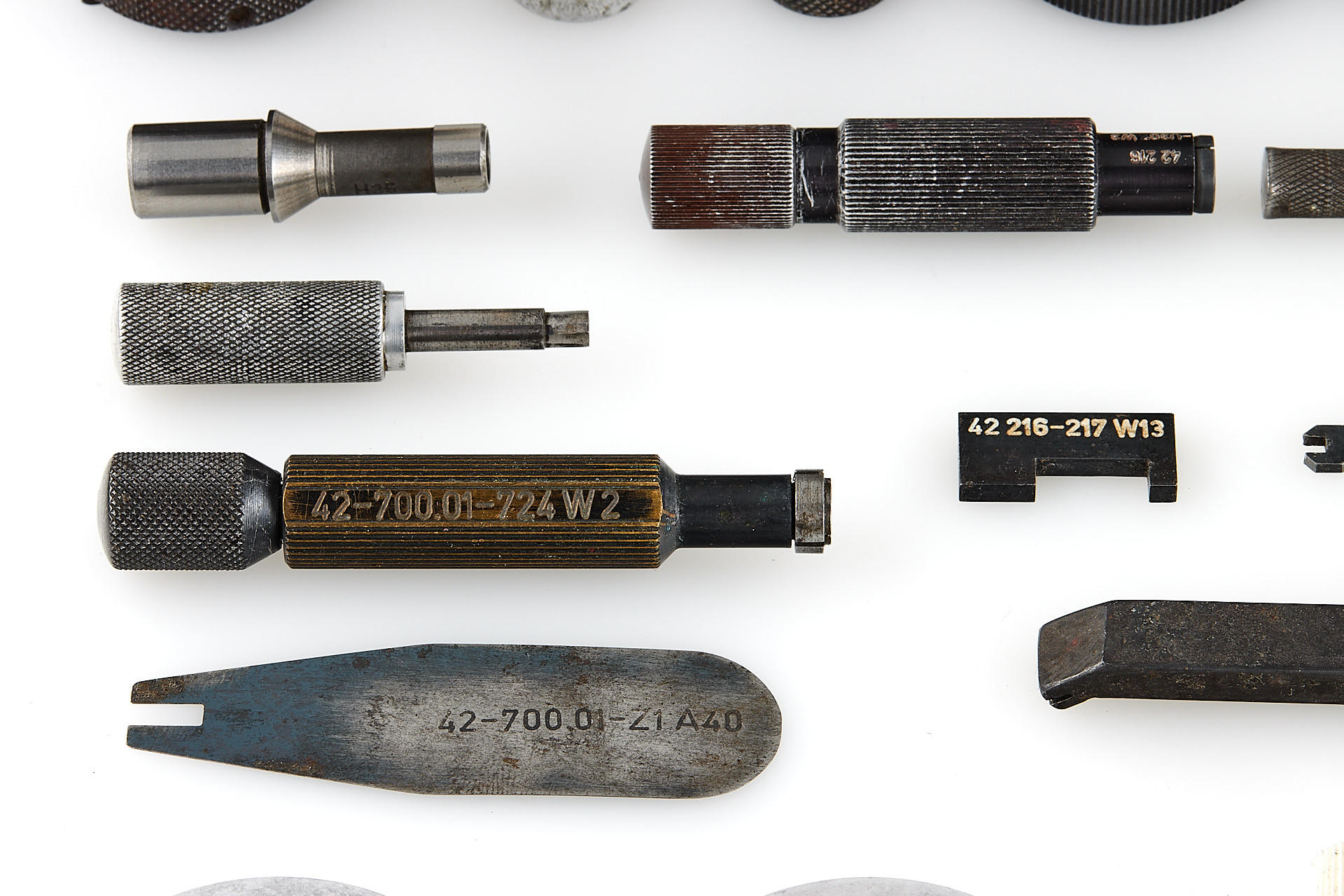 a set of over 30 original factory tools, used in production and maintenance of Screw-mount and M cameras, most of them marked with inventory codes, in a plastic box