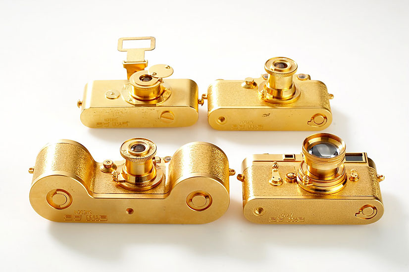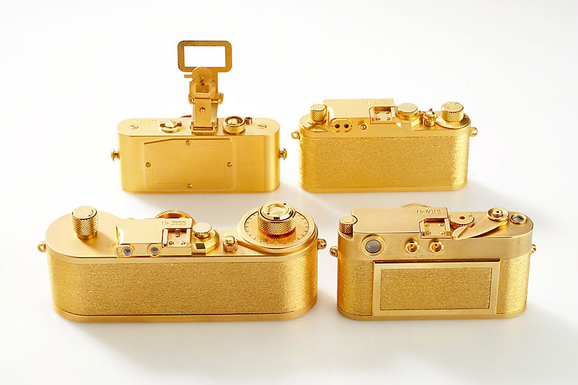 series of 4 replicas in scale 1:2 produced by Eurofoto in Sweden (Ur-Leica no.0555 with attached viewfinder, Leica 250 no.3555, Leica IIIf no.2555, Leica M3 no.4015)