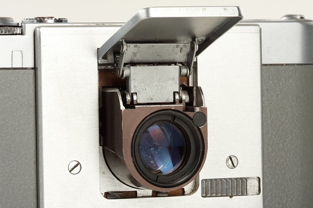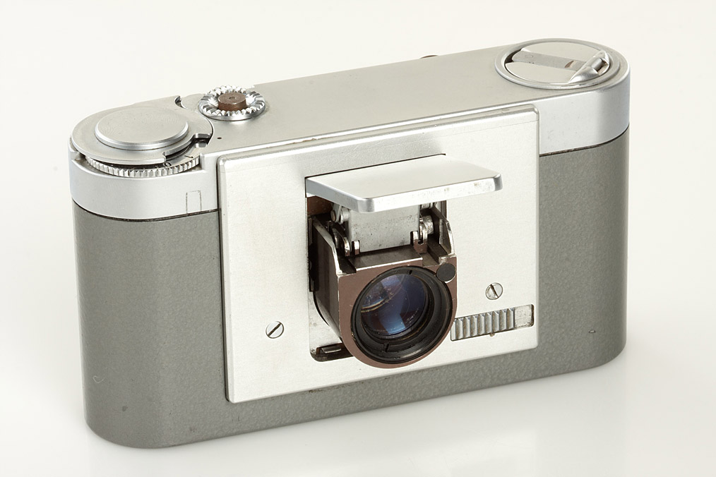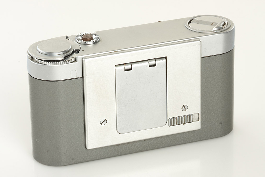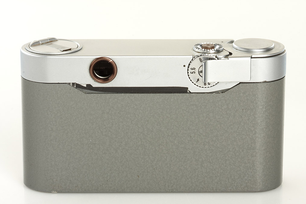 Genius design of a 18x24mm half-frame camera by Leitz developer Adam Wagner, the concept was to built a camera that was still smaller, more convenient to use and simpler to operate. For some reasons this forward-looking camera with slide-out lens feature was never put in production, only approx. 3 prototypes are known to exist, this particular camera comes from the Leitz Museum and is illustrated in Lager I page 142